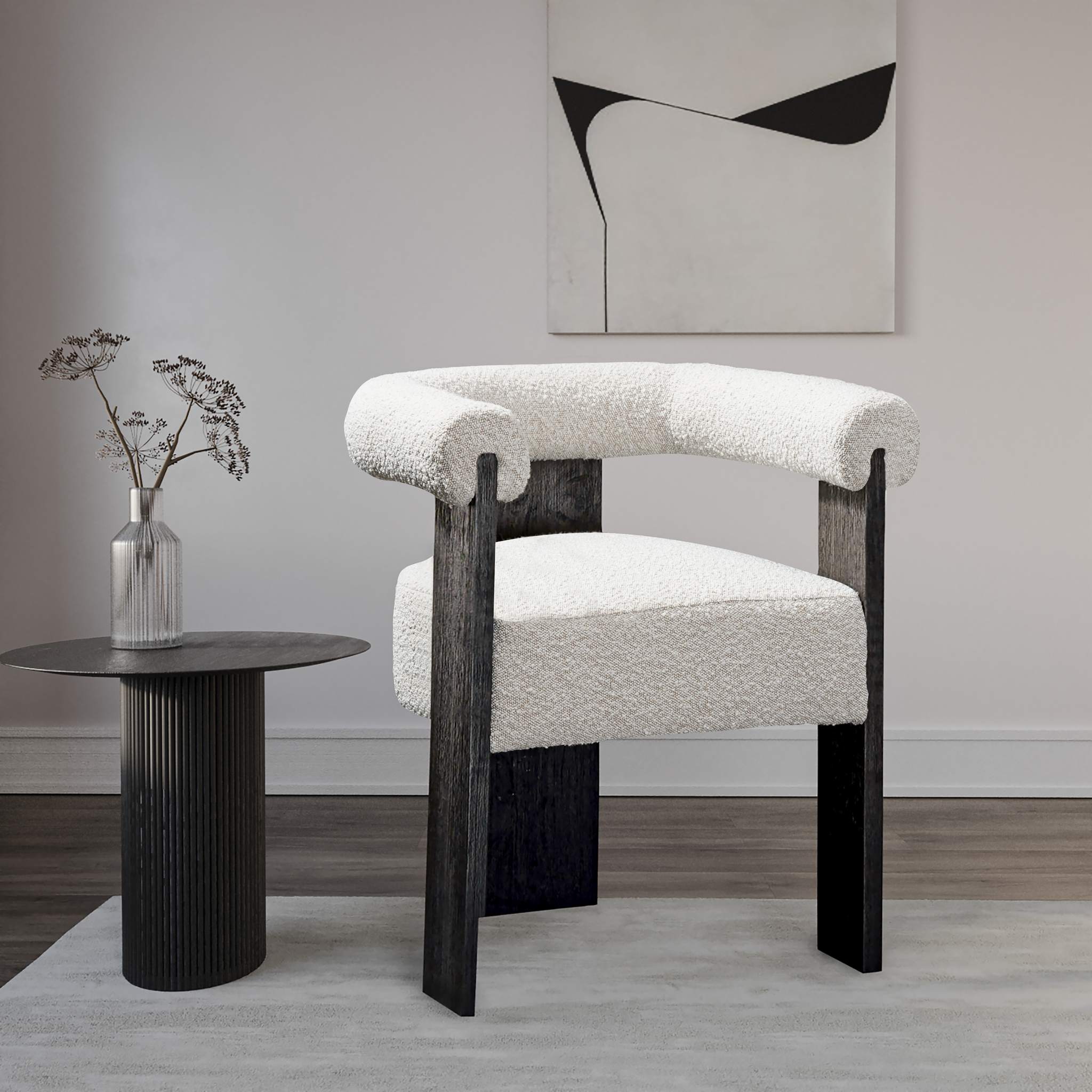 Prepare to fall in love with the elegant design of this Barrel dining chair. Designed to inject instant modern oomph into your space, this chair features a solid wood frame for sturdy durability and is outfitted with rich cream boucle fabric for a luxe finish. Pair this midcentury Barrel dining chair with a clear table to showcase its beauty from every angle and add a contemporary slant to your dining room group.