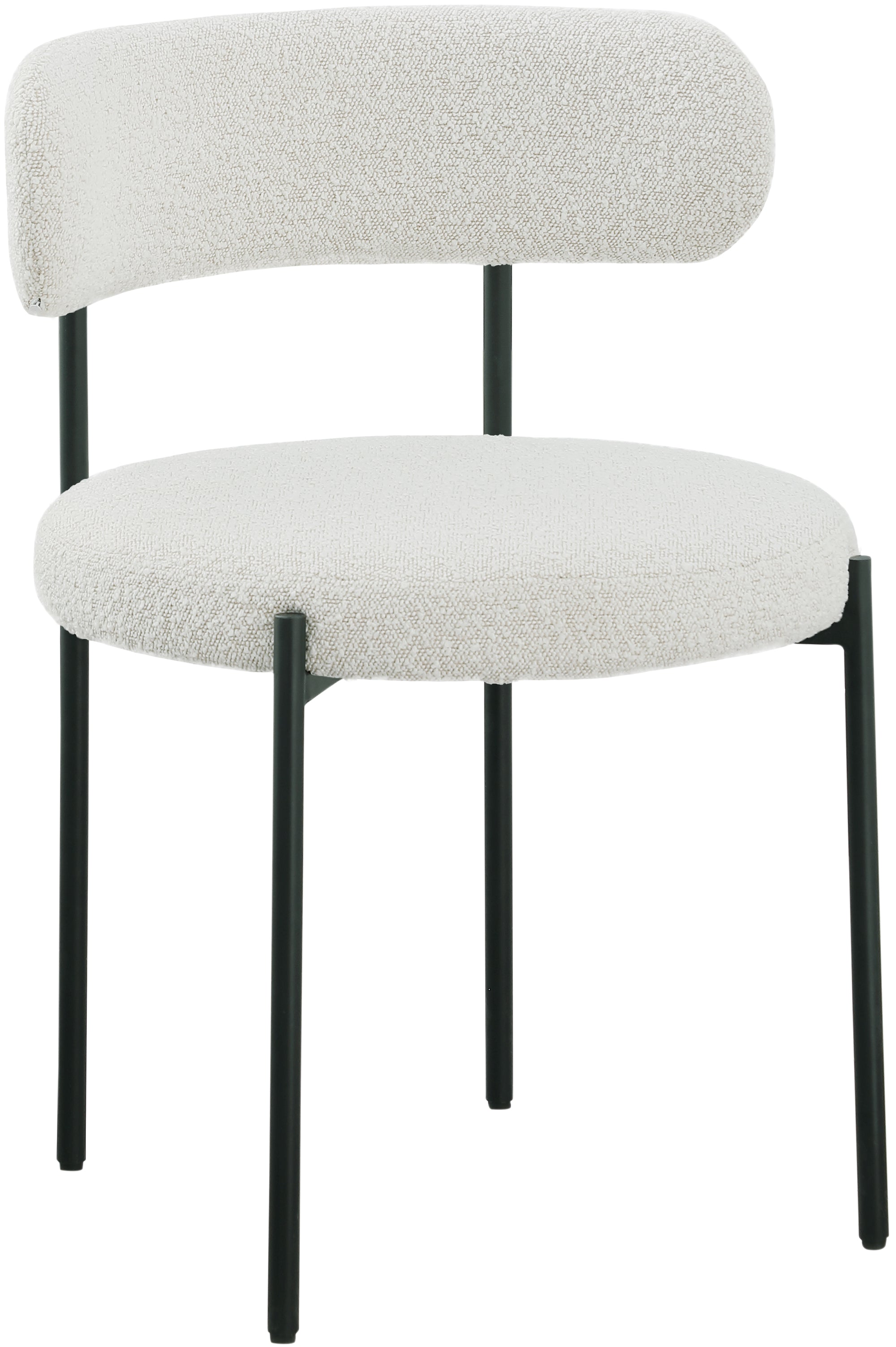 Liven up your dining area with this Beacon cream boucle fabric dining chair. Crafted from iron and boucle fabric, this chair is both sturdy and cozy. Its matte cream metal frame provides foundational support while its curved seat and backrest provide physical support for those who sit in it. Its rounded appearance gives it a contemporary look perfect for any modern living space. This chair is just the right height to kick back and enjoy your meal.