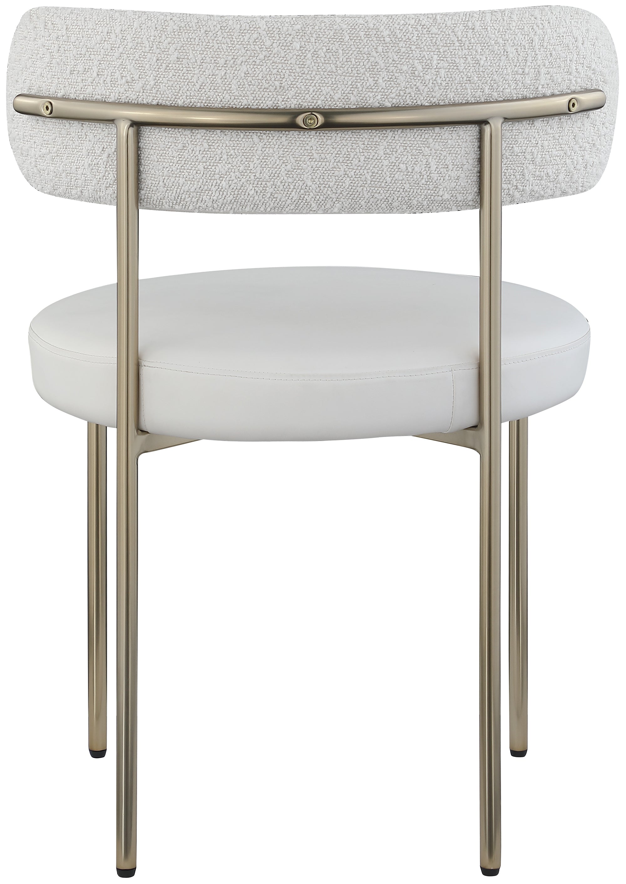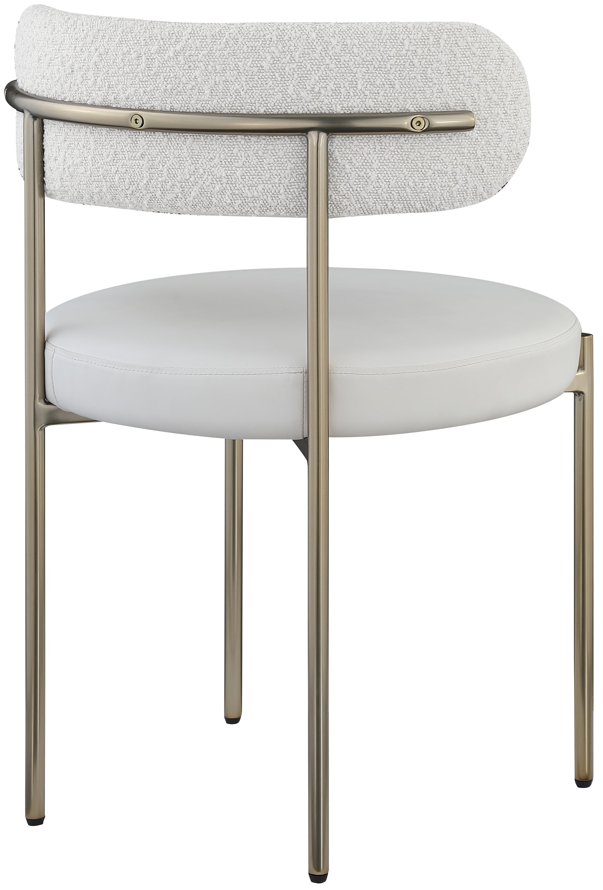 Give your dining room a modern boost with this Beacon vegan leather and boucle fabric dining chair. This pretty chair has the contemporary design elements you're looking for, from its curvy back to its thickly padded seat and brushed brass-finished metal frame. Cream vegan leather provides the look of the real thing without the maintenance requirements.