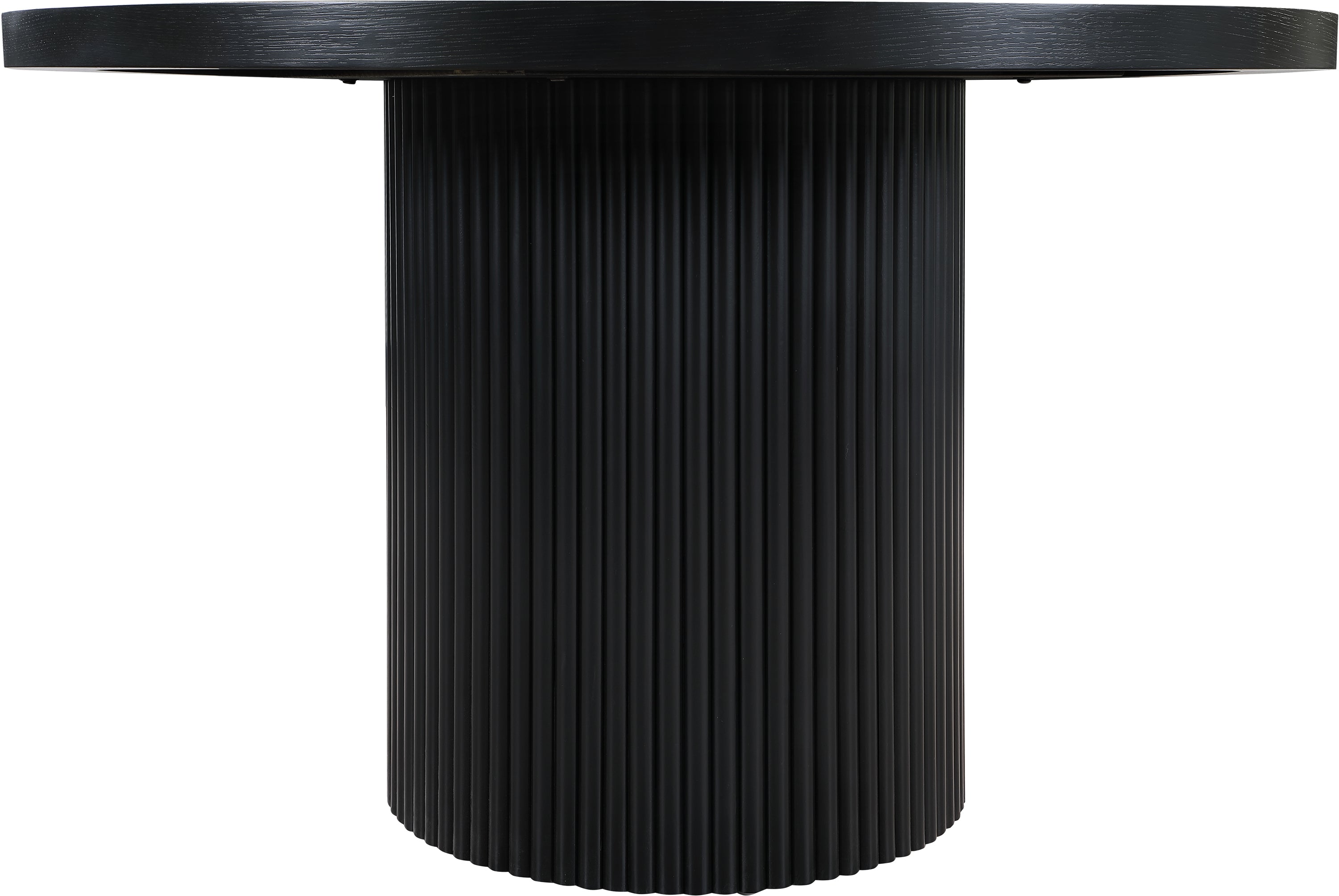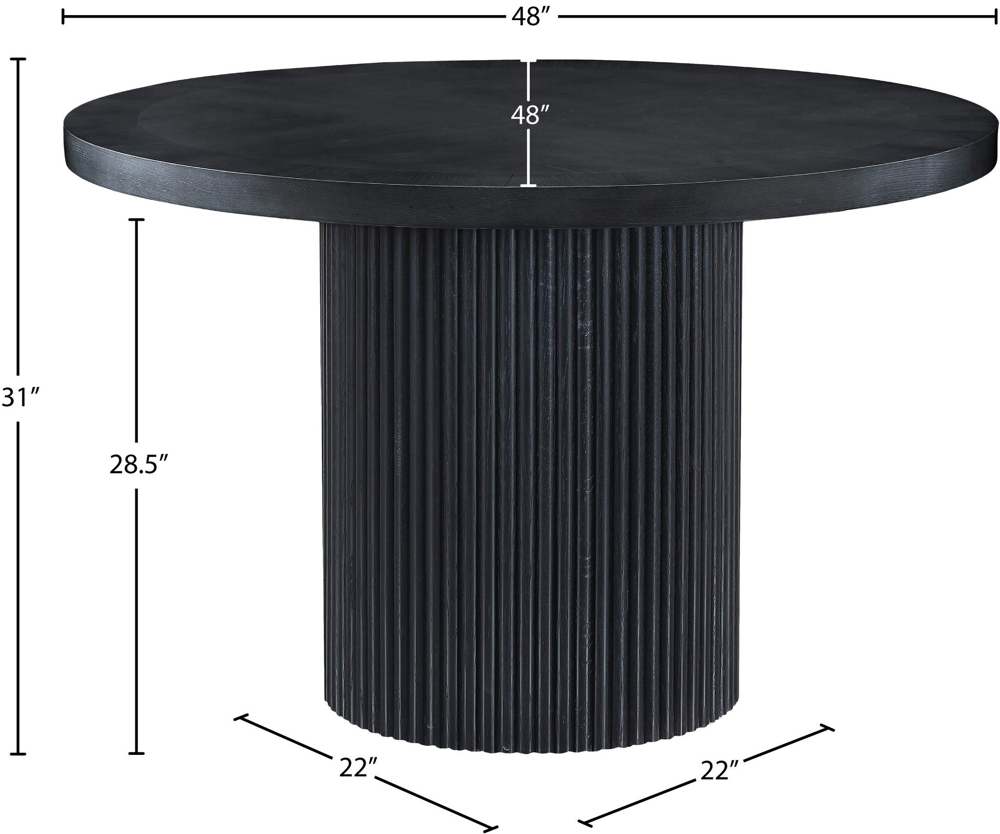 Give your dining room or eat-in kitchen a casual vibe with this Belinda dining table. A solid wood base and resilient construction offers impeccable durability and remarkable beauty. The round top rests on the fluted base, providing oodles of elbow room for family and friends to get comfortable while they nosh on their meal. The chair's made from wood and wood products for resilience, and its neutral black finish lets it mesh well with the dining chairs or stools of your choice.