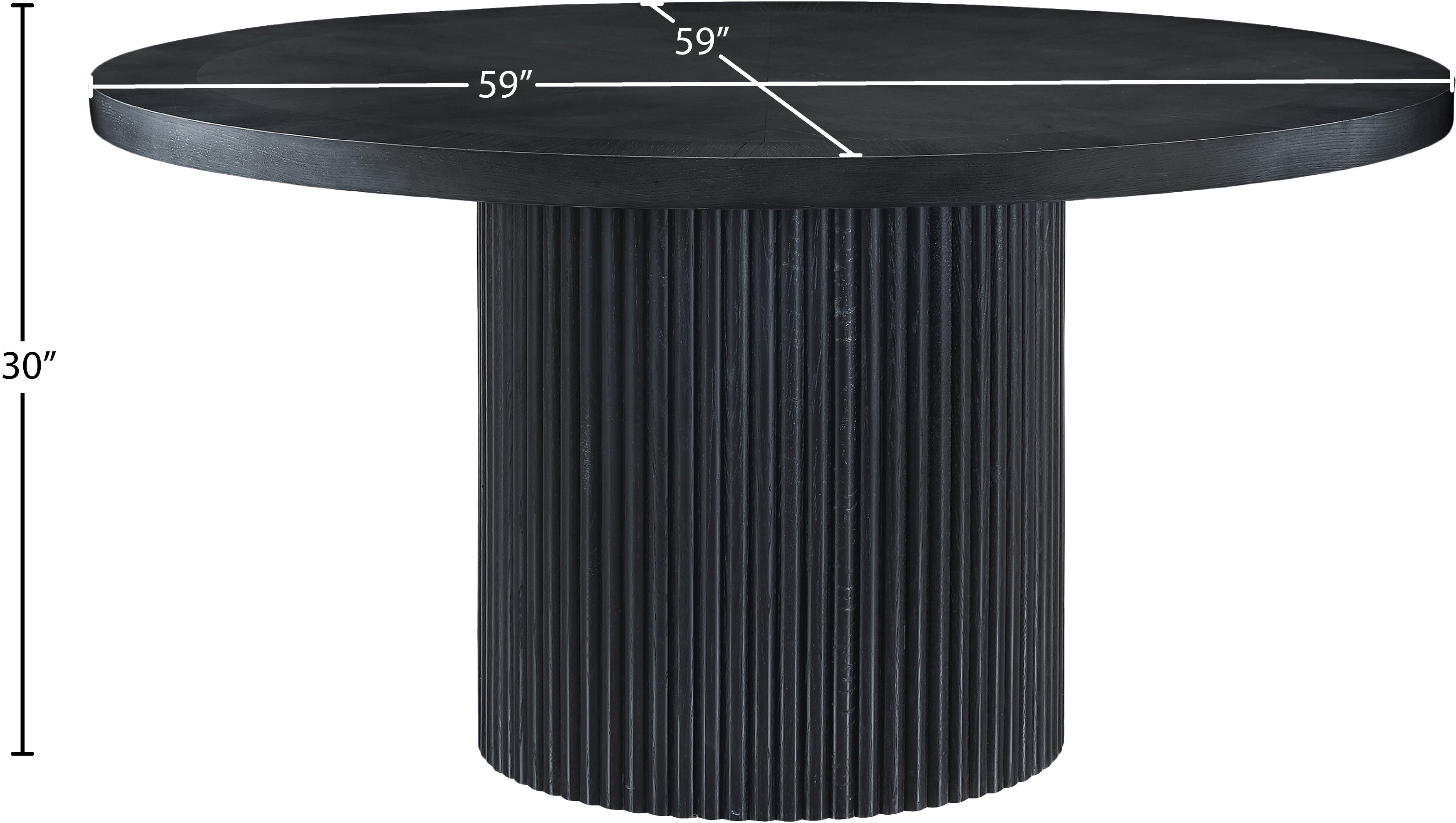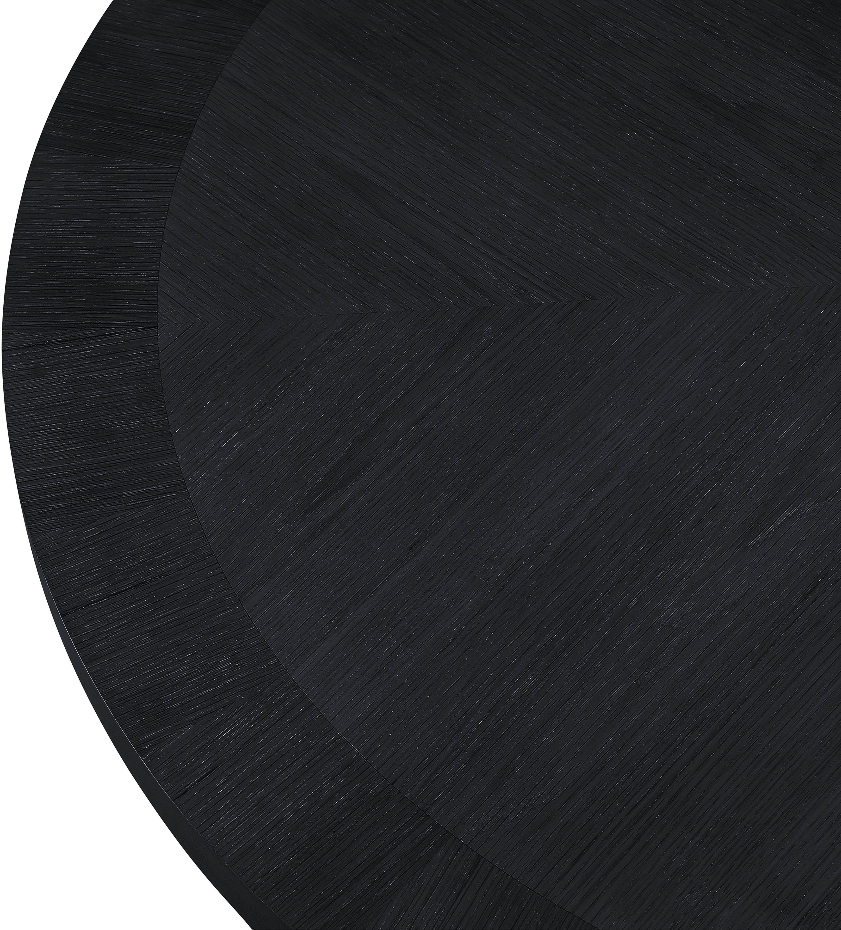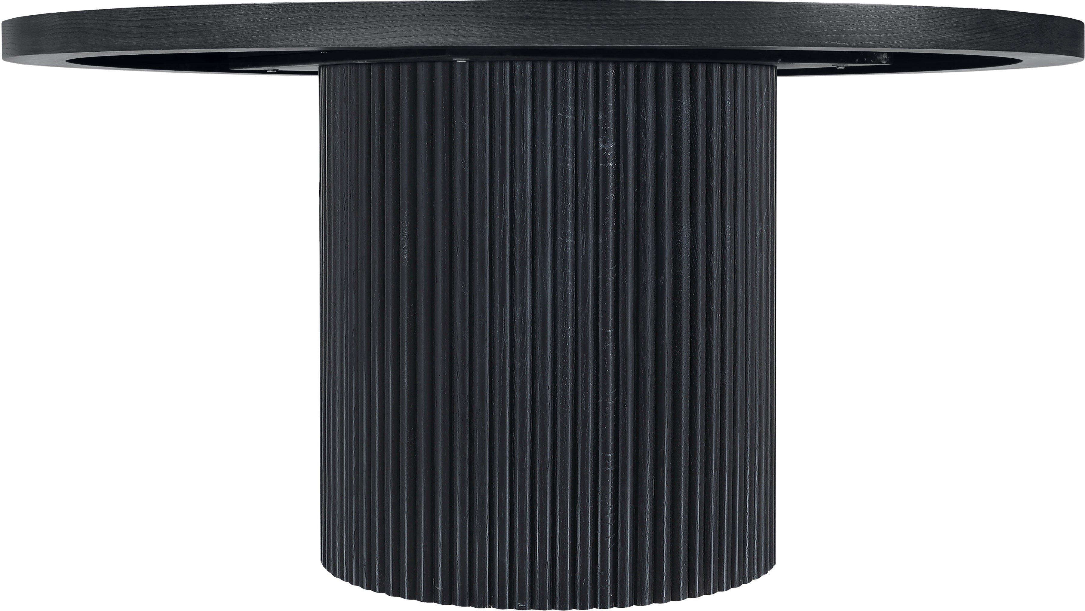 Even the smallest, most intimate dinner feels like an event when you're seated at this Belinda black dining table. Crafted with a solid wood base and a black finish oak wood veneer MDF top, its round top with fluted base exudes contemporary charm. The table top's thickness and natural wood grain variations add unique character, ensuring each piece is one-of-a-kind.