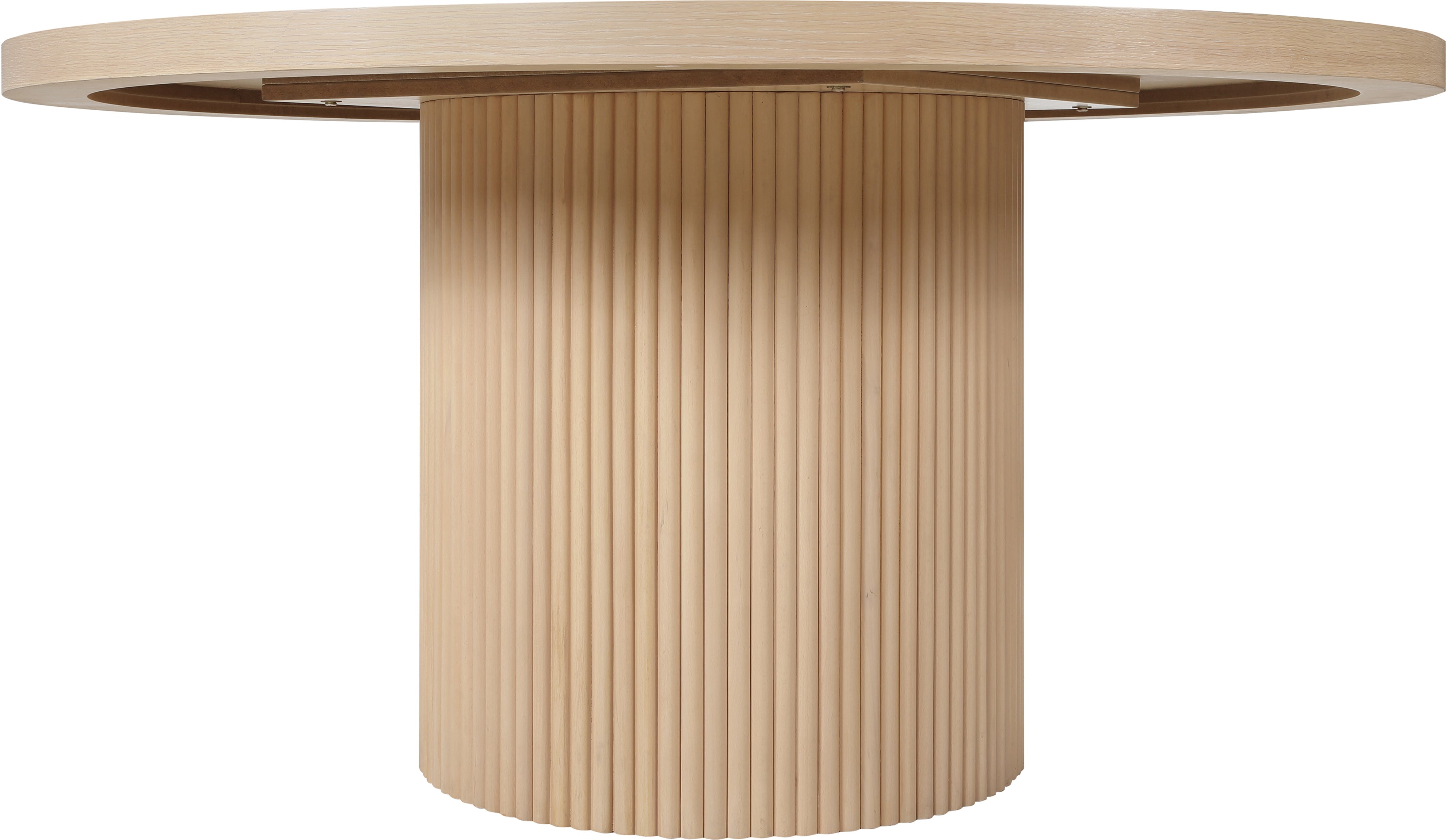 Even the smallest, most intimate dinner feels like an event when you're seated at this Belinda natural dining table. Crafted with a solid wood base and a natural finish oak wood veneer MDF top, its round top with fluted base exudes contemporary charm. The table top's thickness and natural wood grain variations add unique character, ensuring each piece is one-of-a-kind.