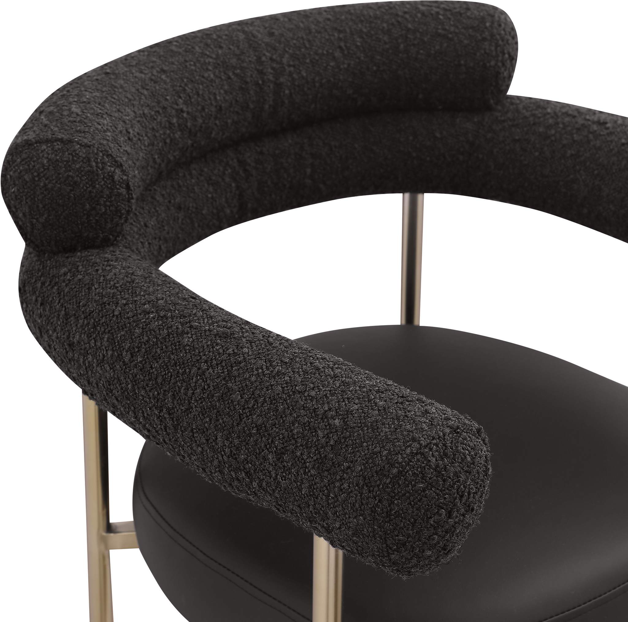 Chic is the word of the day when you give your kitchen counter or home bar a new look with this Blake black boucle fabric and vegan leather counter stool. A curved back ensures body-hugging comfort while sipping mimosas or chowing down on breakfast fare. The brushed brass iron metal frame provides reliable support for this counter height stool while the rich black boucle fabric upholstery and soft vegan leather padding ensure comfort for all who decide to take a meal (or have a snack) with you.