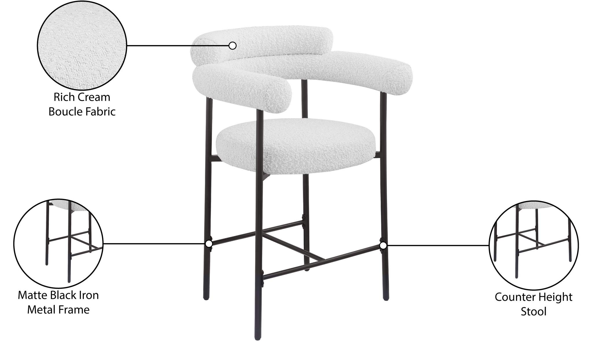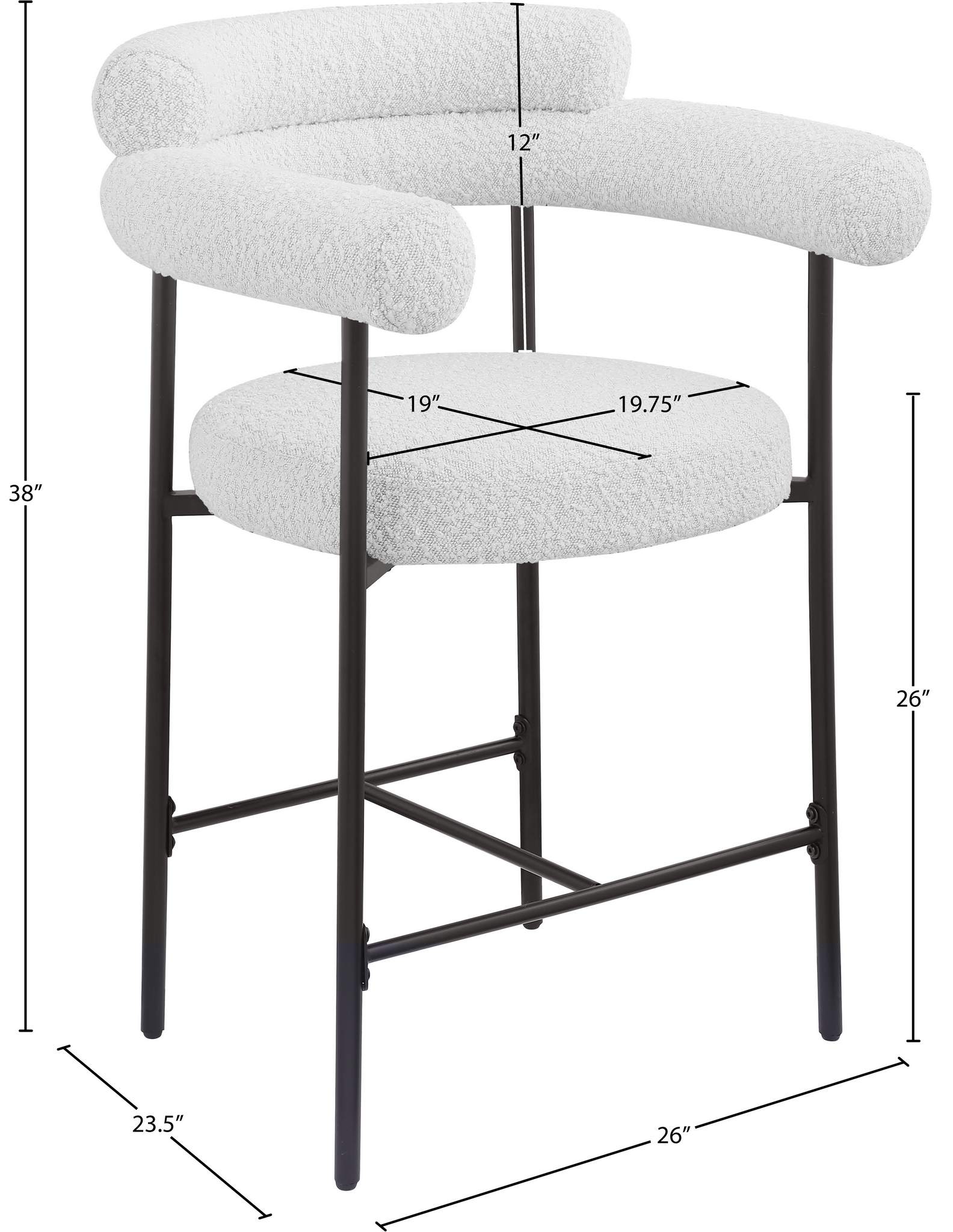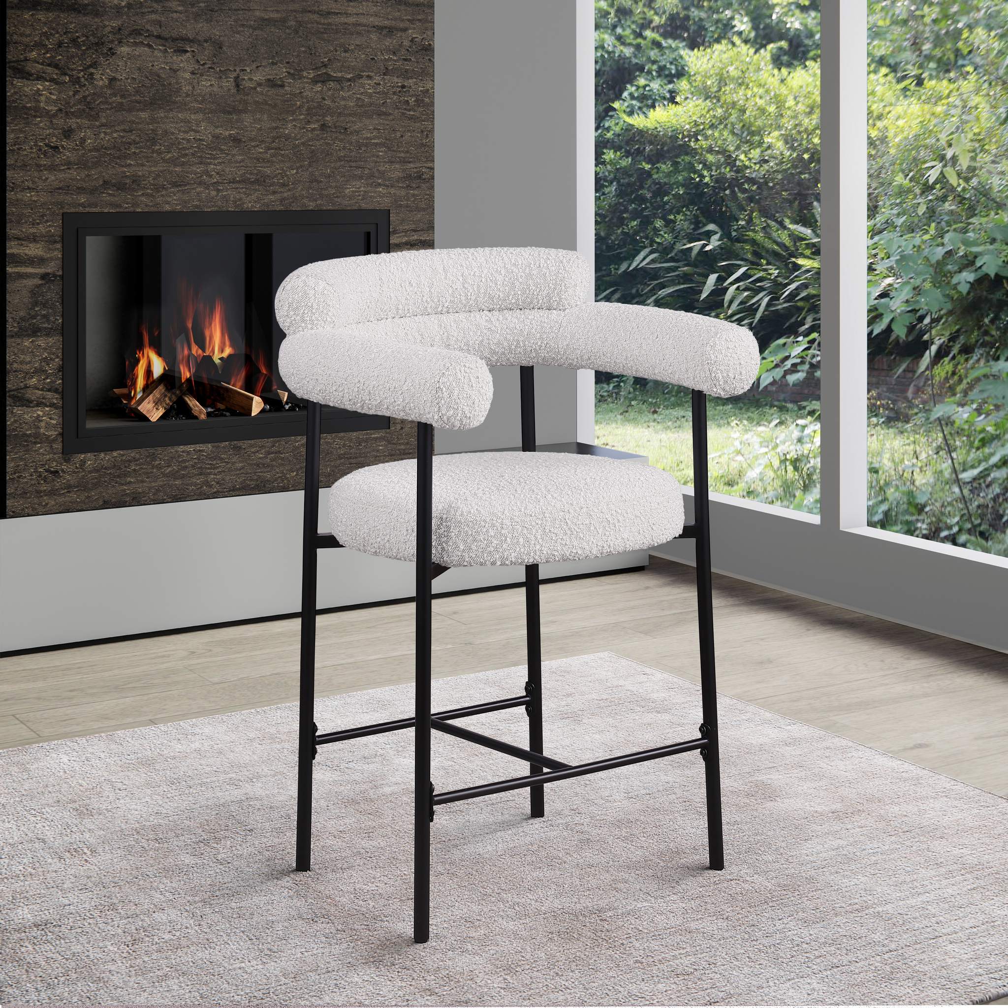 If what you crave is a home bar rescue or kitchen counter rehab, then this Blake counter stool in cream boucle fabric is a good place to start. This beautiful stool has the creature comforts you're looking for to keep guests happy and coming back for more, including a rounded back for structural body support and plump cushions that make sitting and chatting more comfortable. A black matte iron metal frame is sturdy and durable, while the rich cream boucle fabric adds a chic touch.