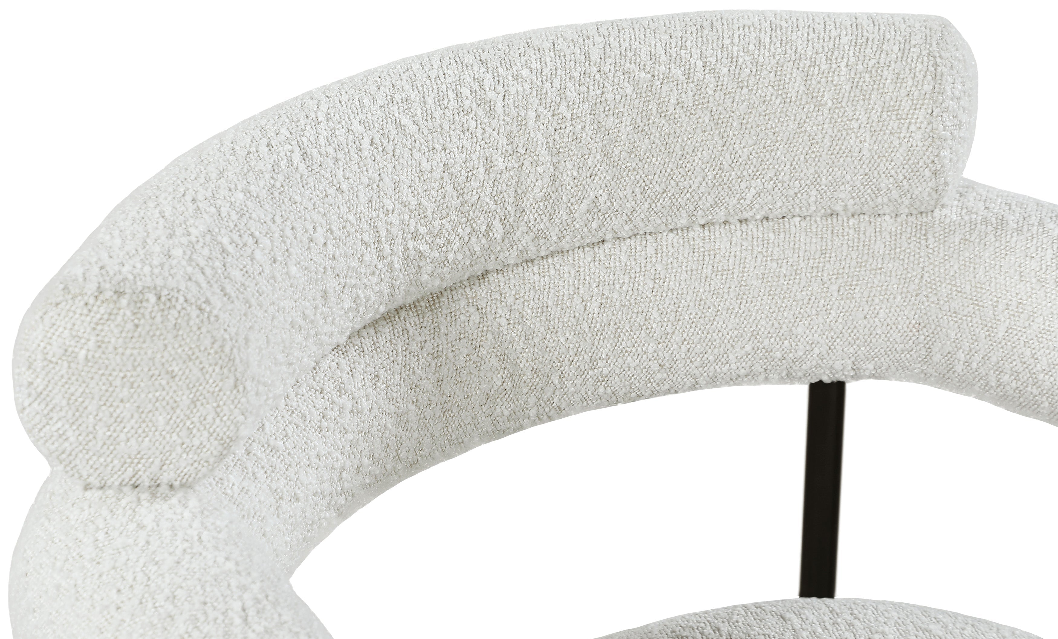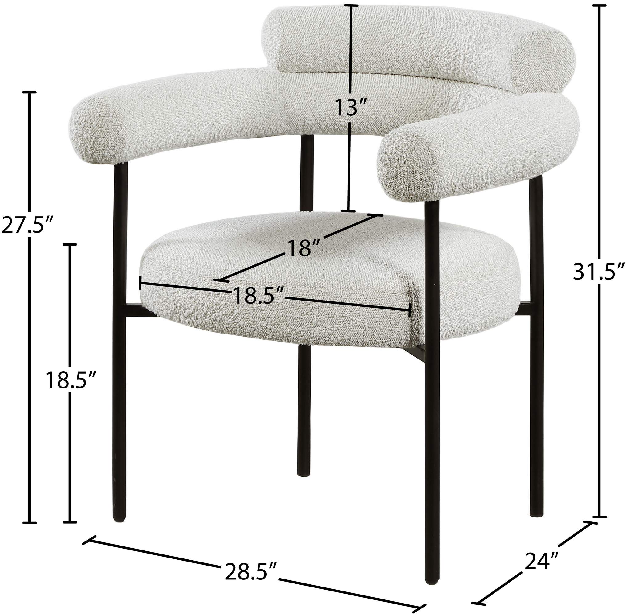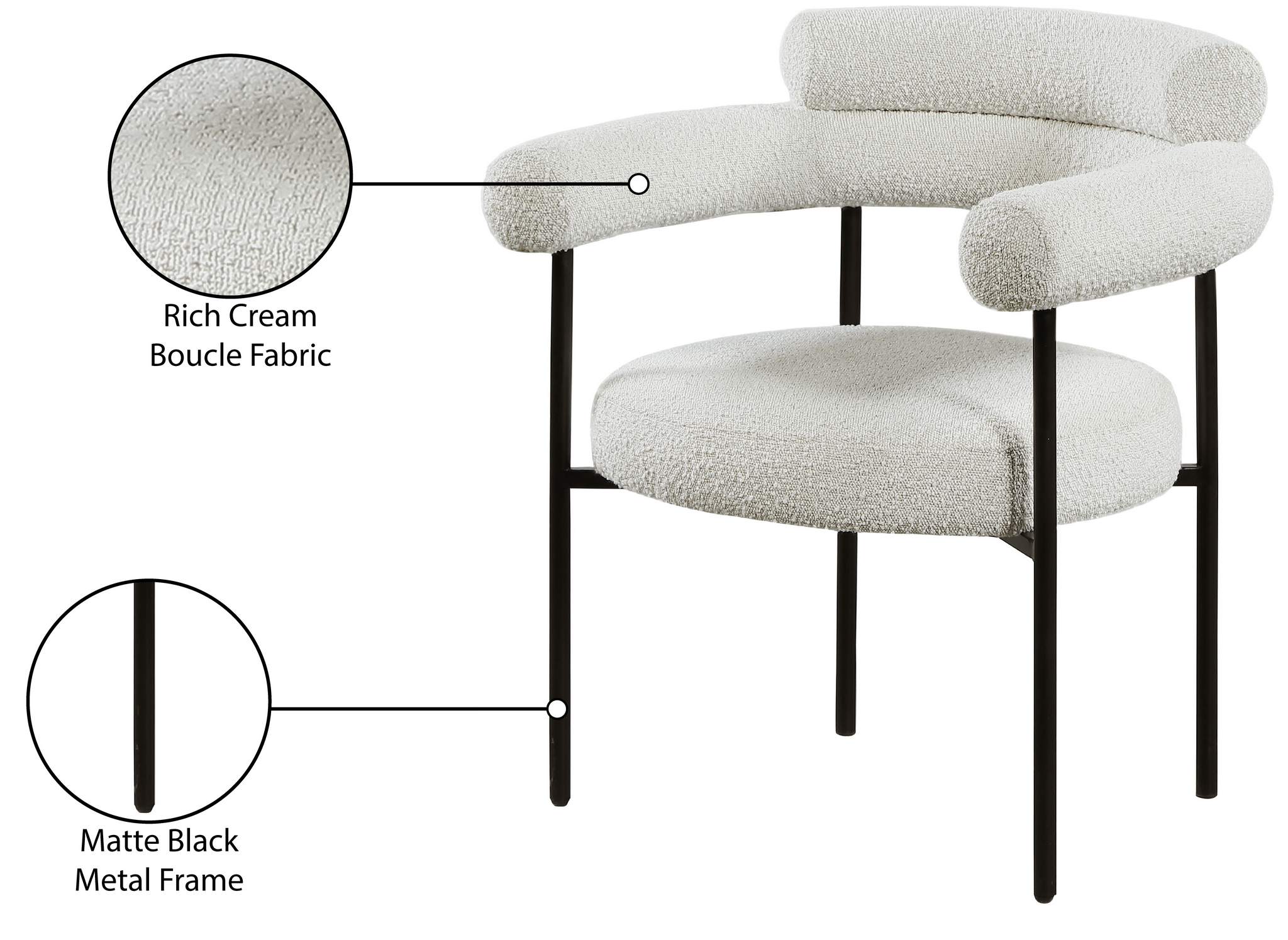 Modernize your dining space with these Blake cream boucle fabric dining chairs. This pair of contemporary dining chairs features rich black boucle fabric, making them comfortable to sit on. Their matte black metal frames provide sturdy support so you can relax knowing they'll seat you for years to come. Built to last, these chairs are strong enough for most users. Pair these pretty chairs with your choice of dining table for a custom look.