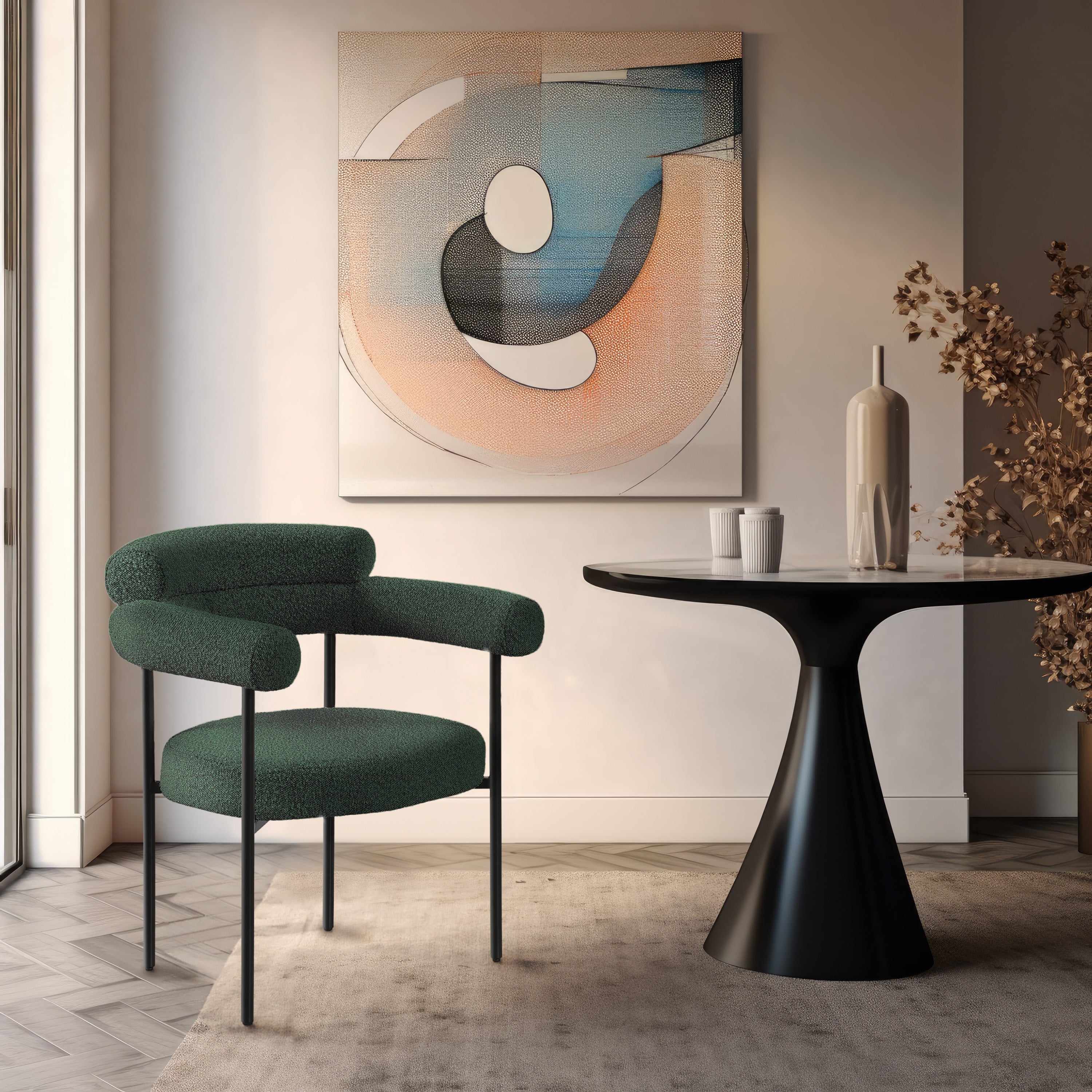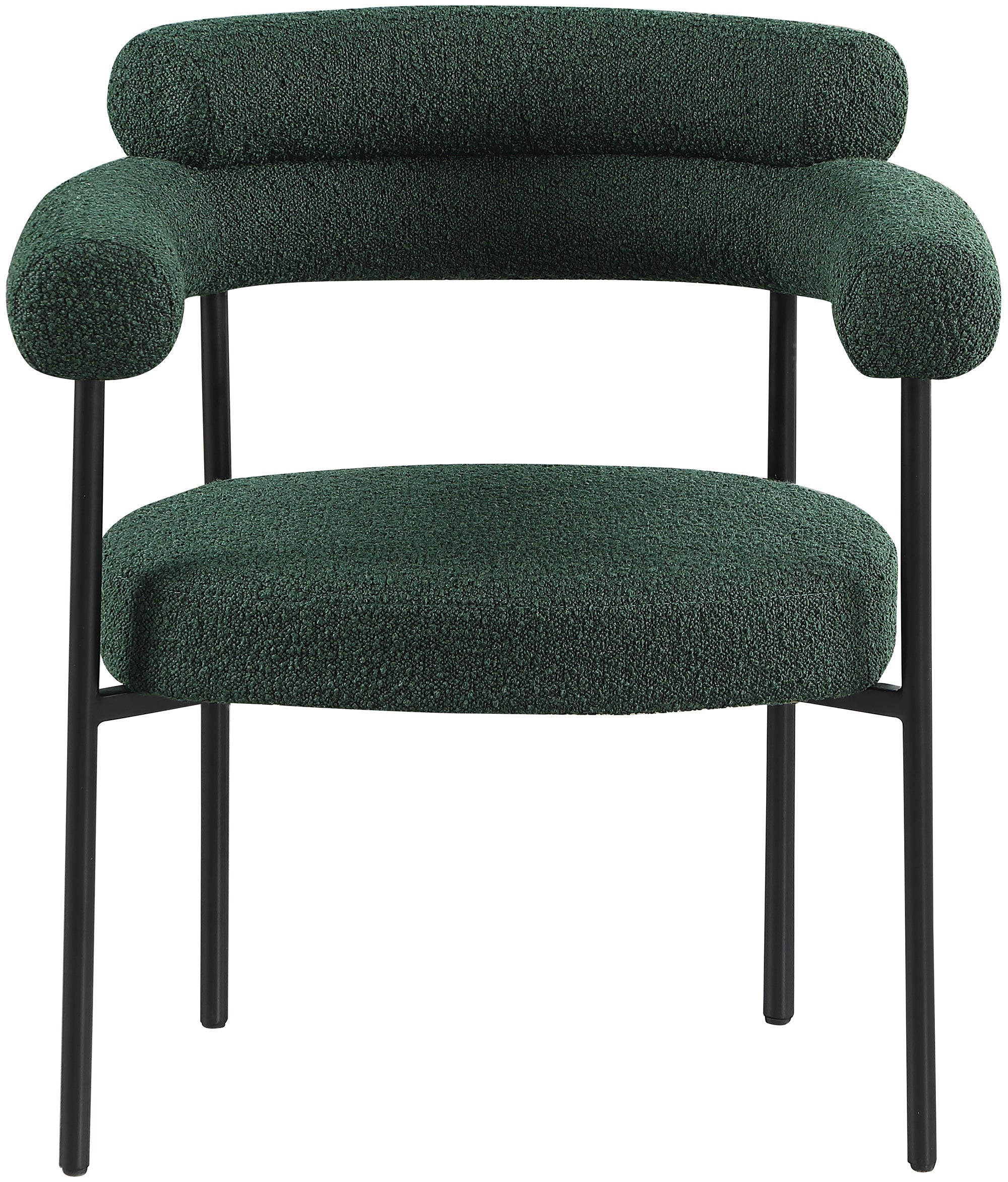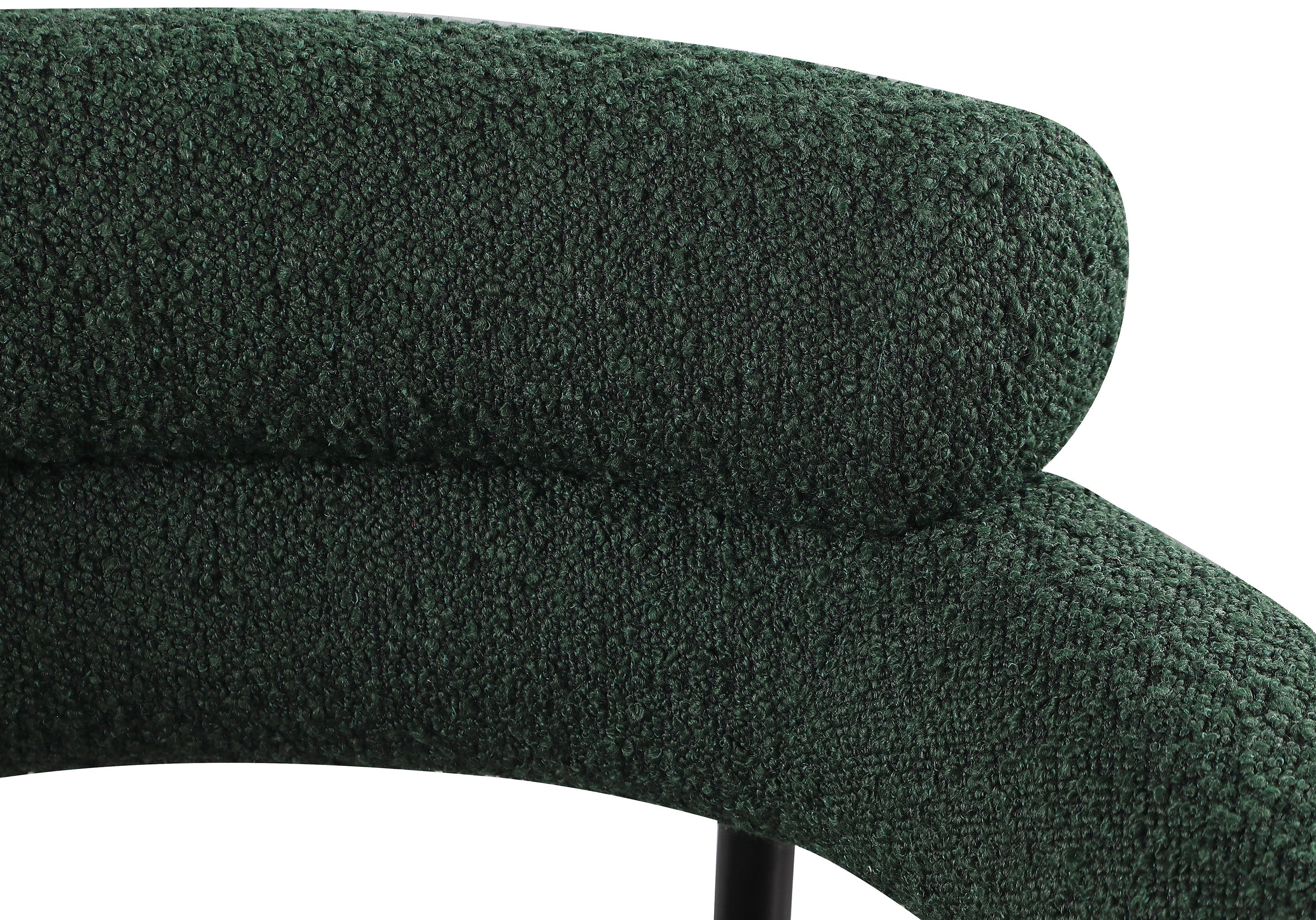 Modernize your dining space with these Blake green boucle fabric dining chairs. This pair of contemporary dining chairs features rich black boucle fabric, making them comfortable to sit on. Their matte black metal frames provide sturdy support so you can relax knowing they'll seat you for years to come. Built to last, these chairs are strong enough for most users. Pair these pretty chairs with your choice of dining table for a custom look.