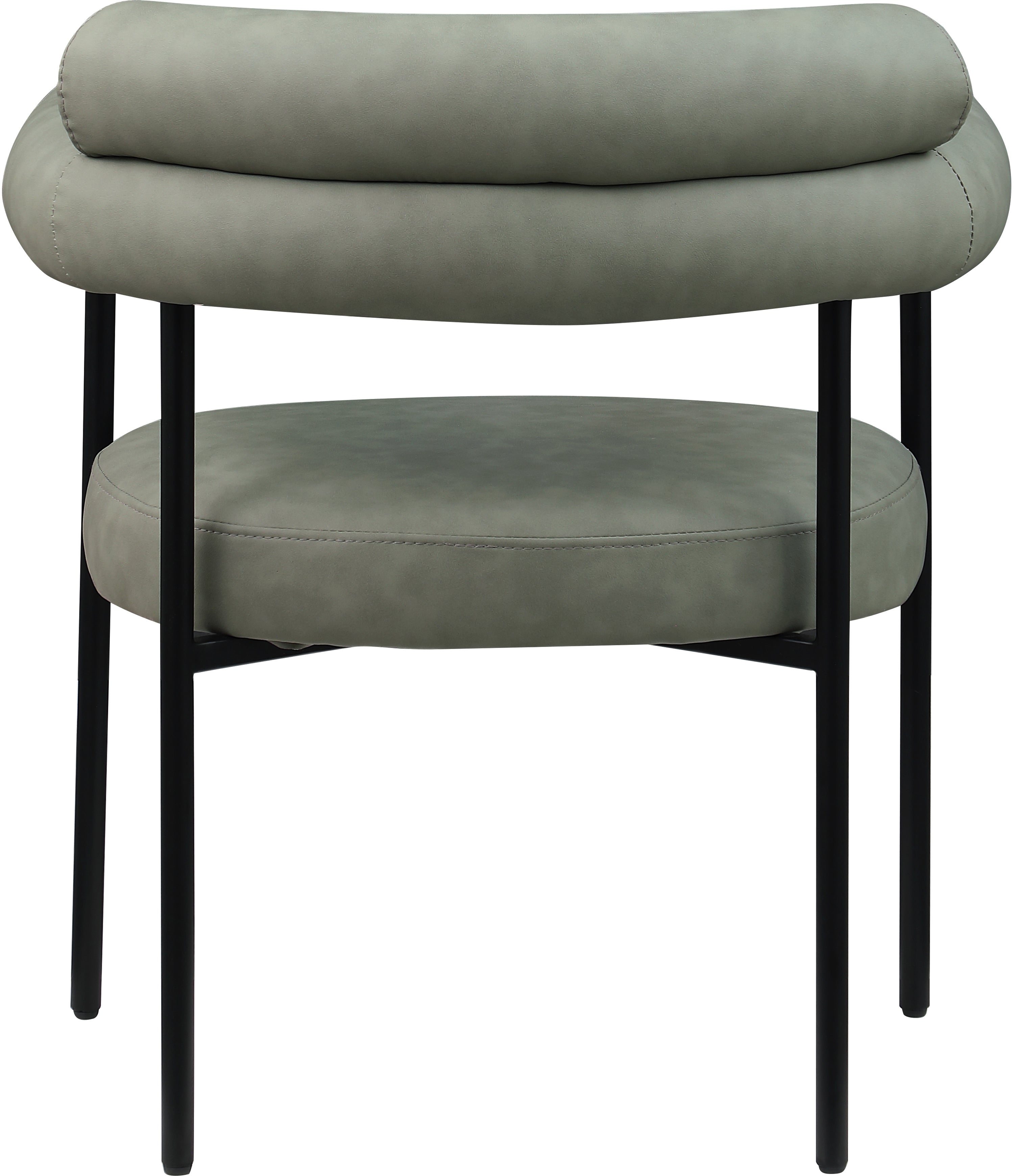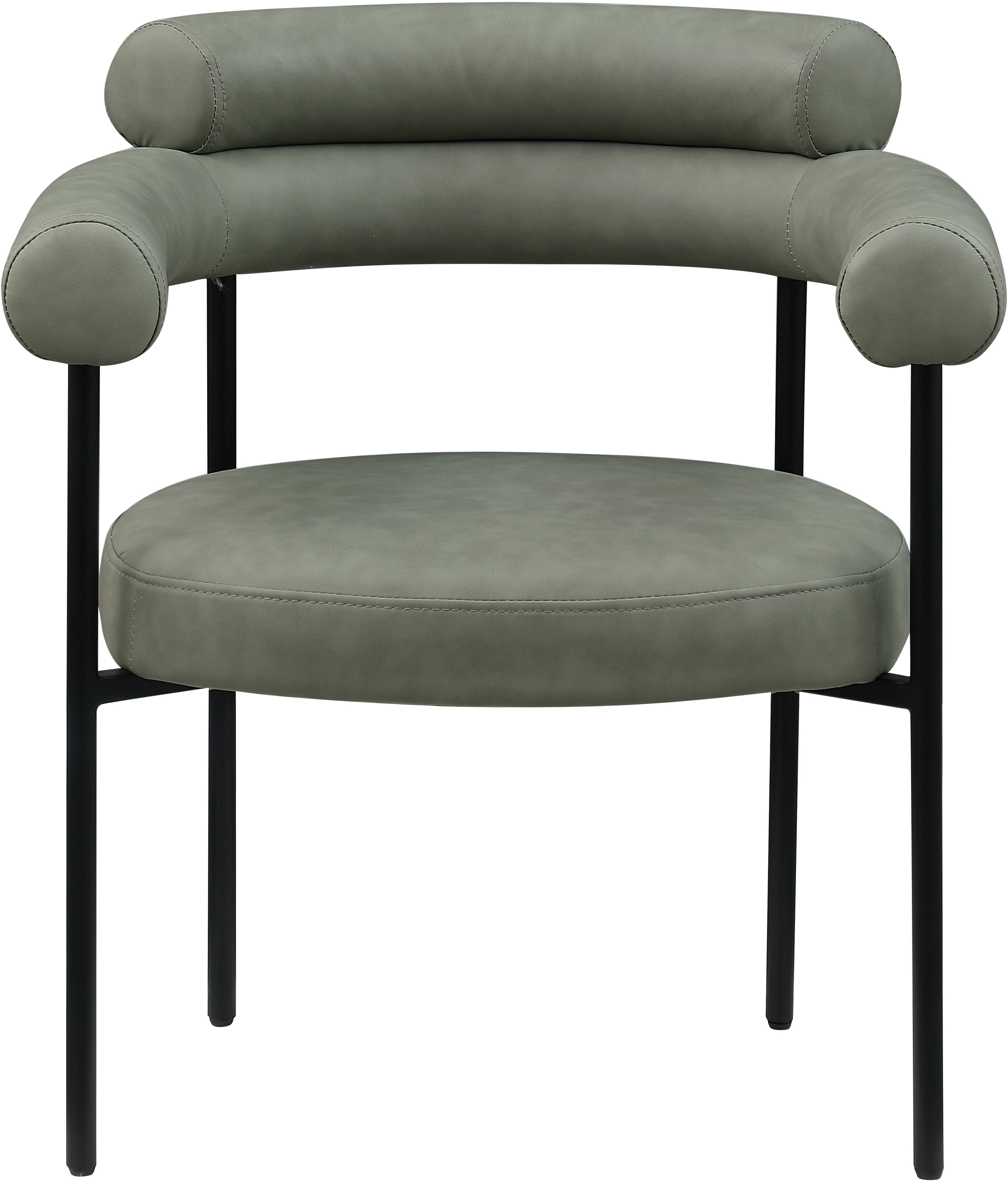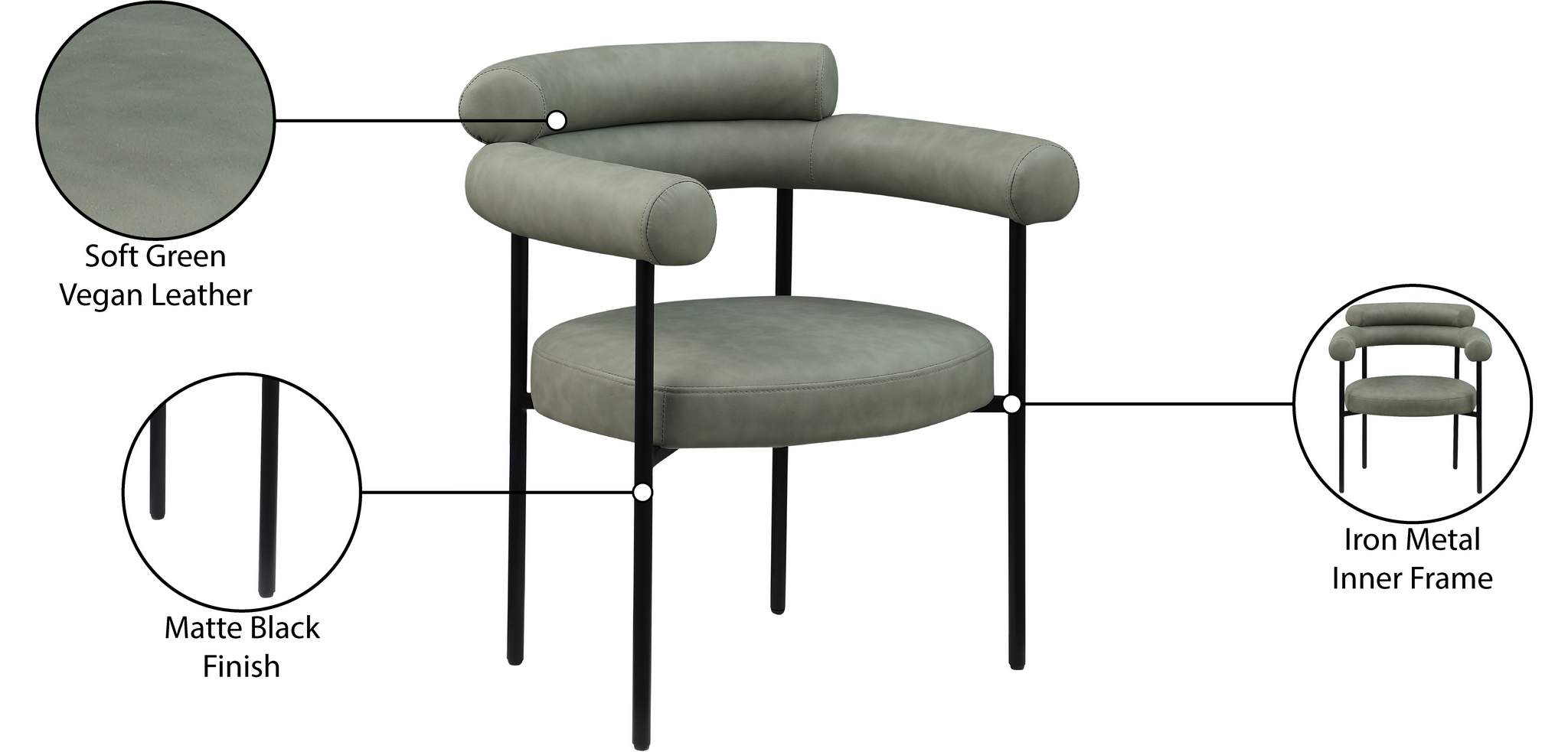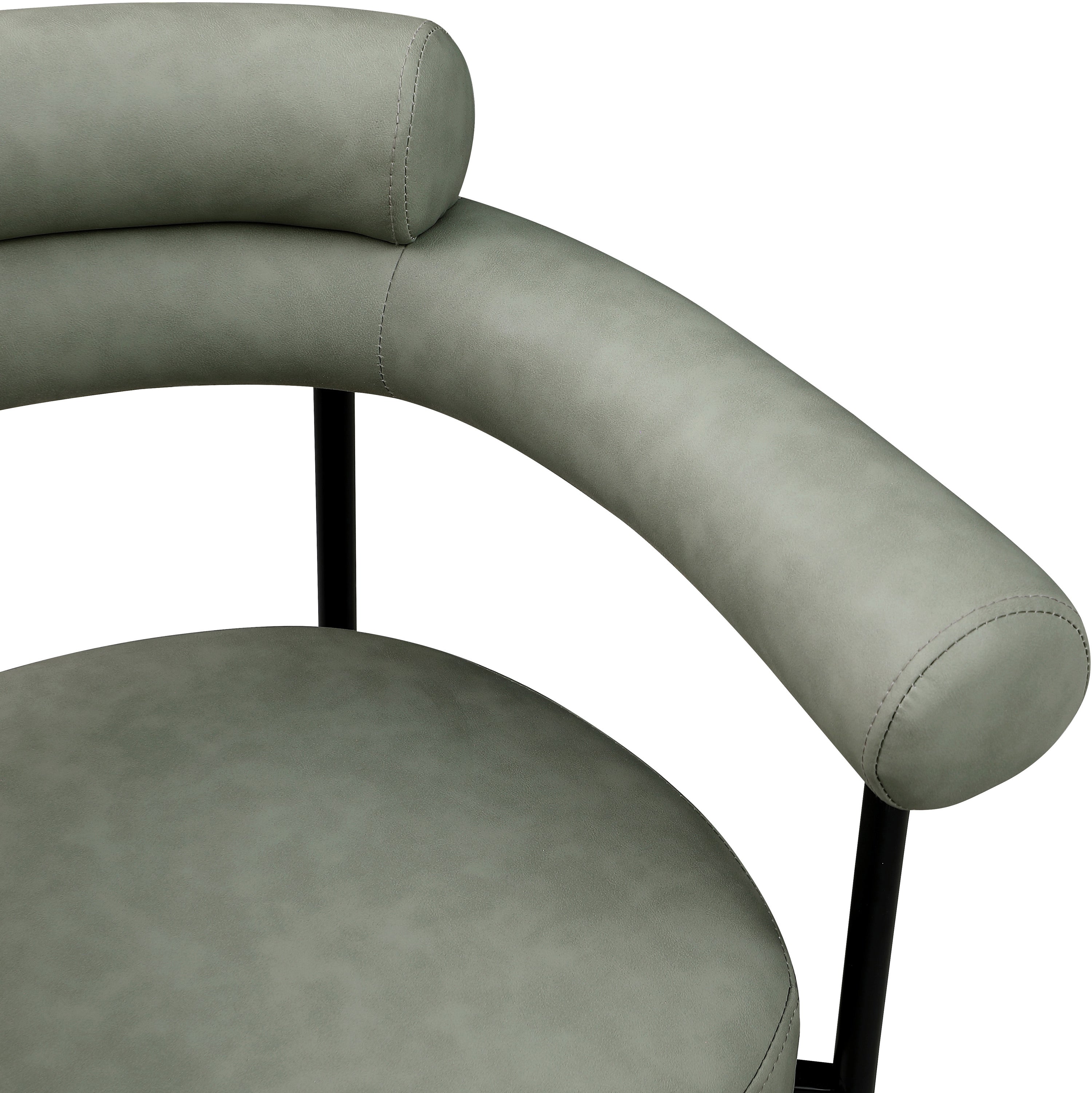 A back-hugging feel ensures this Blake green vegan leather diner chair quickly becomes your home's most coveted seat. Upholstered on the curved seat back and cushion with soft green vegan leather, this chair keeps guests comfortable from the start of the meal to its finish. An iron metal frame ensures sturdy support for guests, while the contemporary design makes it an easy fit with the table of your choice.