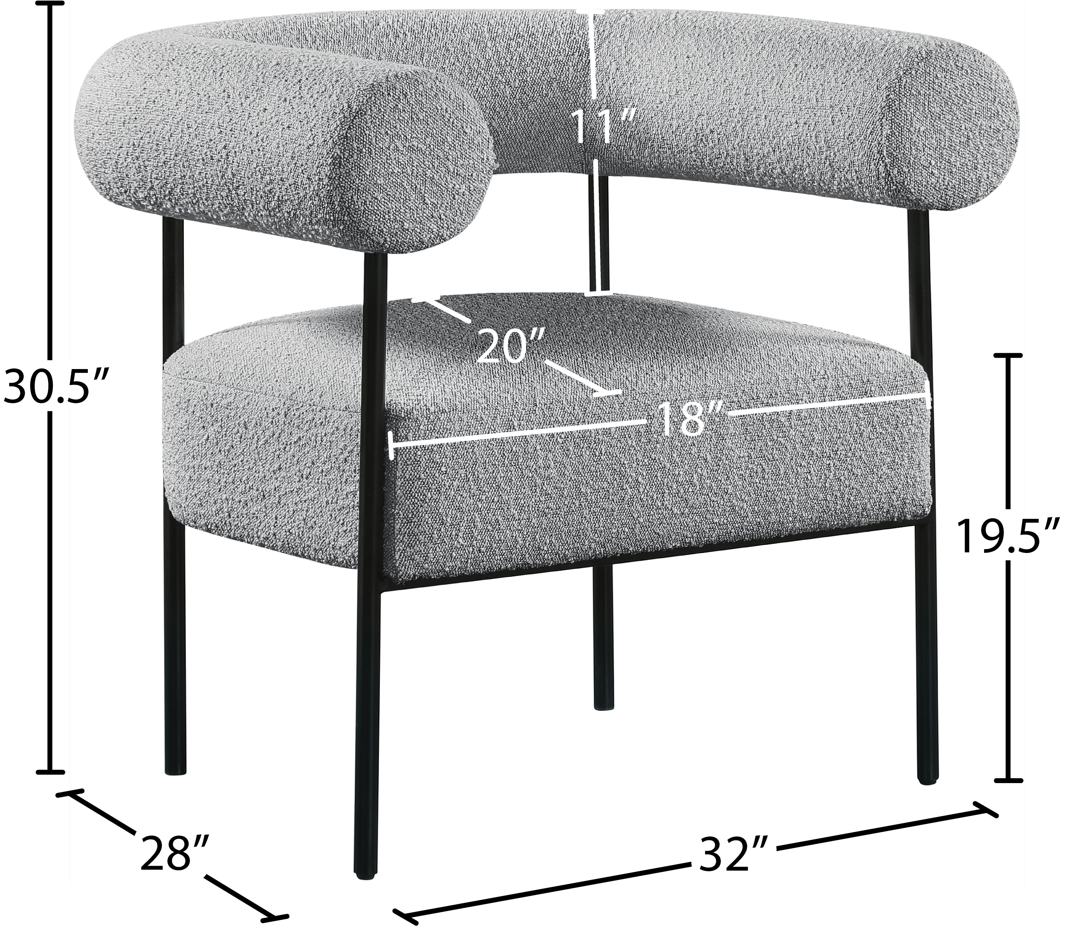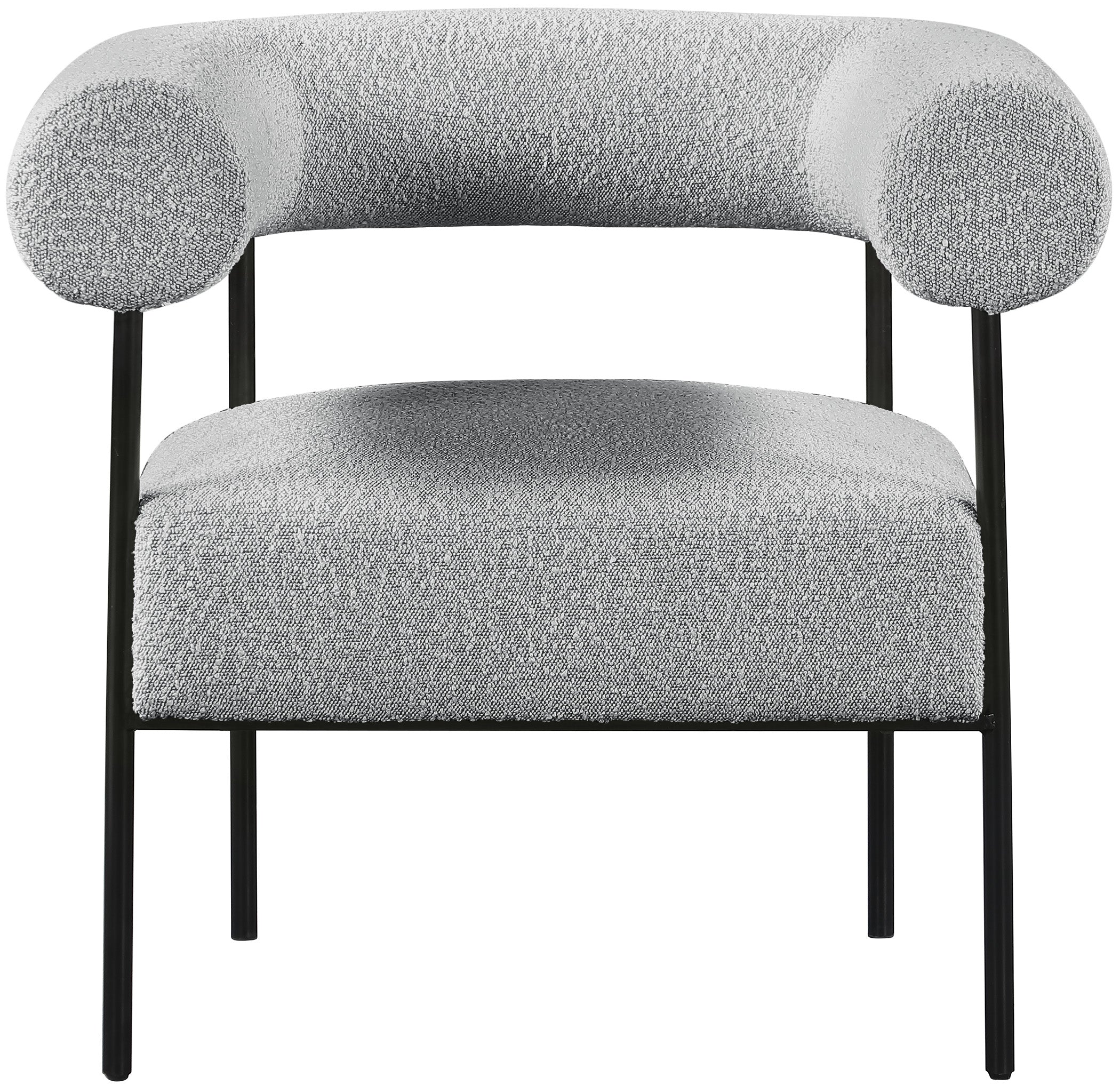 Modernize your home with this Blake accent chair. Featuring rich grey boucle fabric and a matte black metal frame, its contemporary design is sure to catch the eye of all your house guests. Crafted from a mixture of iron and foam, this accent chair is sturdy enough to seat just about anyone. Its curved back provides a comfortable resting place for your spine, and its thick foam cushion gives you a plush place to sit.