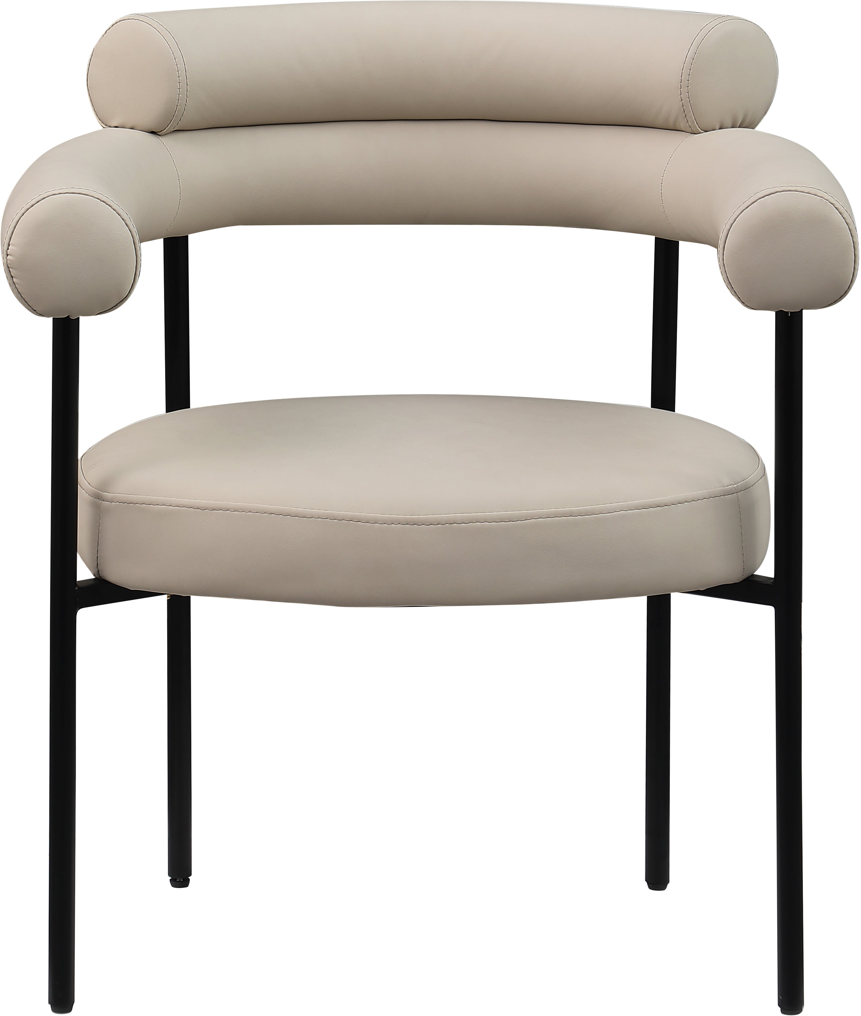 A back-hugging feel ensures this Blake taupe vegan leather diner chair quickly becomes your home's most coveted seat. Upholstered on the curved seat back and cushion with soft taupe vegan leather, this chair keeps guests comfortable from the start of the meal to its finish. An iron metal frame ensures sturdy support for guests, while the contemporary design makes it an easy fit with the table of your choice.