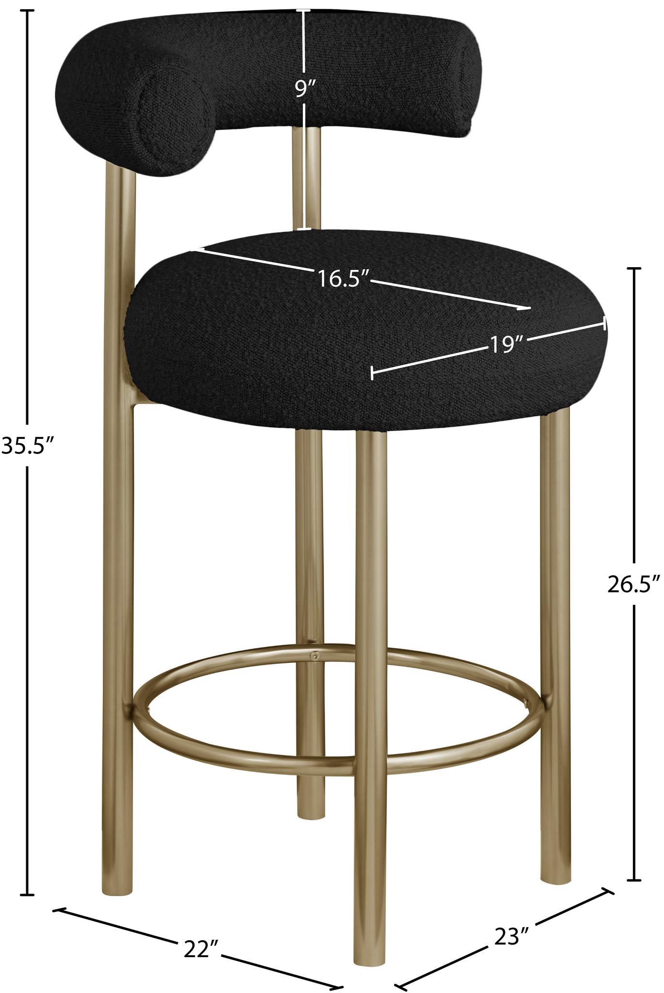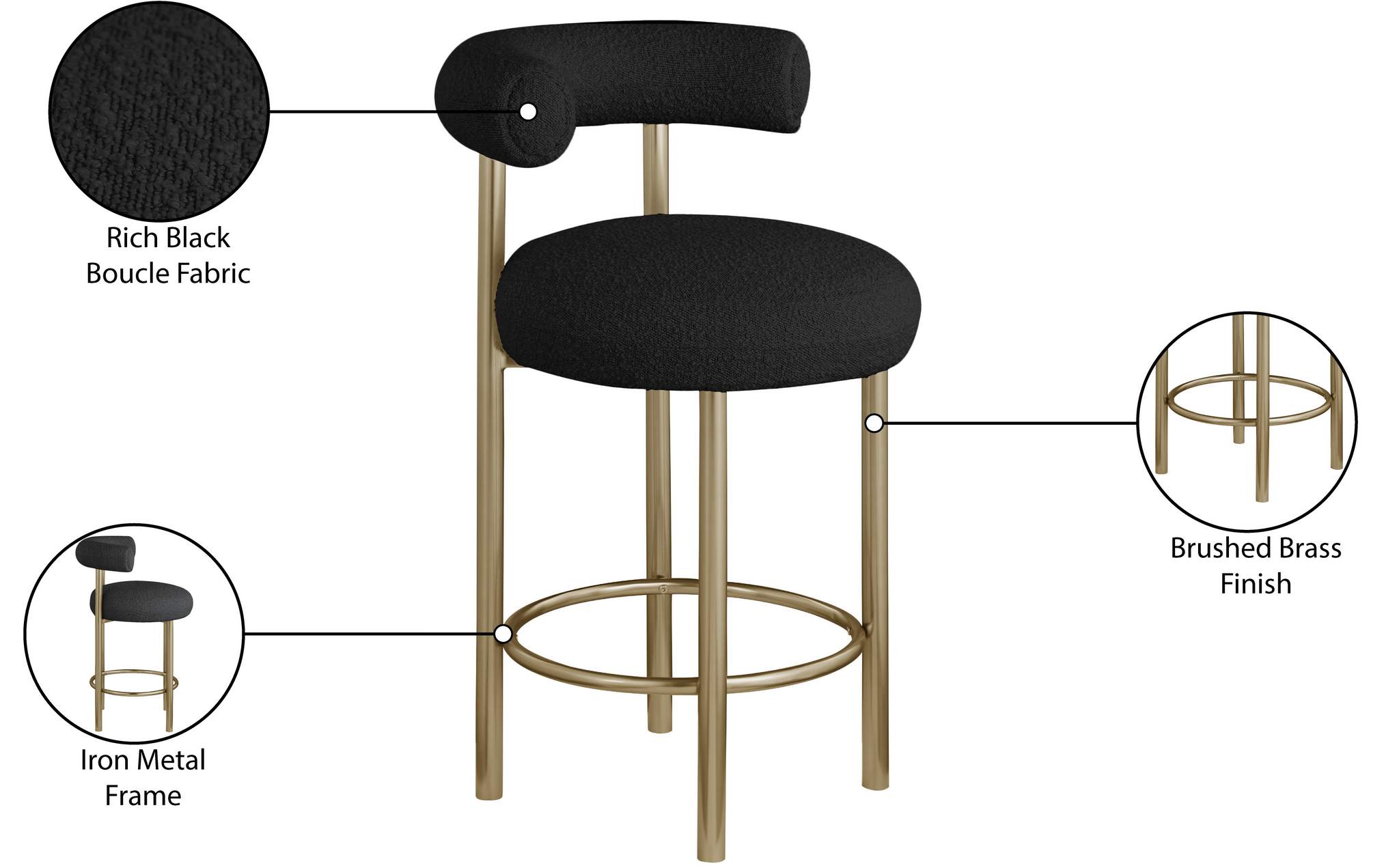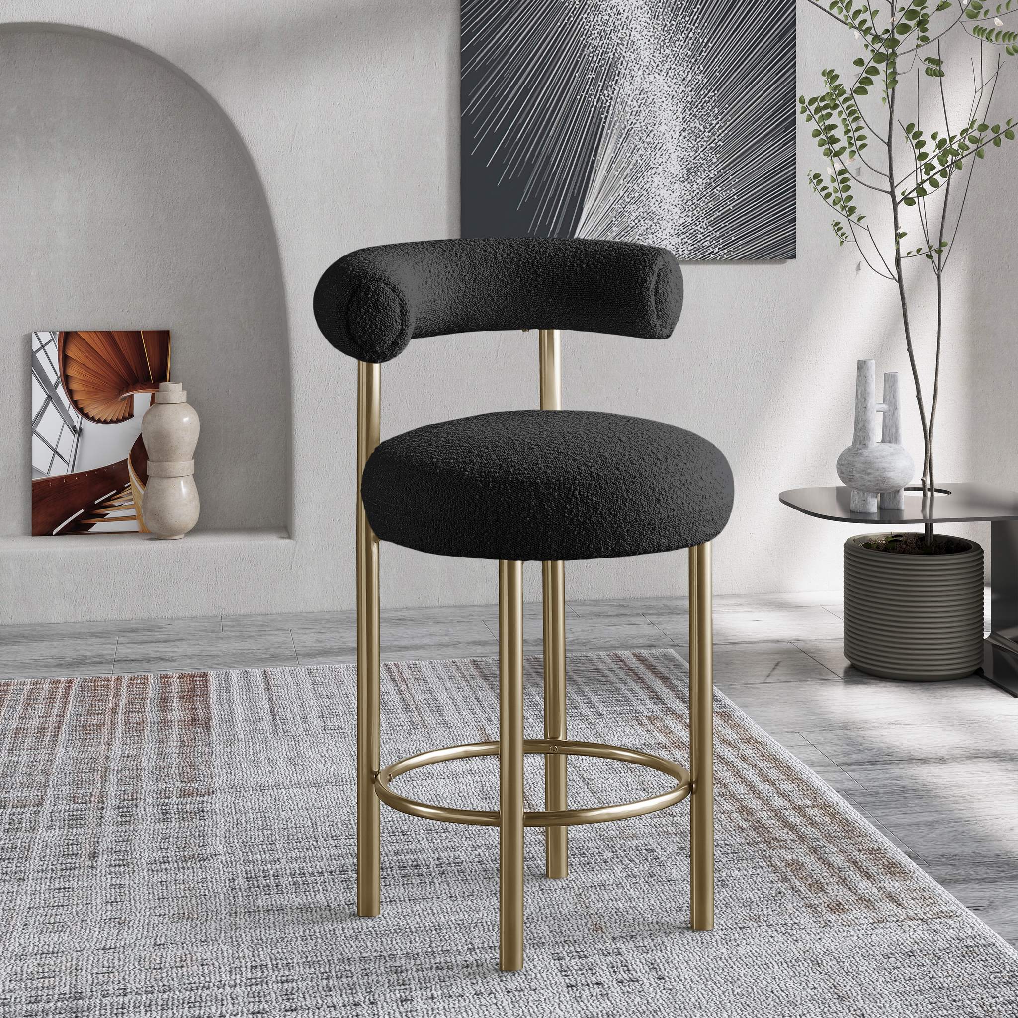 Give your kitchen counter or home bar a fresh face with this Bordeaux boucle fabric stool. This stool features rich black boucle fabric upholstery on the curved back and seat, so guests sit comfortably for pancake breakfasts or their favorite spirits. The iron metal frame is durable, tough, and sturdy, so it holds up to long-term enjoyment by family and friends. A brushed brass finish lends the stool an uber modern feel.