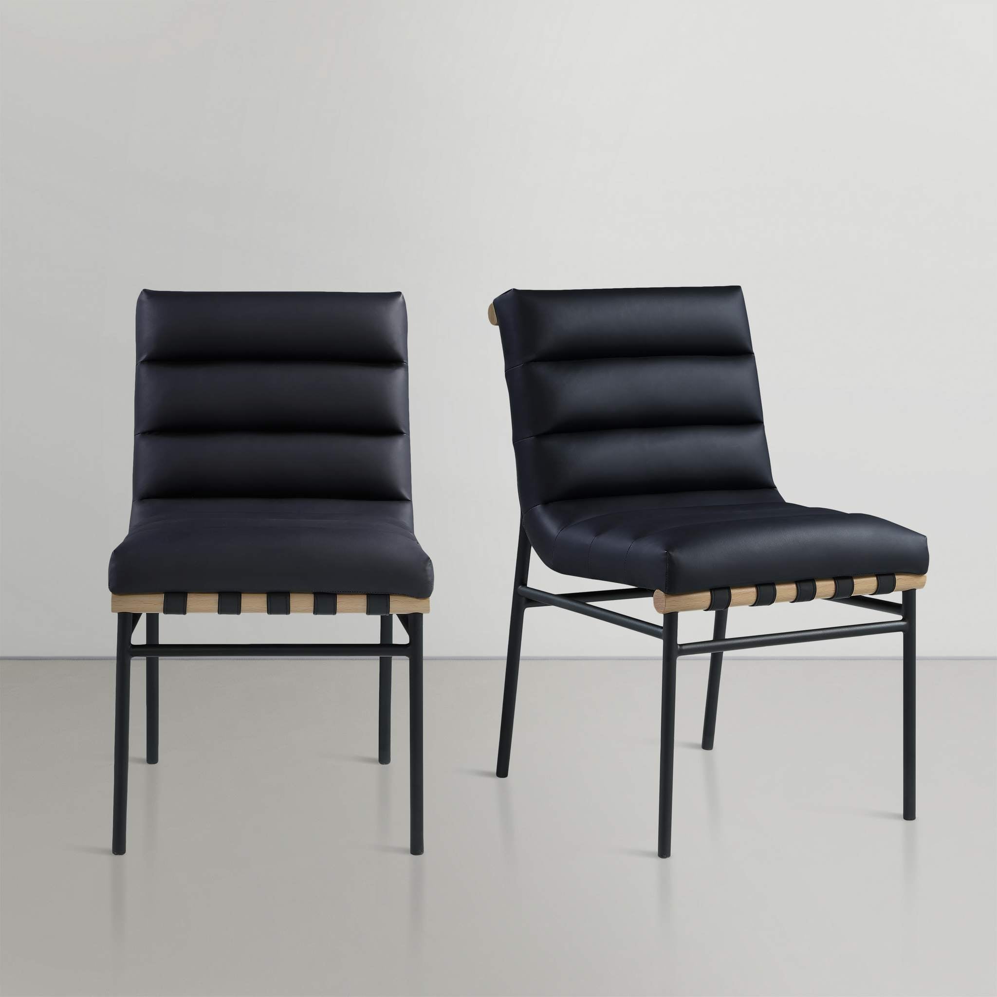 Keep guests sitting pretty for the entire meal with this Burke black vegan leather dining chair. This chair has rolled tufting for amazing support and durability and features an armless design that facilitates conversation between diners. A white oak veneer metal dowel on the back of the chair and under the seat lends additional interest to this modish dining chair option.