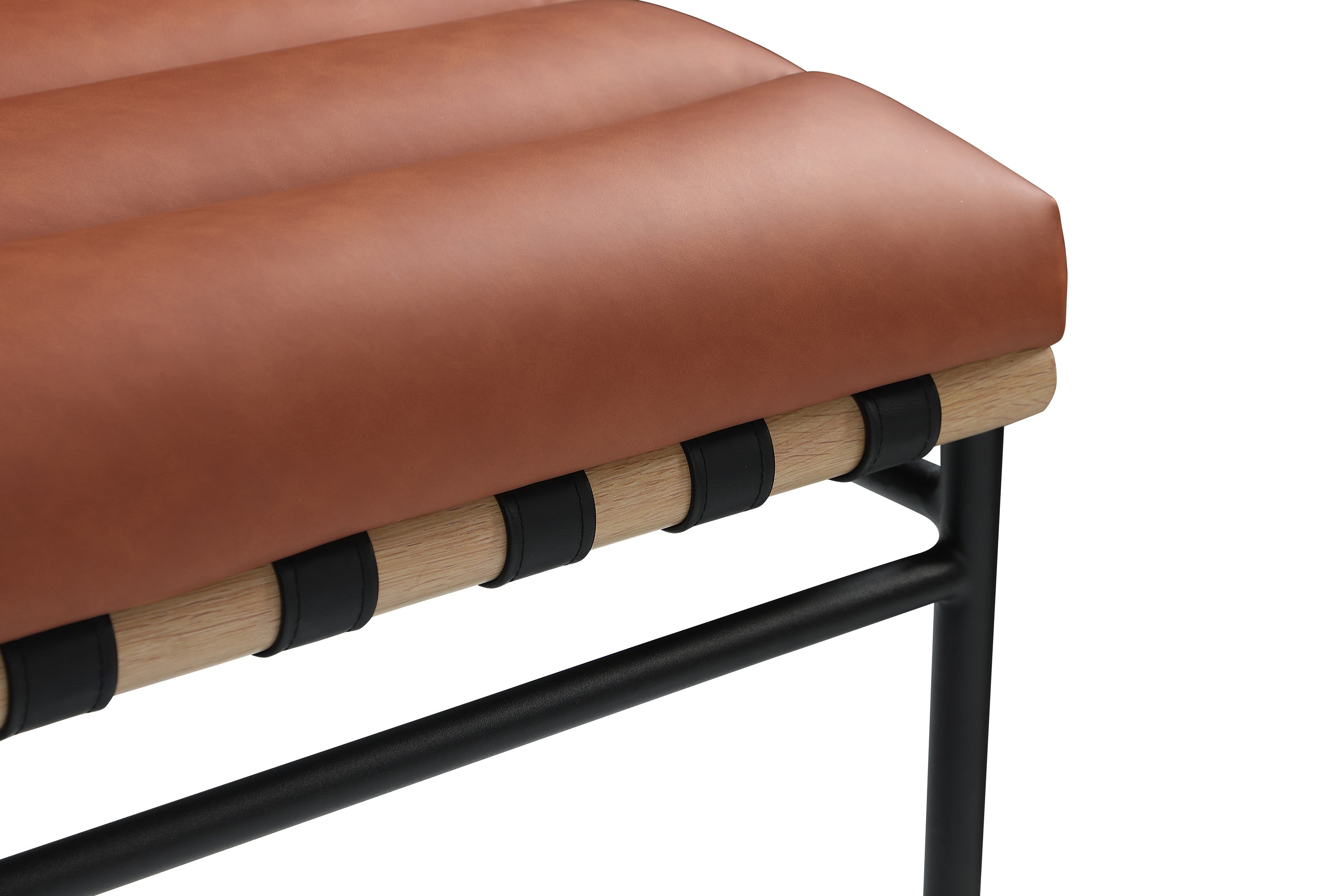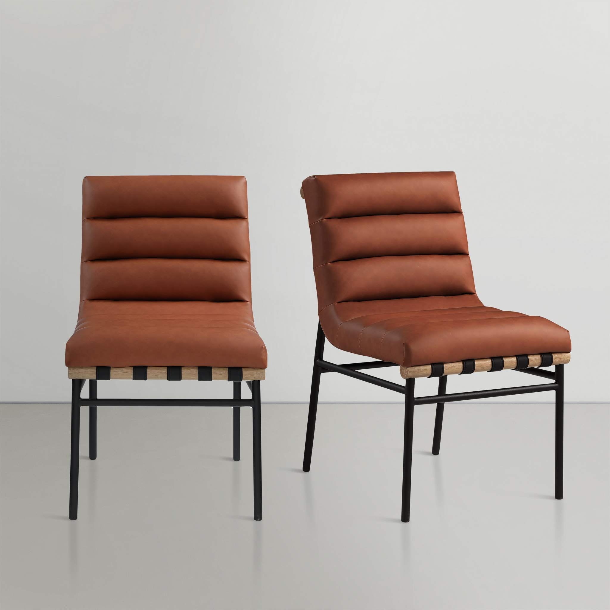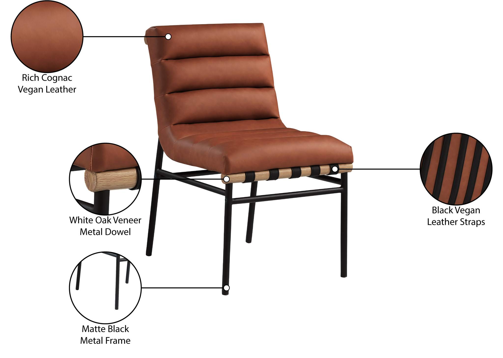 Keep guests sitting pretty for the entire meal with this Burke cognac vegan leather dining chair. This chair has rolled tufting for amazing support and durability and features an armless design that facilitates conversation between diners. A white oak veneer metal dowel on the back of the chair and under the seat lends additional interest to this modish dining chair option.