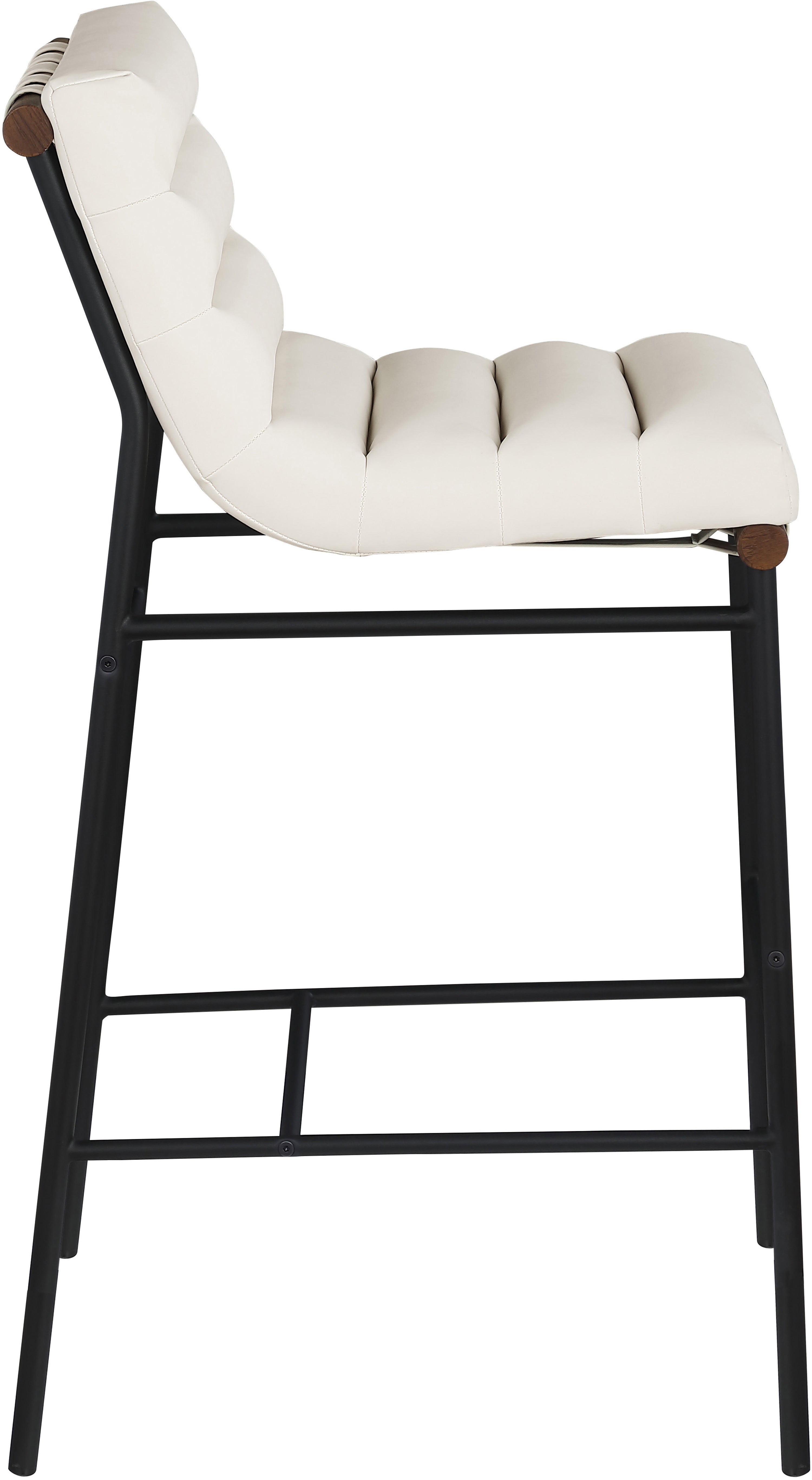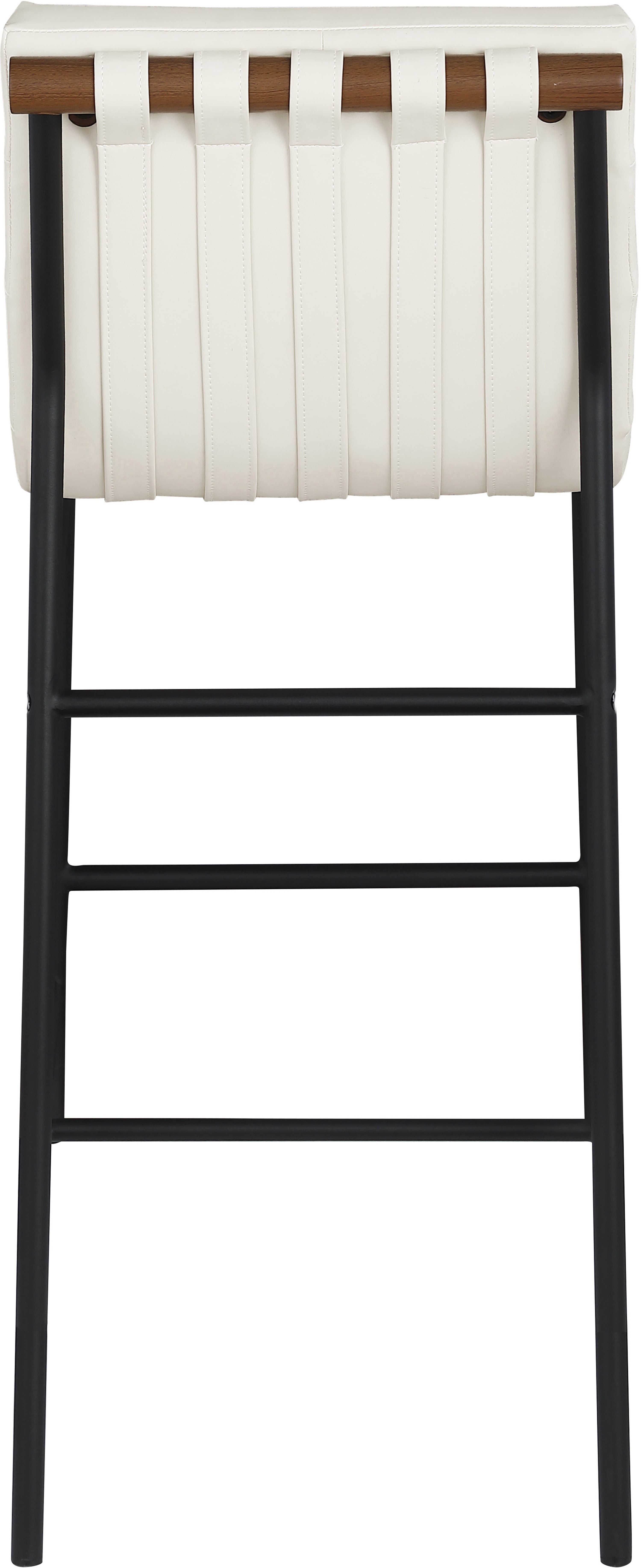 Whether at the home bar or the kitchen counter, this Burke cream vegan leather bar stool keeps guests comfortable while noshing on pancakes or sipping frosty beverages. Upholstered in soft cream vegan leather with cream vegan leather straps, this handsome bar stool makes guests want to stay till closing time. This bar-height stool has a matte black metal frame for sturdy support and a walnut wood veneer metal dowel for an added touch of stylishness. The vegan leather seat is easy to clean and maintain, so the stool keeps its beautiful look longer.