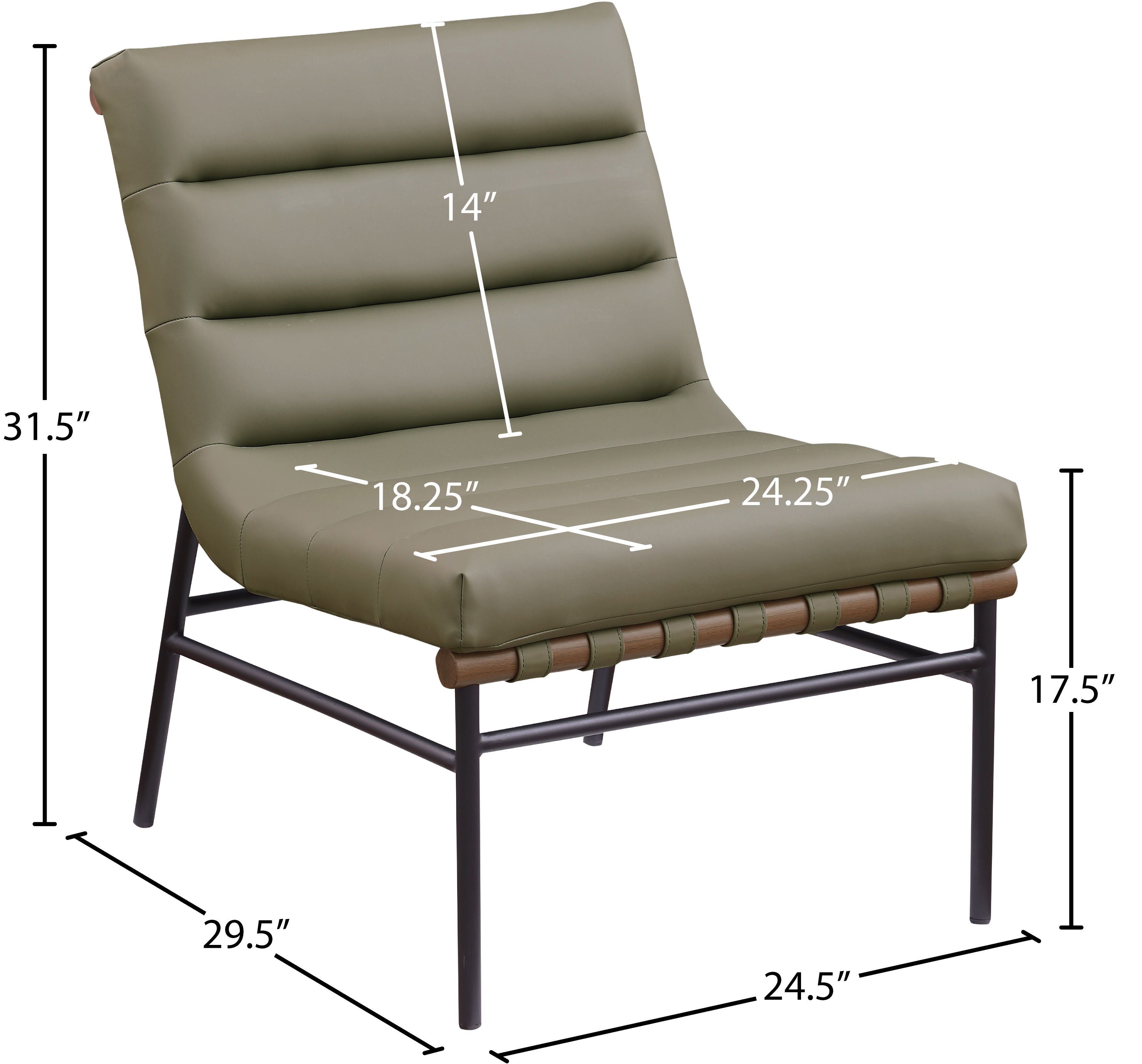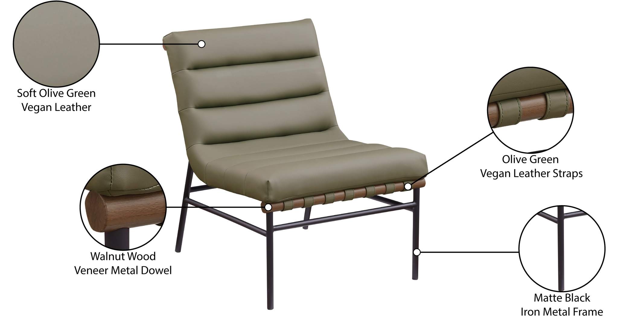 Give your room casual appeal with this Burke olive vegan leather accent chair. This handsomely crafted chair ticks all the boxes with its easy, laid-back look and its impeccable durability. The chair rests on a black matte metal frame and comes equipped with a welcomingly plump cushion body that's channel tufted for added body-hugging comfort. Soft olive vegan leather upholstery adds an elegant touch to the chair while making it easy to maintain.