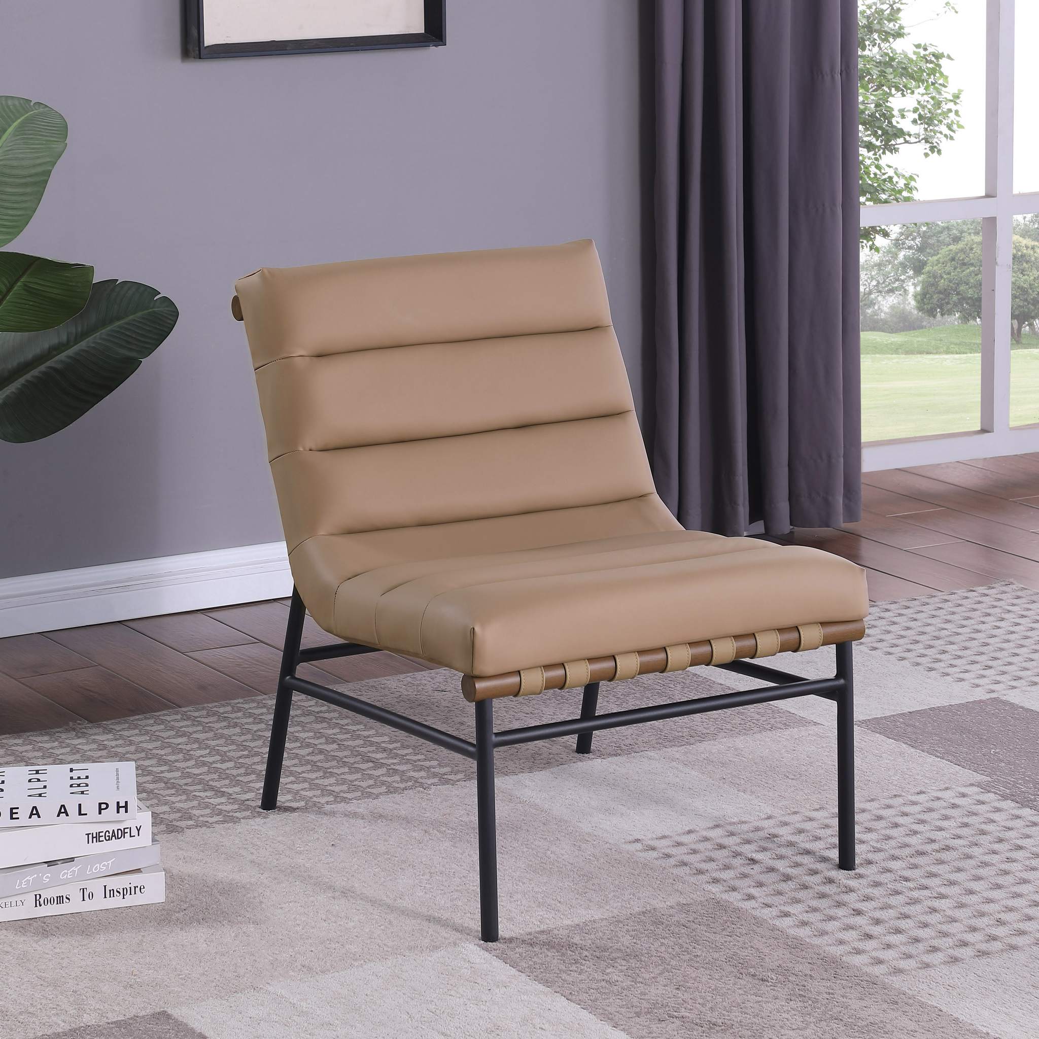 Give your room casual appeal with this Burke tan vegan leather accent chair. This handsomely crafted chair ticks all the boxes with its easy, laid-back look and its impeccable durability. The chair rests on a black matte metal frame and comes equipped with a welcomingly plump cushion body that's channel tufted for added body-hugging comfort. Soft tan vegan leather upholstery adds an elegant touch to the chair while making it easy to maintain.