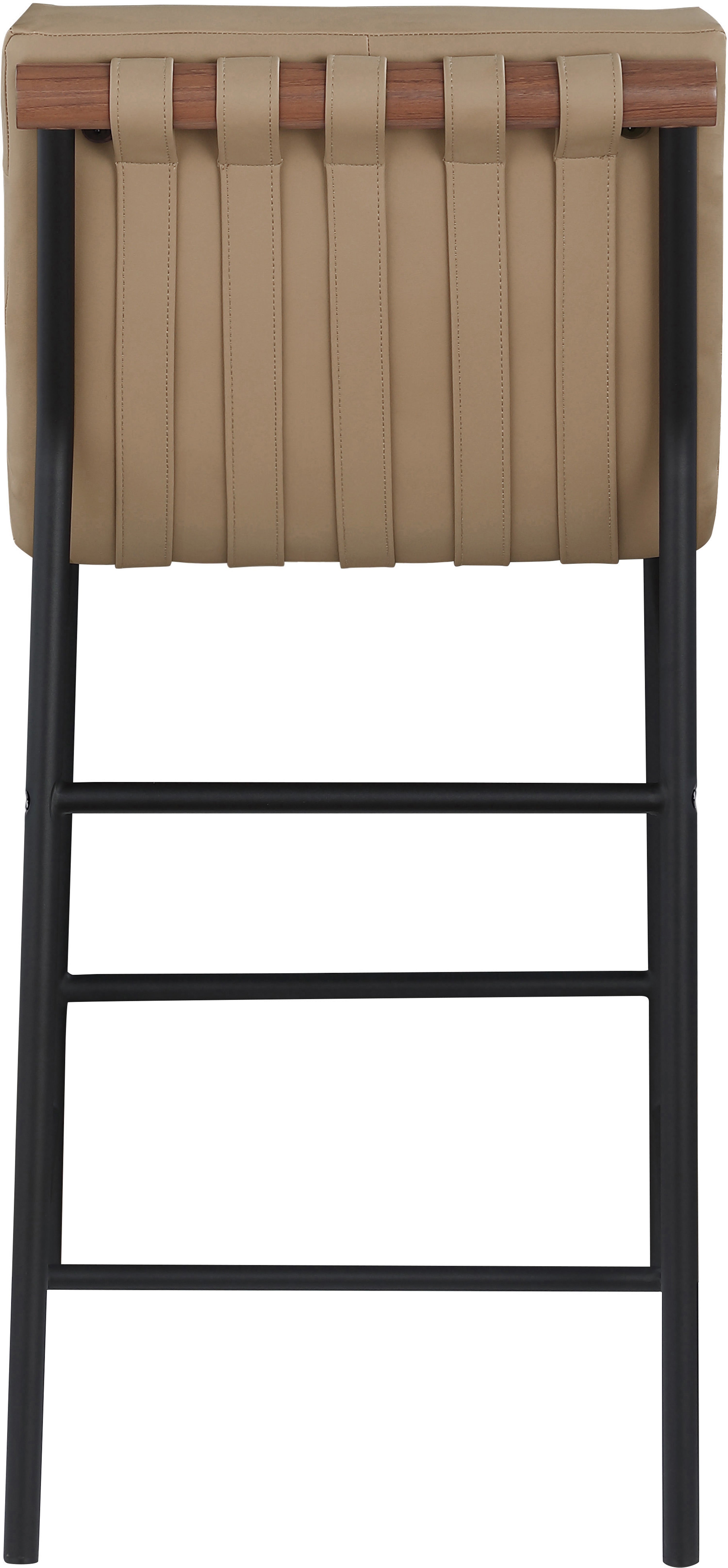 Whether at the home bar or the kitchen counter, this Burke tan vegan leather counter stool keeps guests comfortable while noshing on pancakes or sipping frosty beverages. Upholstered in soft tan vegan leather with tan vegan leather straps, this handsome counter stool makes guests want to stay till closing time. This counter-height stool has a matte black metal frame for sturdy support and a walnut wood veneer metal dowel for an added touch of stylishness. The vegan leather seat is easy to clean and maintain, so the stool keeps its beautiful look longer.