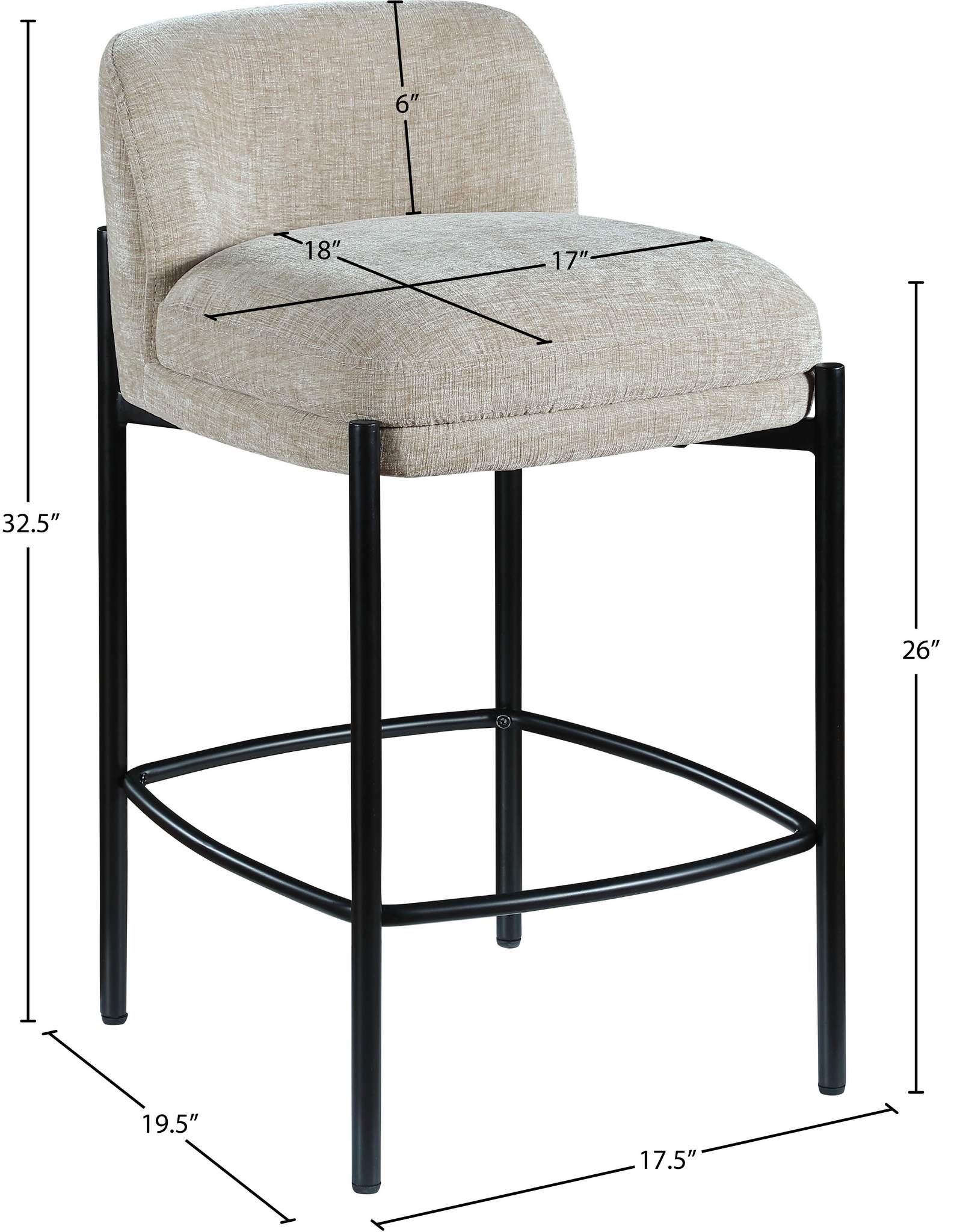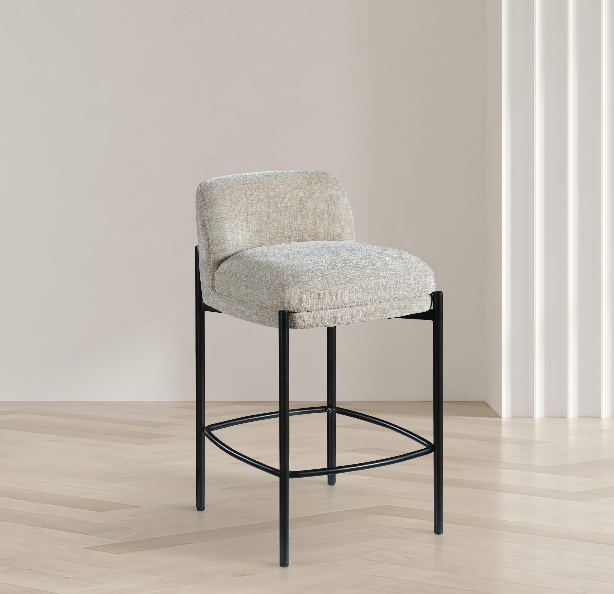 Make your kitchen counter or home bar your family's favorite spot to be with these beige Burton chenille fabric bar/counter stools. Each stool boasts soft beige chenille fabric and a sturdy matte black metal frame, ensuring both comfort and durability. A footrail across the bottom adds to the comfort factor of these handsome stools. Sold in sets of two per carton, these counter stools offer stylish and functional seating while infusing your space with a chic and modern touch.