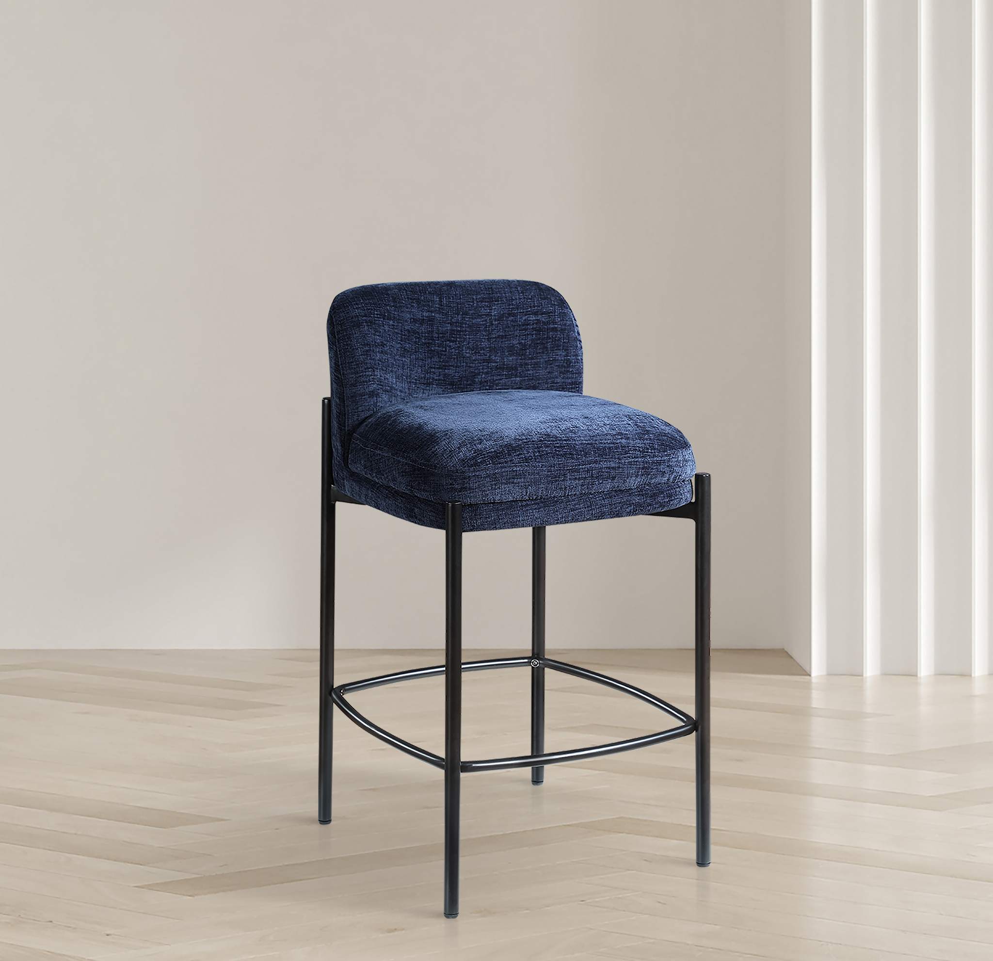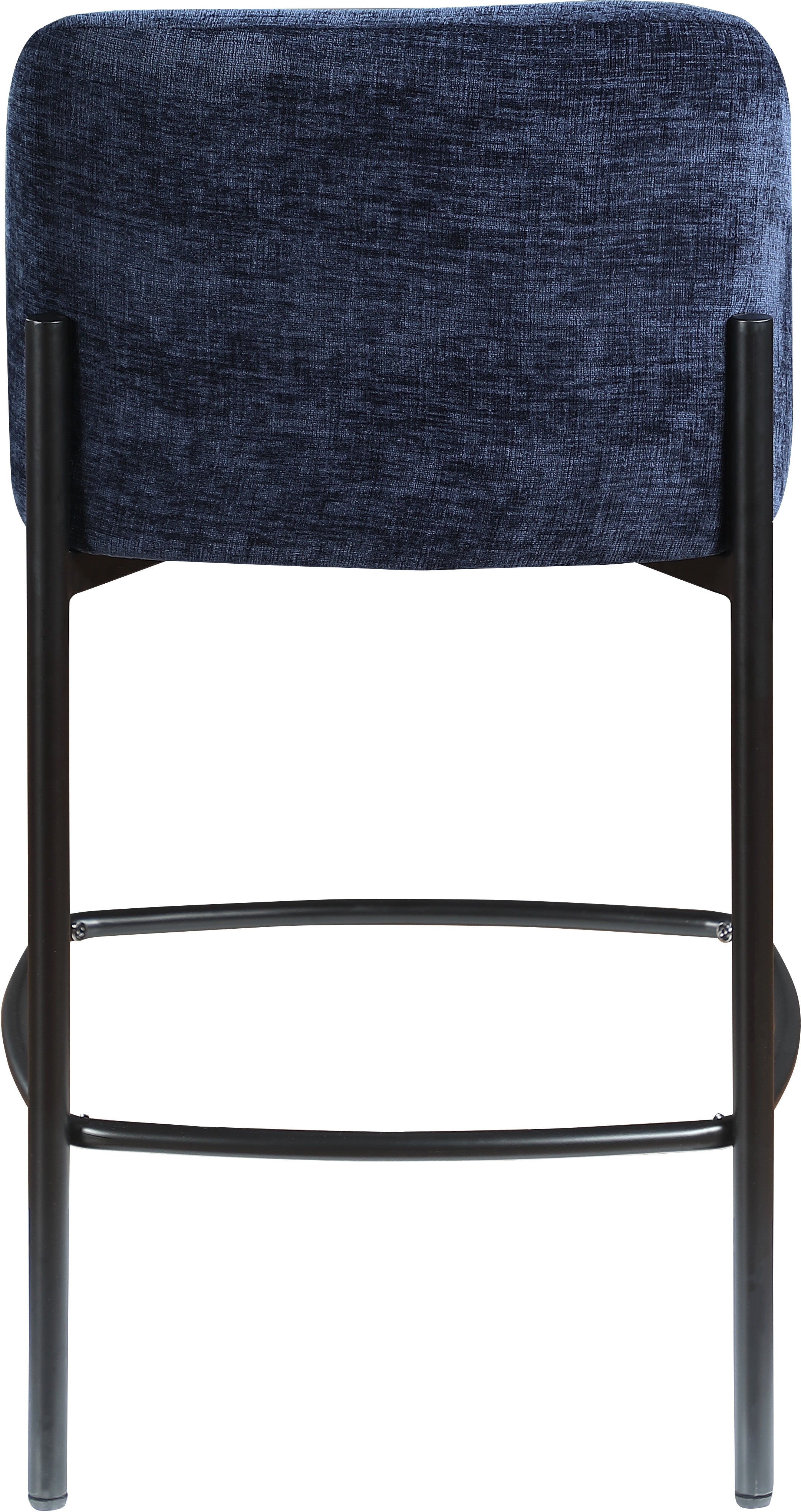 Make your kitchen counter or home bar your family's favorite spot to be with these navy Burton chenille fabric bar/counter stools. Each stool boasts soft navy chenille fabric and a sturdy matte black metal frame, ensuring both comfort and durability. A footrail across the bottom adds to the comfort factor of these handsome stools. Sold in sets of two per carton, these counter stools offer stylish and functional seating while infusing your space with a chic and modern touch.