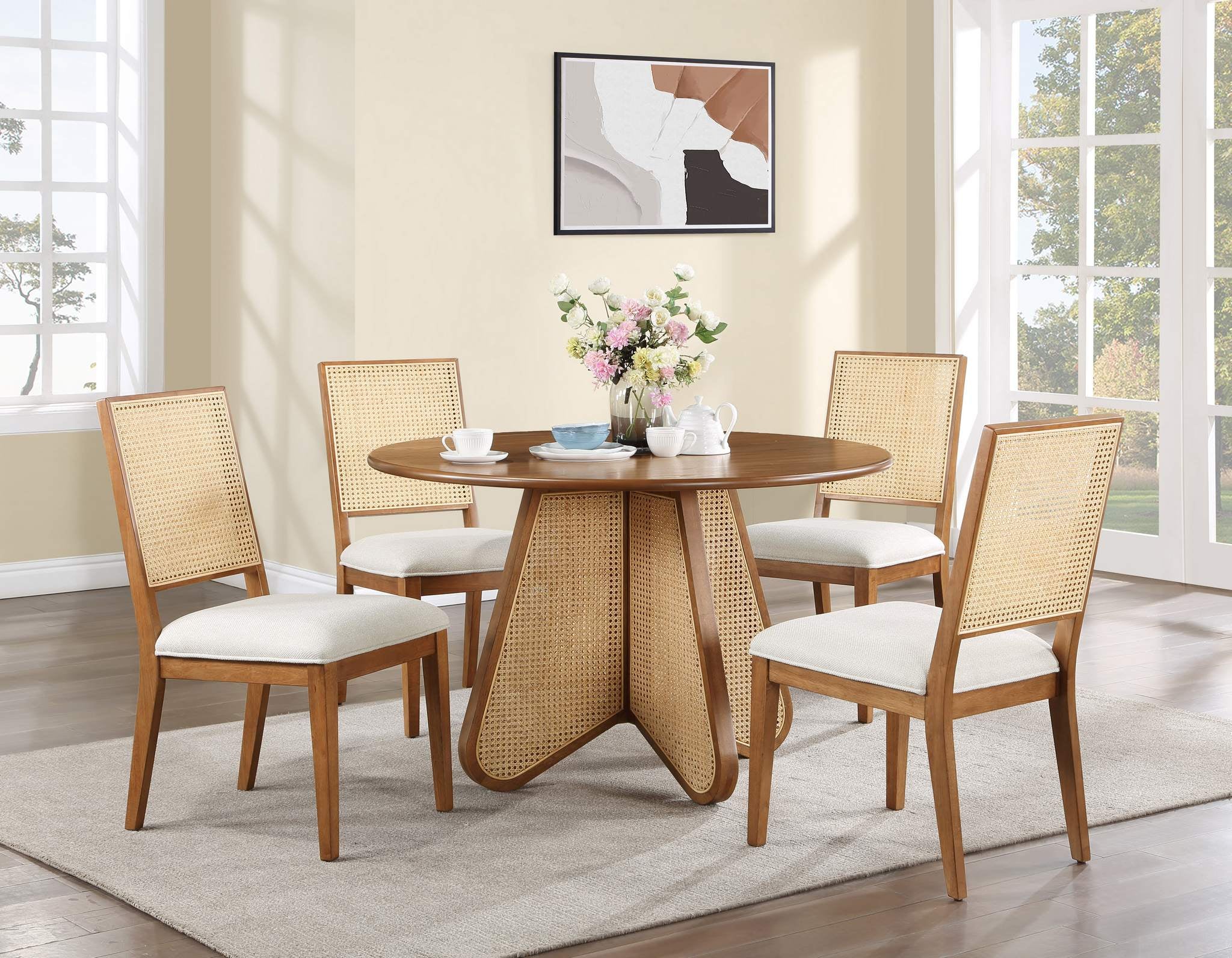Give your dining space a traditional makeover with this Butterfly dining table from Meridian Furniture. Its solid rubber wood frame features a sleek walnut finish that complements the dining chairs. Its natural cane base is reminiscent of a mid-century design, so you can relax in style as you dine, and making this piece right at home in any living space.