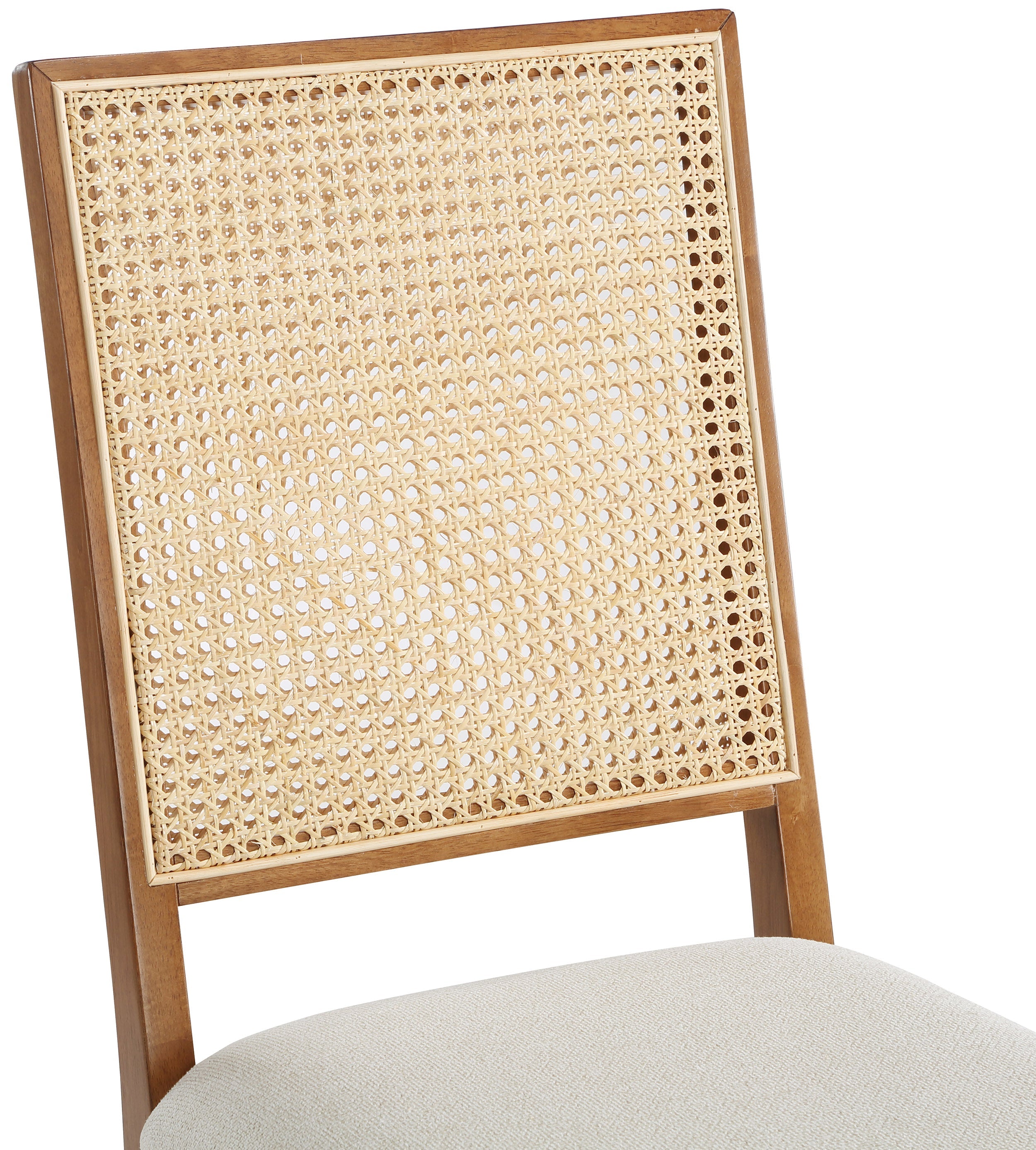 Give your dining space a traditional makeover with this Butterfly dining chair from Meridian Furniture. Its solid rubber wood frame features a sleek walnut finish, and its cushion is upholstered in soft cream linen-like polyester fabric, providing comfort and complementary colors to your dining table. Its natural cane back is reminiscent of a mid-century design, so you can relax in style as you dine, and making this piece right at home in any living space.