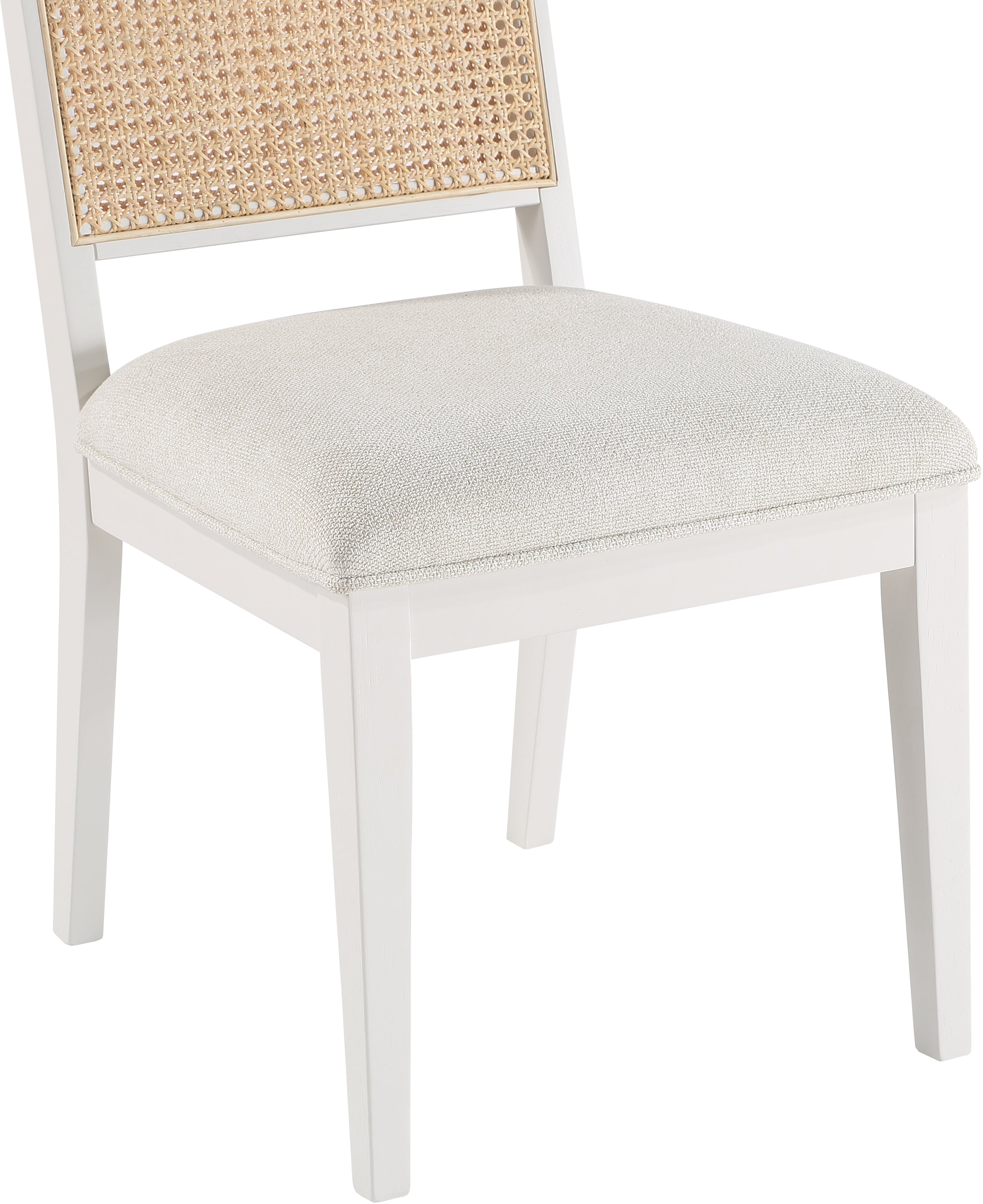 Give your dining space a traditional makeover with this Butterfly dining chair from Meridian Furniture. Its solid rubber wood frame features a sleek white finish, and its cushion is upholstered in soft cream linen-like polyester fabric, providing comfort and complementary colors to your dining table. Its natural cane back is reminiscent of a mid-century design, so you can relax in style as you dine, and making this piece right at home in any living space.