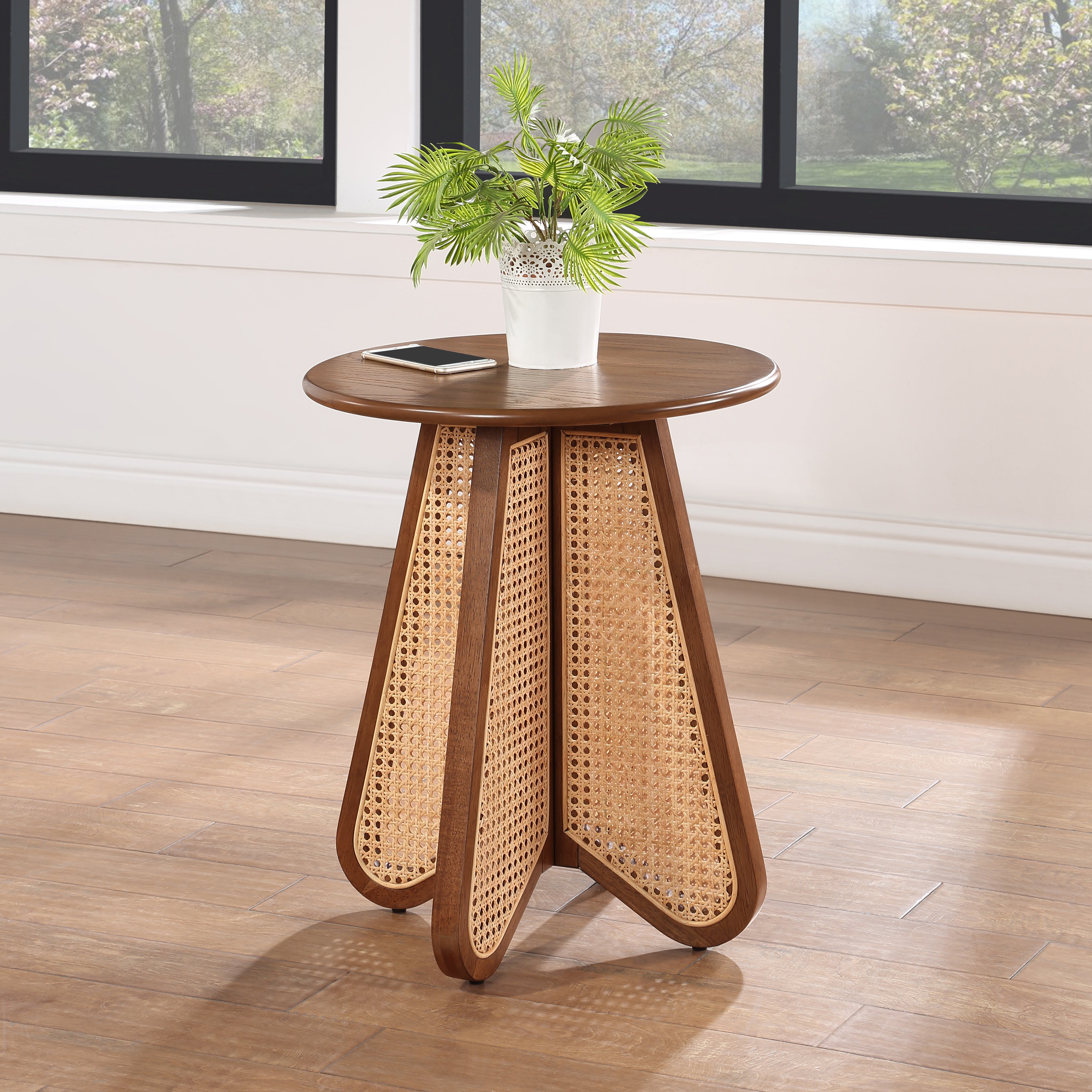 Bring impressive style and impeccable beauty to your living room or family room with this Butterfly end table. This handsome table is part work of art, part functional addition to your room. An expansive round oak veneer top gives you room for resting a drink or book or lamp to brighten the night. Construction with rubberwood and wood products gives this Butterfly table a resilient design, while its natural cane bottom adds a striking visual and instantly draws the eye.