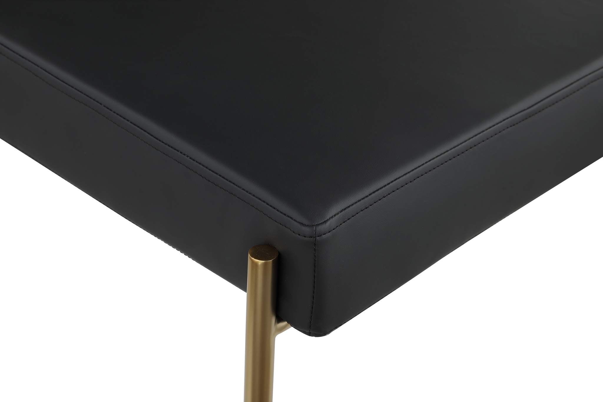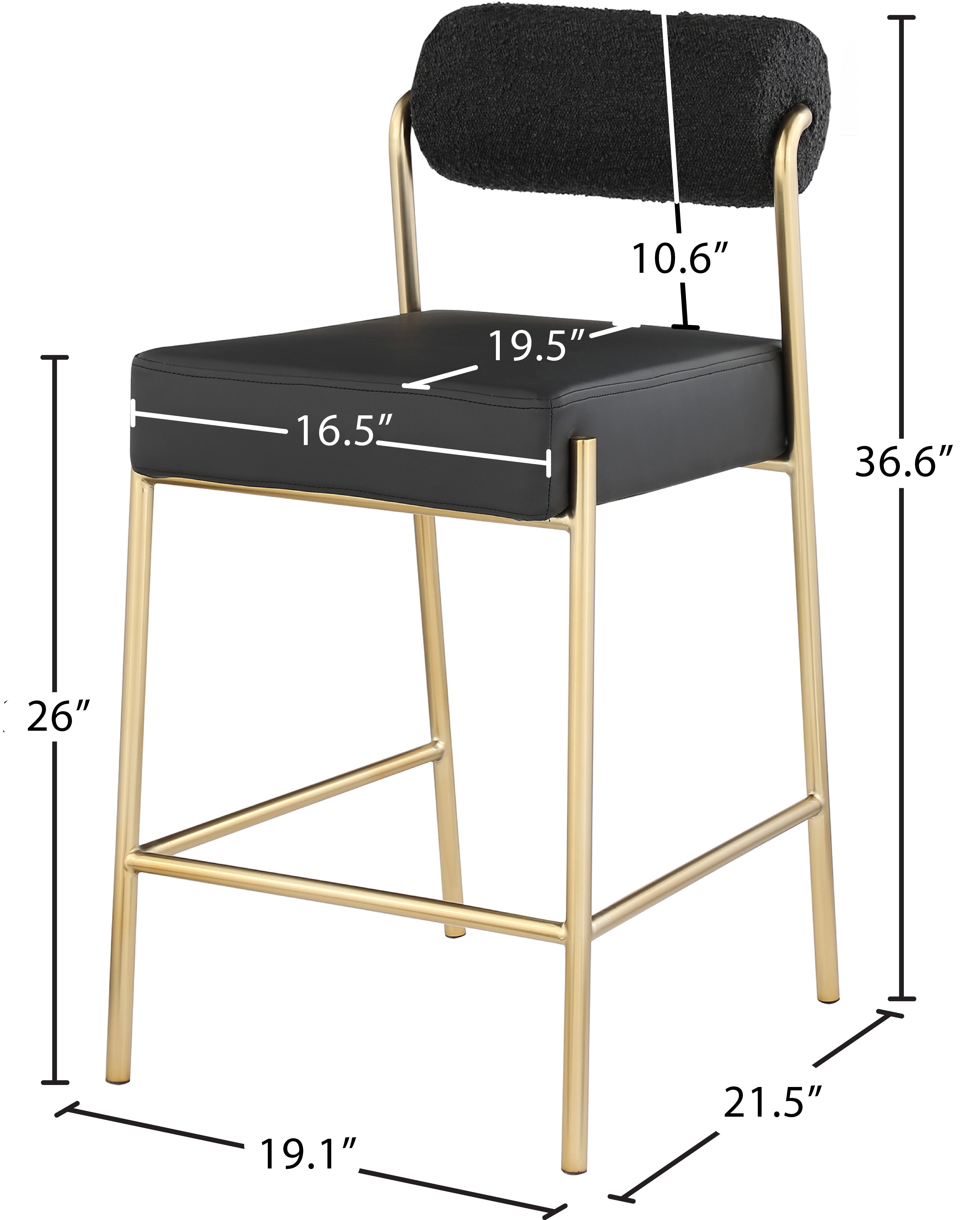 Transform your dining area with this Carly black vegan leather seat/boucle fabric back counter stool . Its black vegan leather seat provides you with a soft place to sit, while its rich black boucle back amps up the comfort level an extra notch. Its brushed brass iron frame ensures stability and durability, so you can enjoy this counter stool for years to come. This counter stool is perfect for any home featuring a contemporary design.