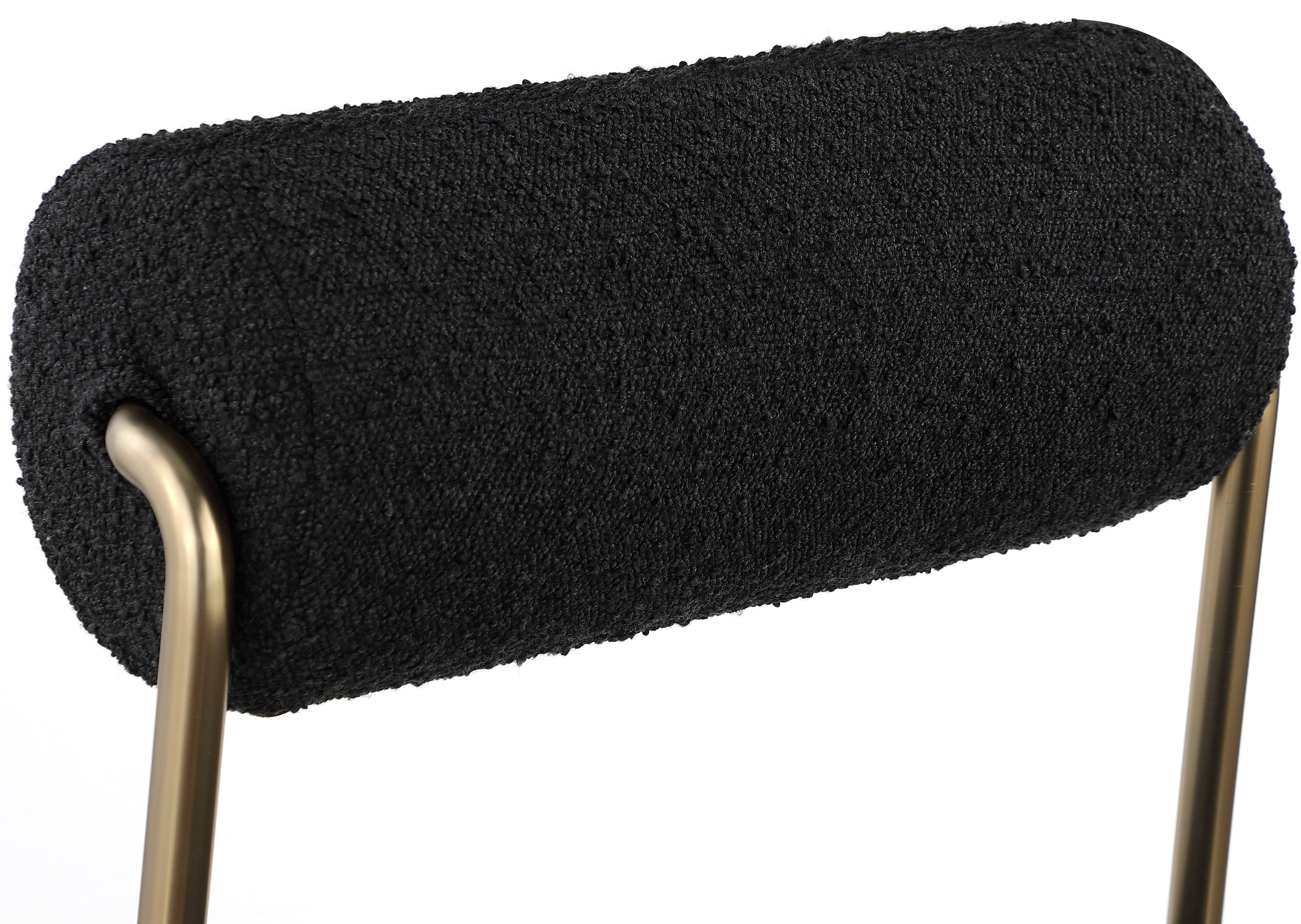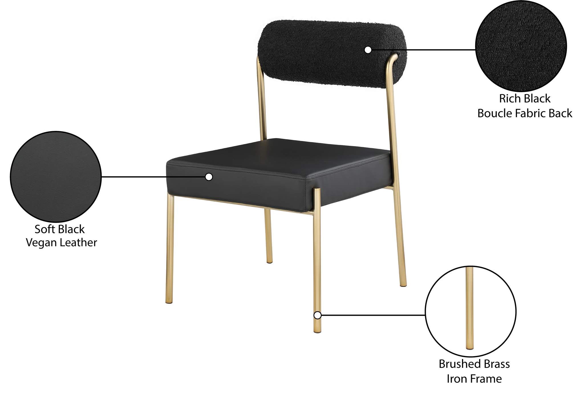 Transform your dining area with this Carly black vegan leather seat/boucle fabric back dining chair. Its black vegan leather seat provides you with a soft place to sit, while its rich black boucle back amps up the comfort level an extra notch. Its brushed brass iron frame ensures stability and durability, so you can enjoy this chair for years to come. This chair is perfect for any home featuring a contemporary design.