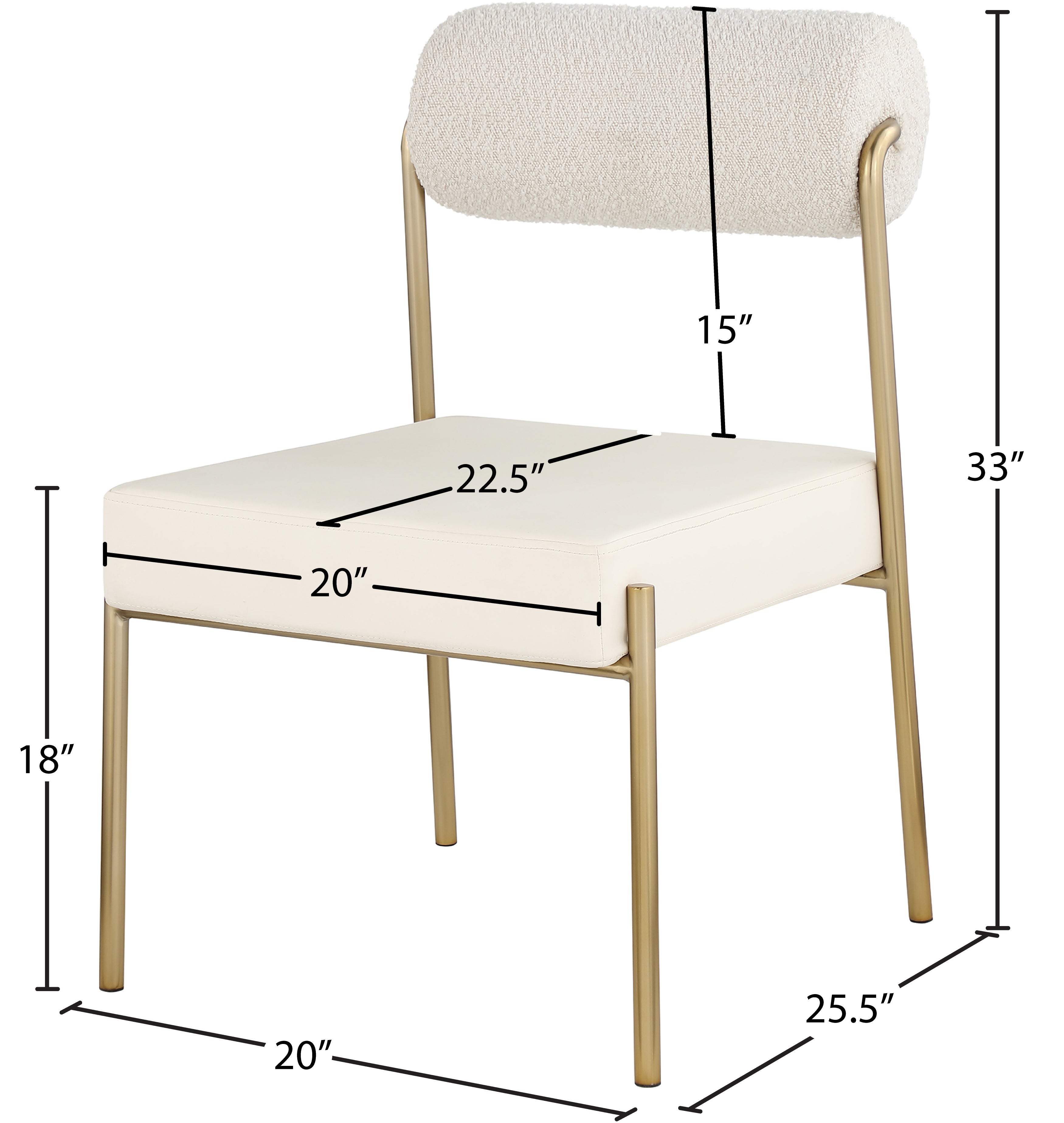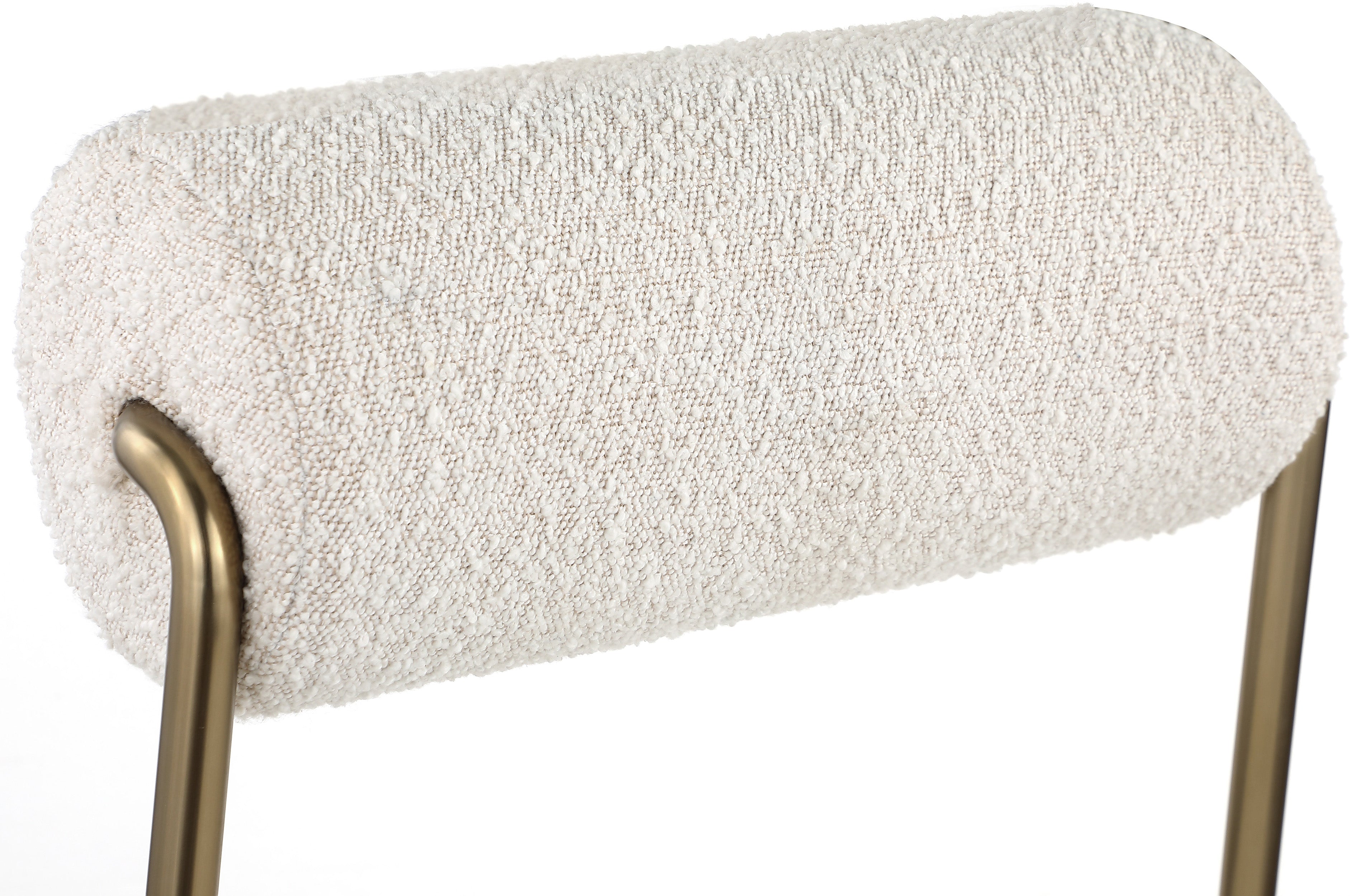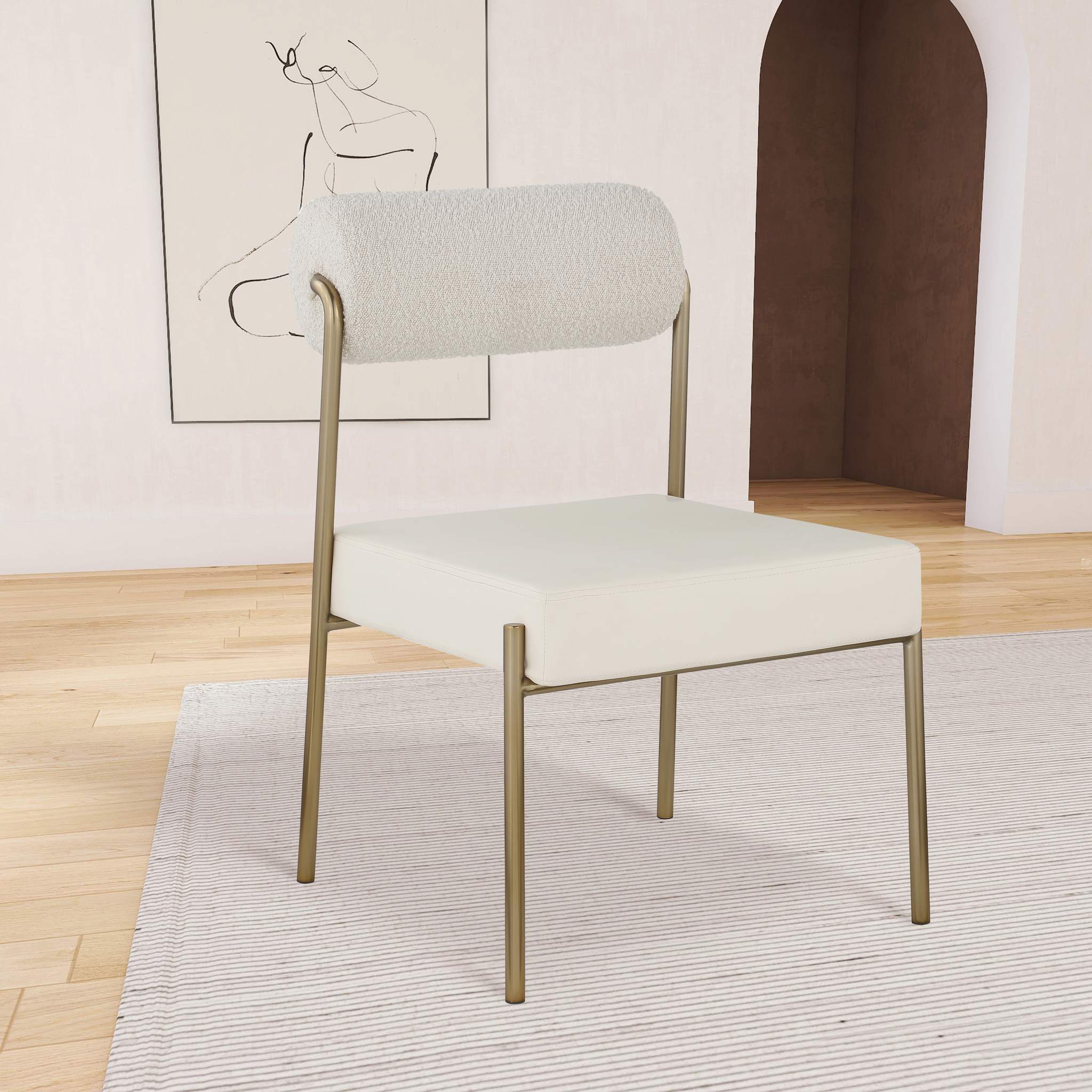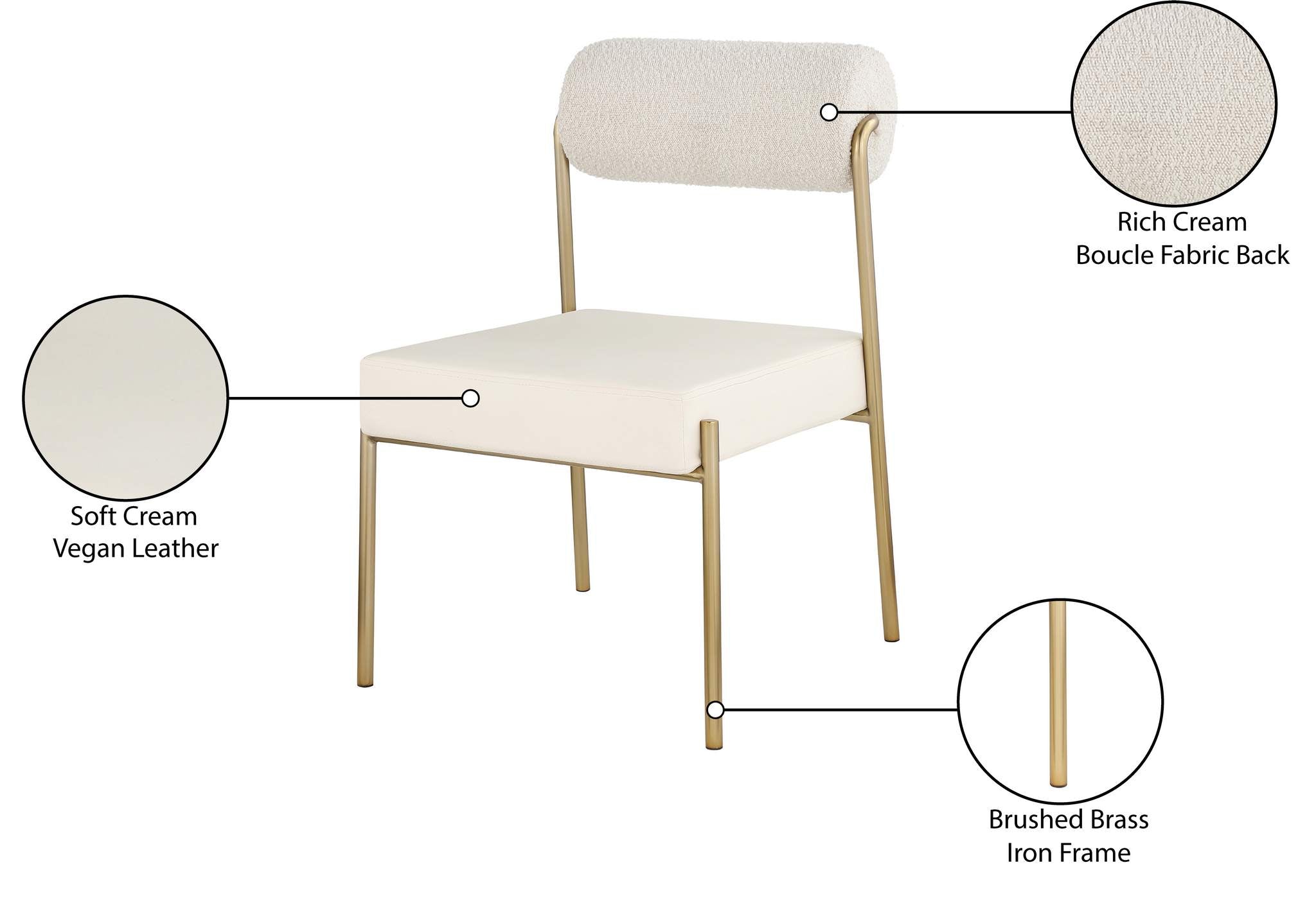 Transform your dining area with this Carly cream vegan leather seat/boucle fabric back dining chair. Its cream vegan leather seat provides you with a soft place to sit, while its rich cream boucle back amps up the comfort level an extra notch. Its brushed brass iron frame ensures stability and durability, so you can enjoy this chair for years to come. This chair is perfect for any home featuring a contemporary design.