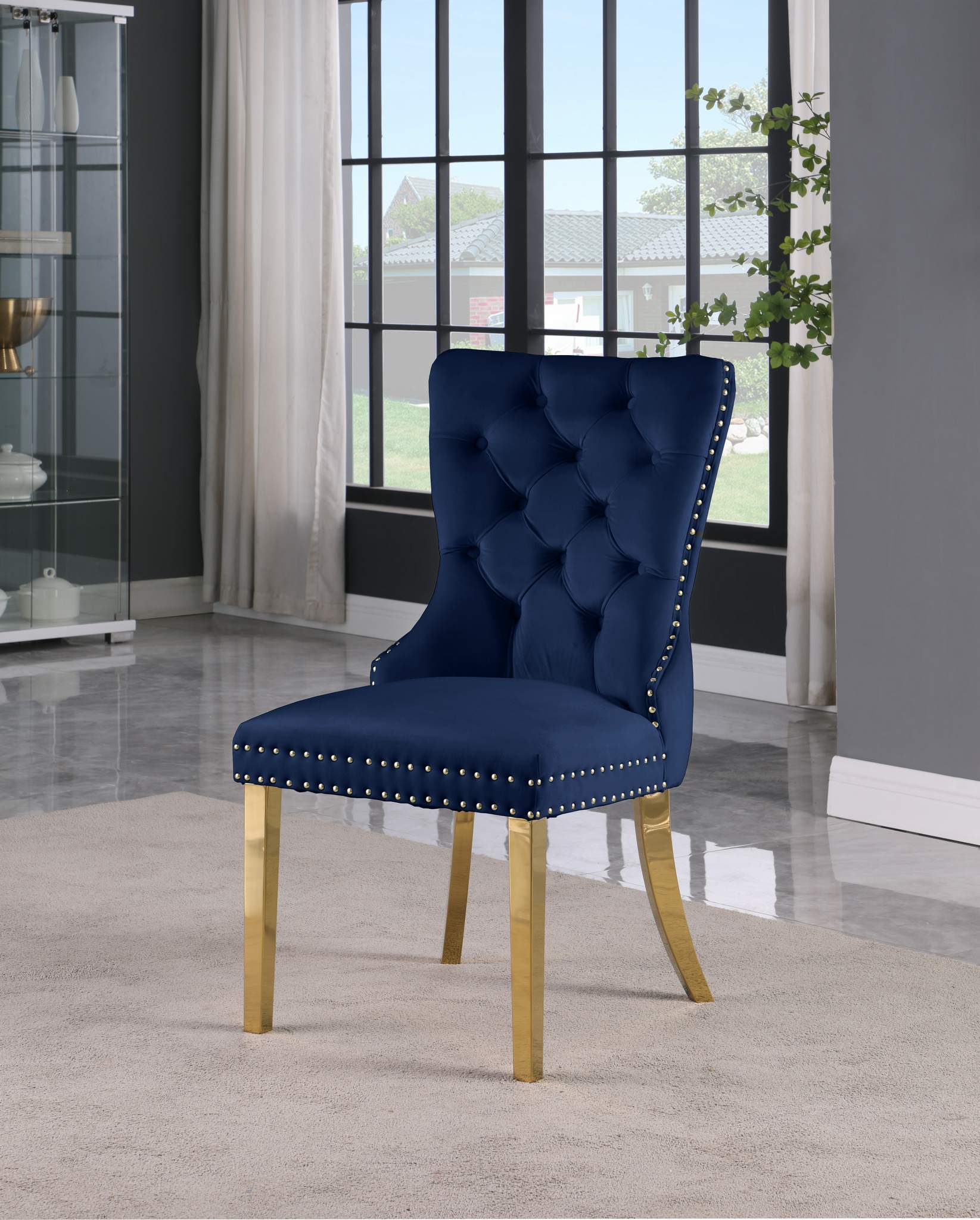 Make a huge impression on guests when you seat the in this Carmen velvet dining chair. A blend of modern beauty and timeless, classic design elements, this chair features luxuriously crafted navy velvet upholstery that's buttery soft to the touch and sleek and chic against the skin. The back of the chair has deep button tufting to help keep its padding from shifting and adding to its comfort factor for guests. A gold knocker on the back and gold nailhead trim add to the upscale feel of this handsome chair.