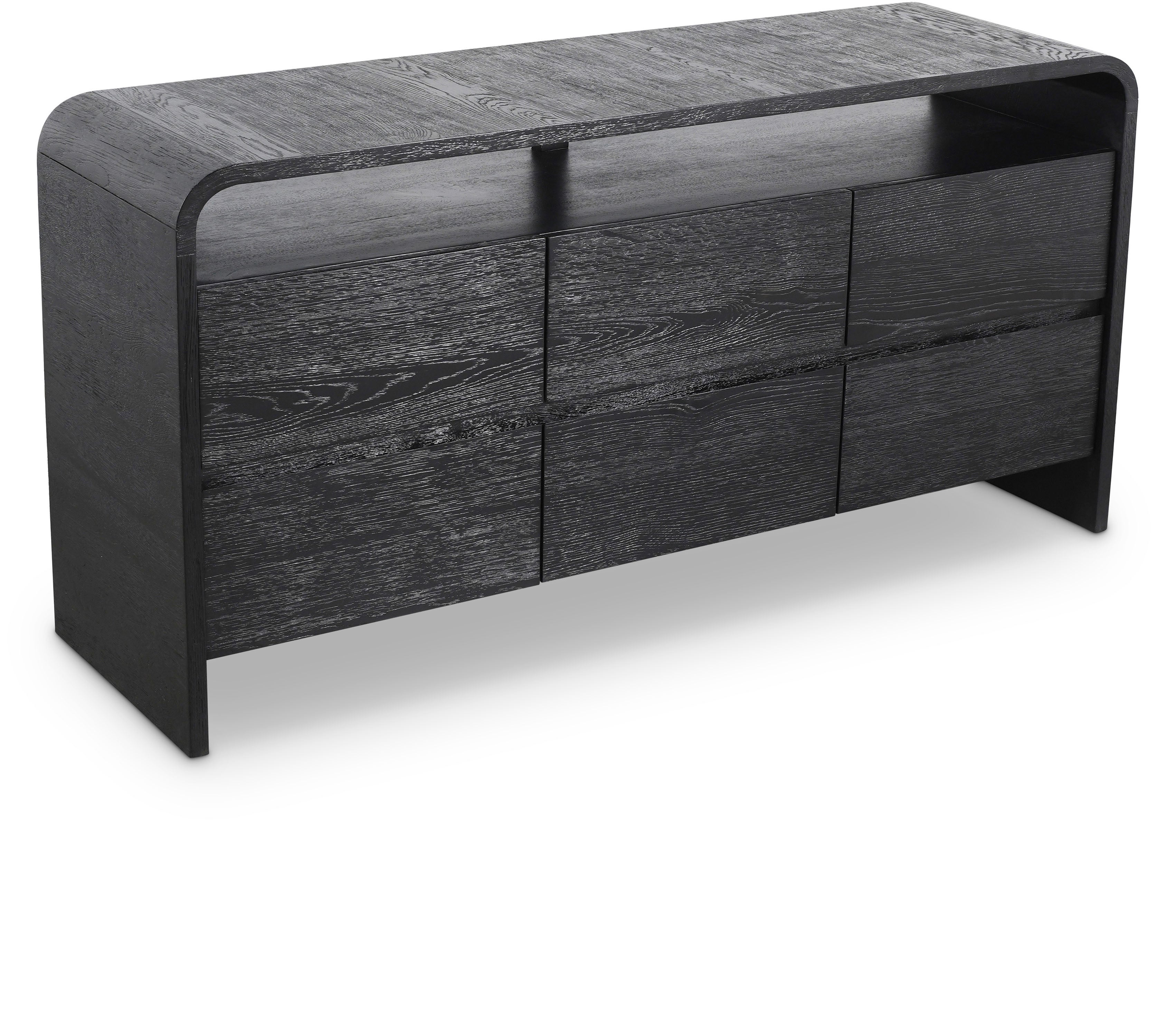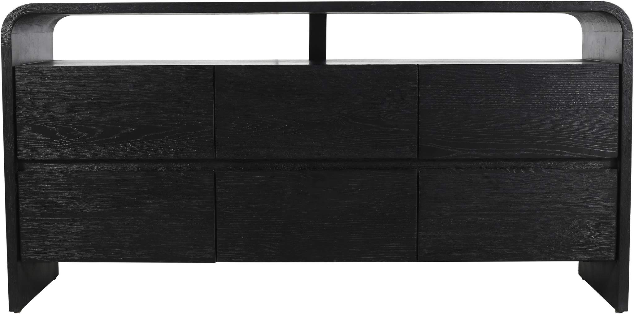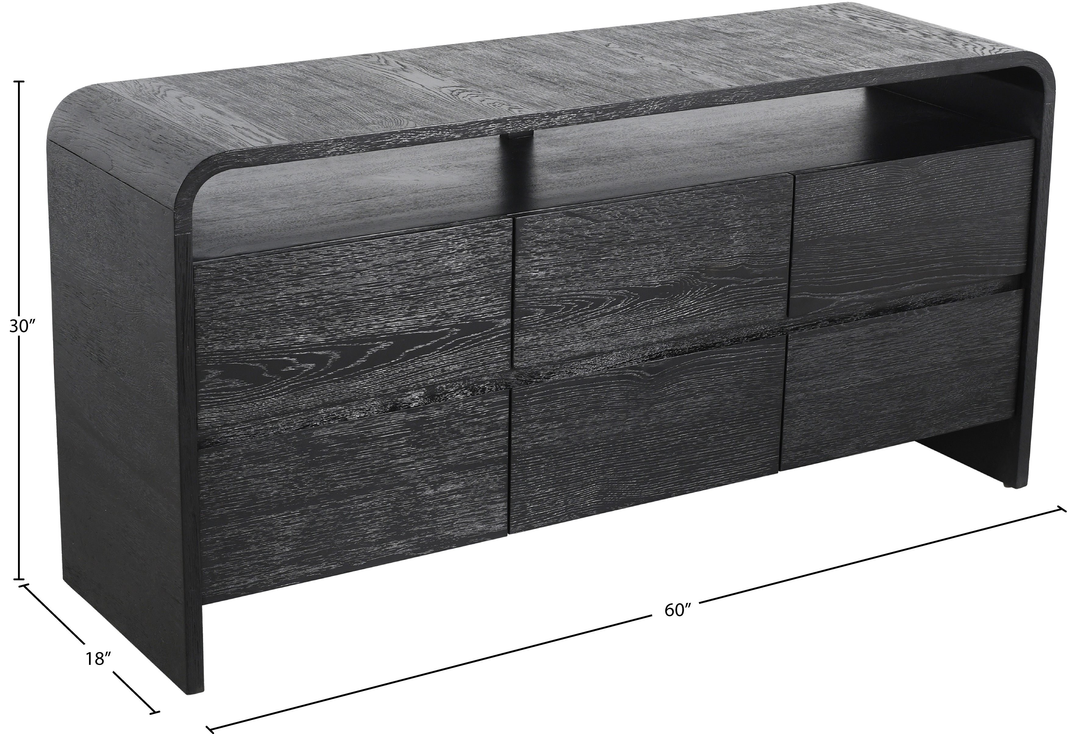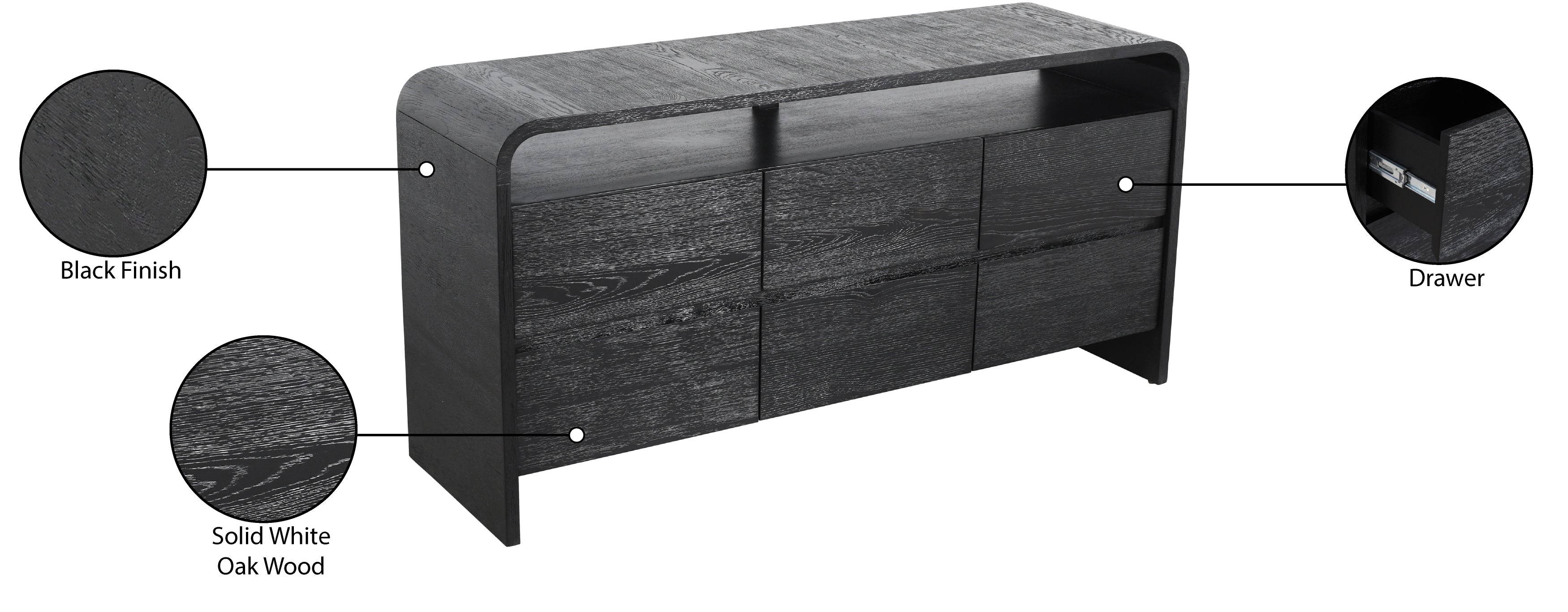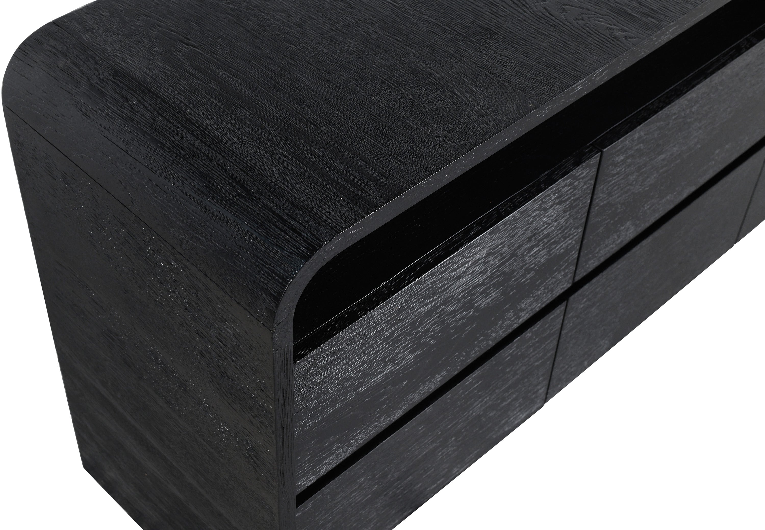 Expand storage space in your bedroom with this stunning black Cresthill dresser from Meridian Furniture. Featuring a frame crafted out of solid white oak wood with a black finish, this dresser complements a wide array of bedroom decor, making it a versatile piece. Six drawers provide ample storage space for your clothes, linens, or bric-a-brac, while an empty space below the dresser's top offer additional space for storing items. Its curved design makes this dresser a unique piece for any bedroom.