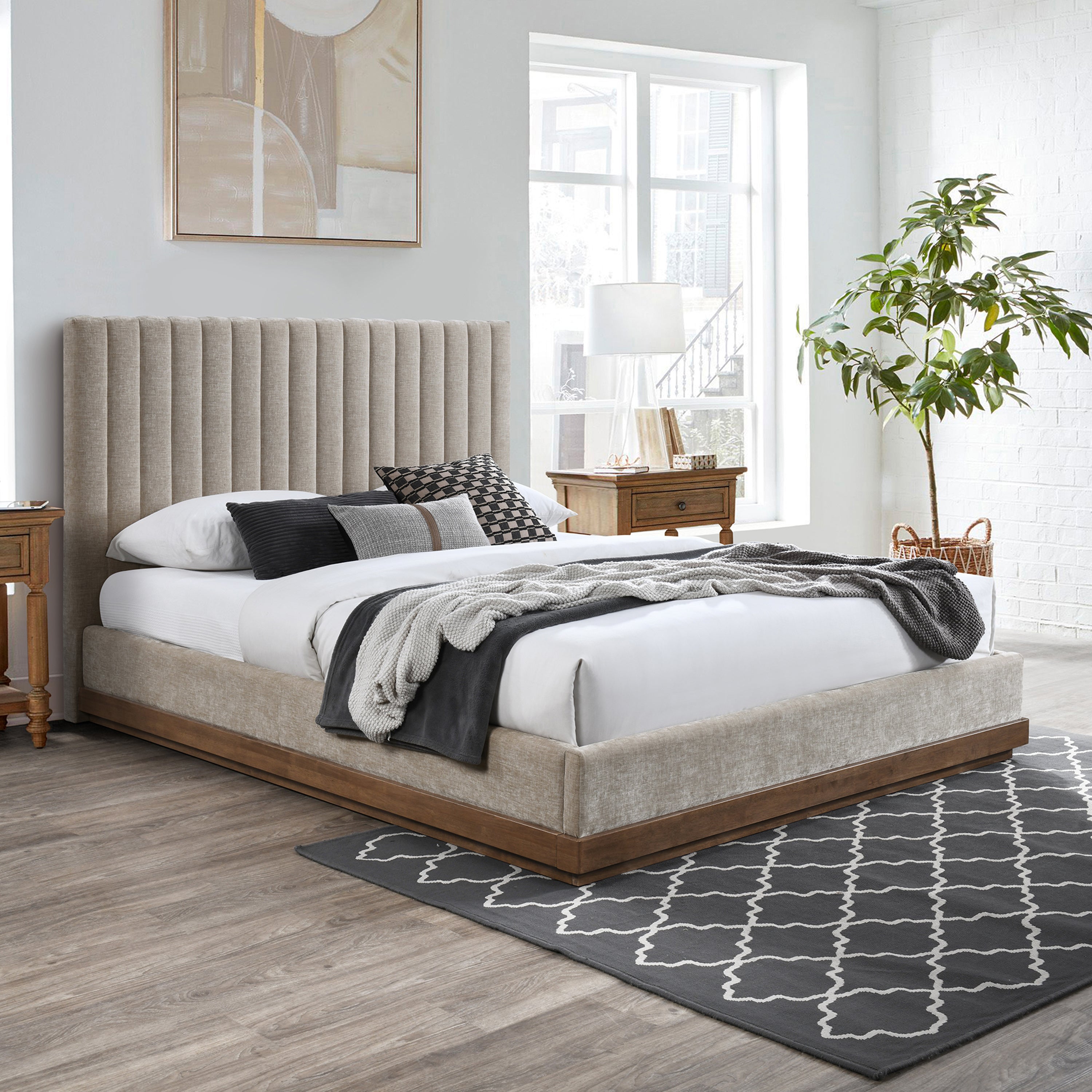 Bring a soft and inviting feel to your bedroom with the Emmet beige chenille upholstered full bed with its plush channel-tufted headboard. A sturdy solid wood base in a brown walnut finish adds warmth and stability to the design. Its contemporary aesthetic makes it a stylish and comfortable centerpiece for any bedroom.