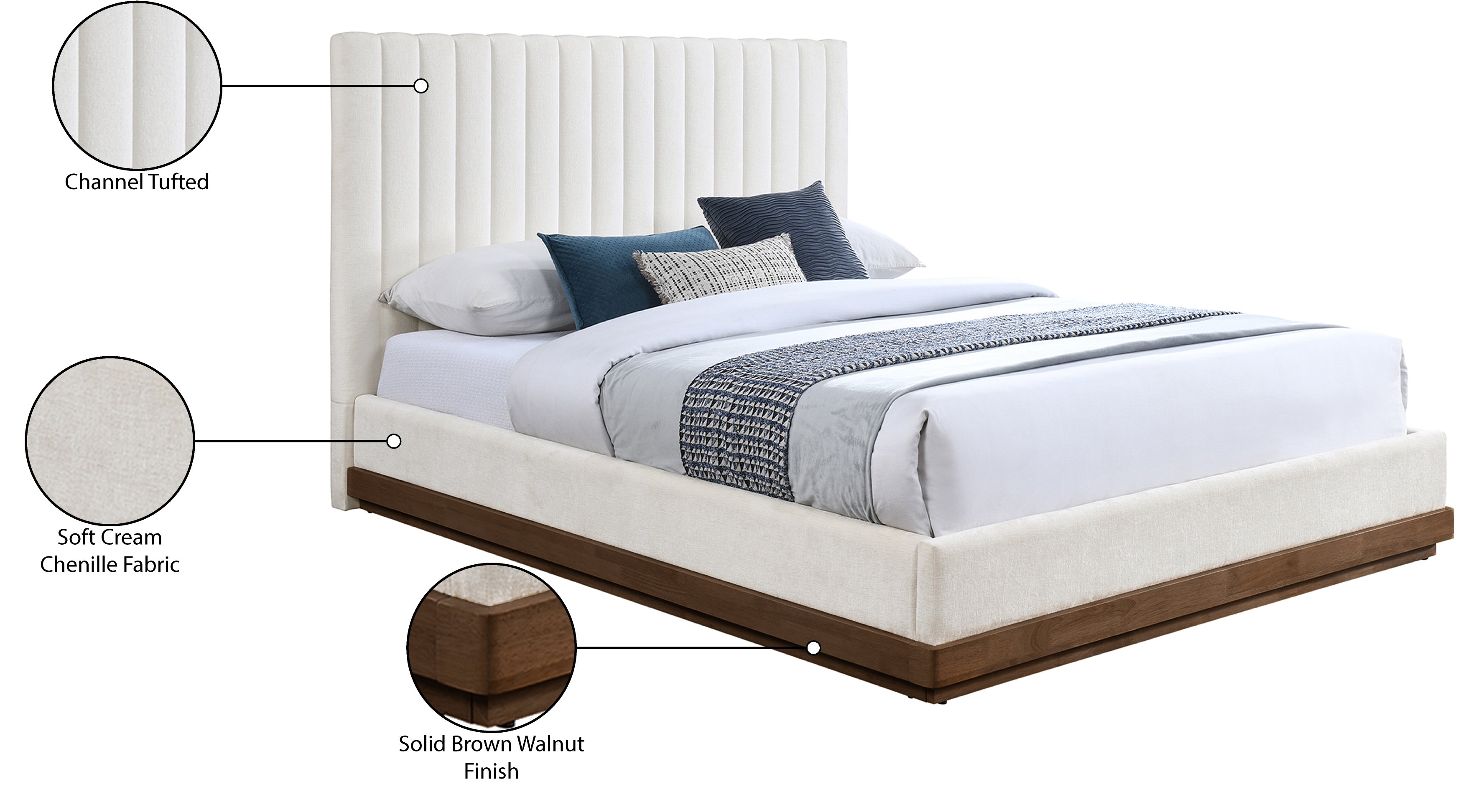 Bring a soft and inviting feel to your bedroom with the Emmet cream chenille upholstered king bed, featuring a plush channel-tufted headboard. A sturdy solid wood base in a brown walnut finish adds warmth and stability to the design. Its contemporary aesthetic makes it a stylish and comfortable centerpiece for any bedroom.