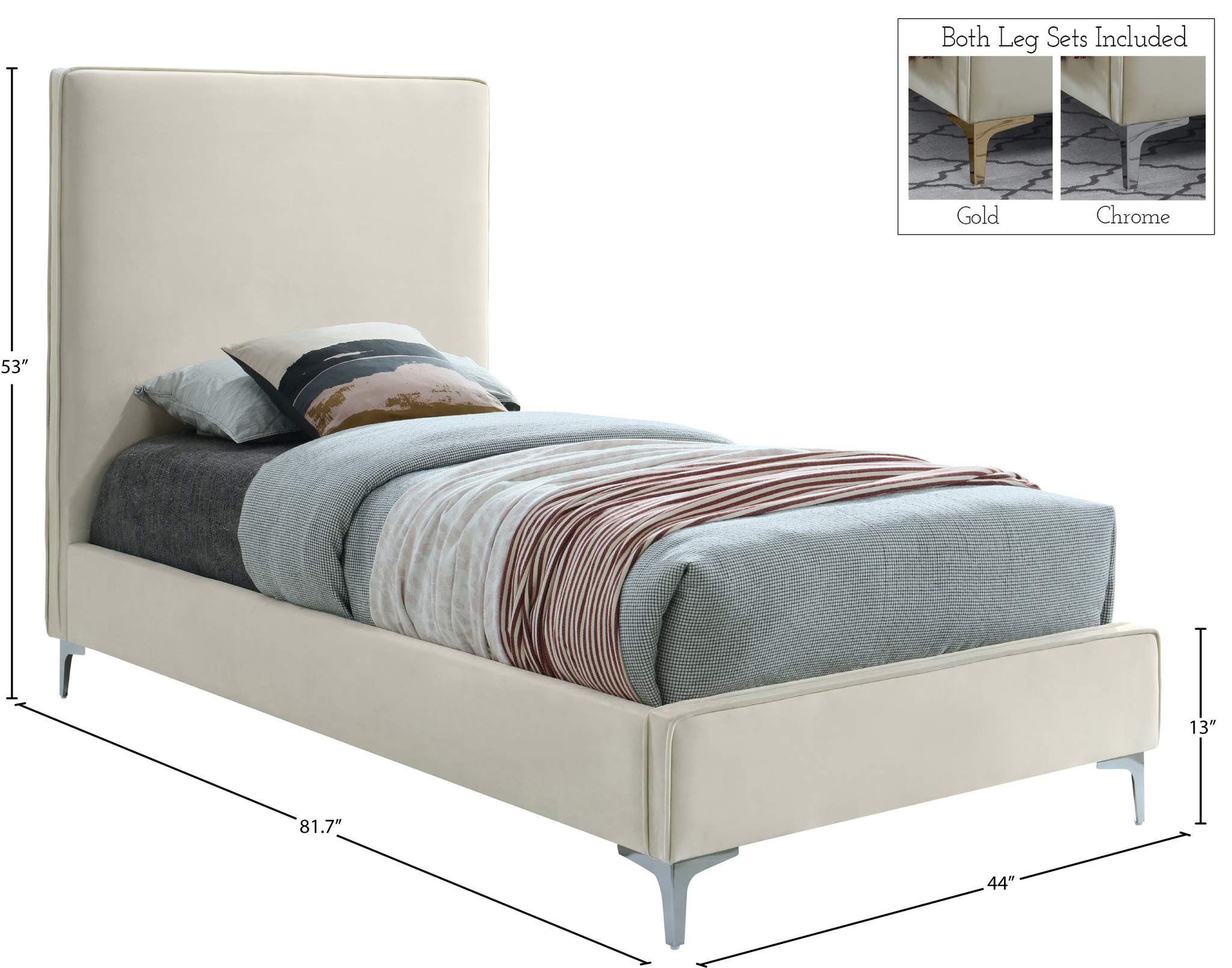 Provide yourself with a few options when you choose the sleek Geri cream velvet twin size bed. The headboard, side rails and footboard are all cushioned and upholstered, with snazzy decorative piping on the headboard and footboard. This bed comes with two different sets of legs so you can match your other decor. Use the gold ones, the chrome ones, or two of each color for a truly contemporary approach.
