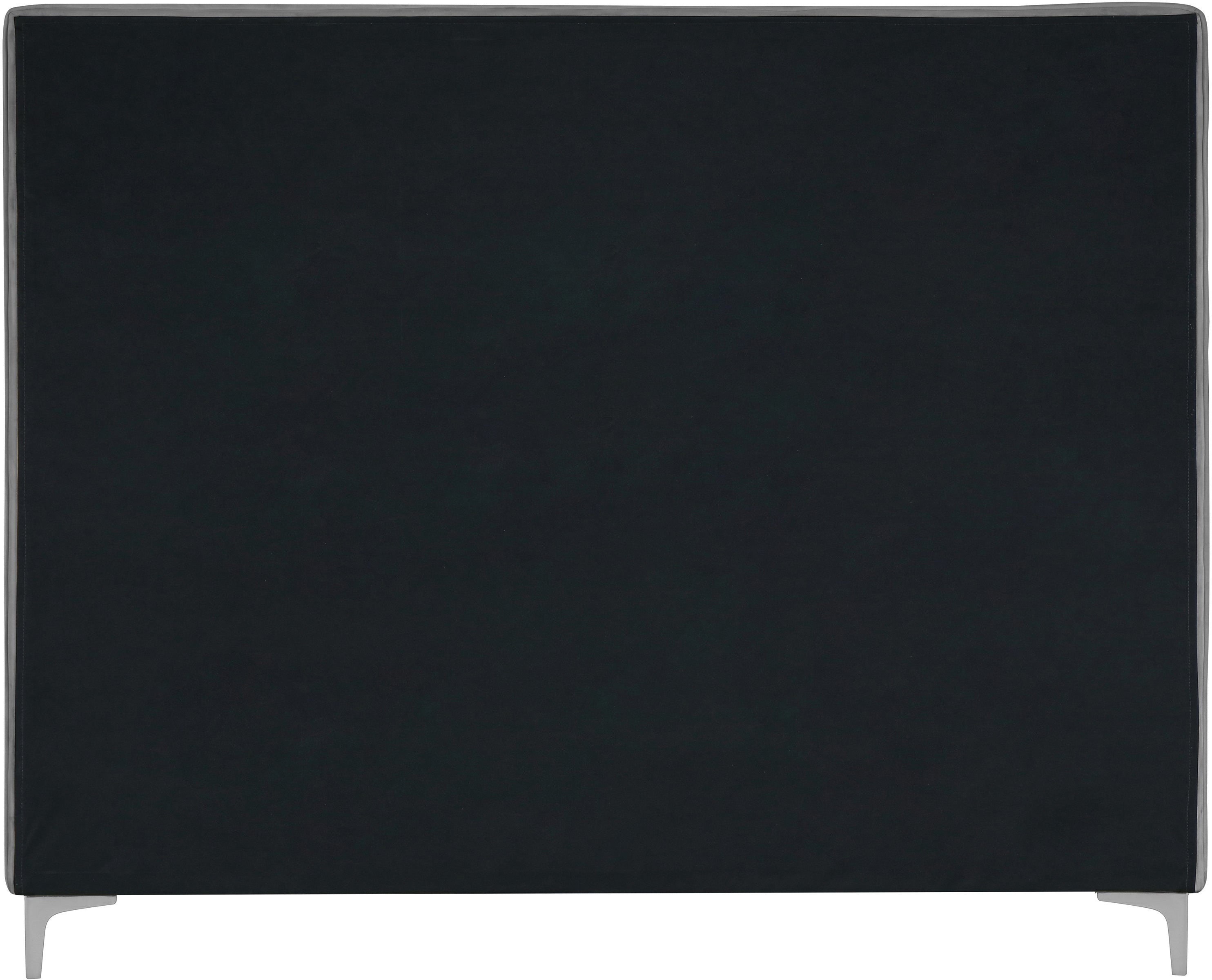 Provide yourself with a few options when you choose the sleek Geri grey velvet queen size bed. The headboard, side rails and footboard are all cushioned and upholstered, with snazzy decorative piping on the headboard and footboard. This bed comes with two different sets of legs so you can match your other decor. Use the gold ones, the chrome ones, or two of each color for a truly contemporary approach.