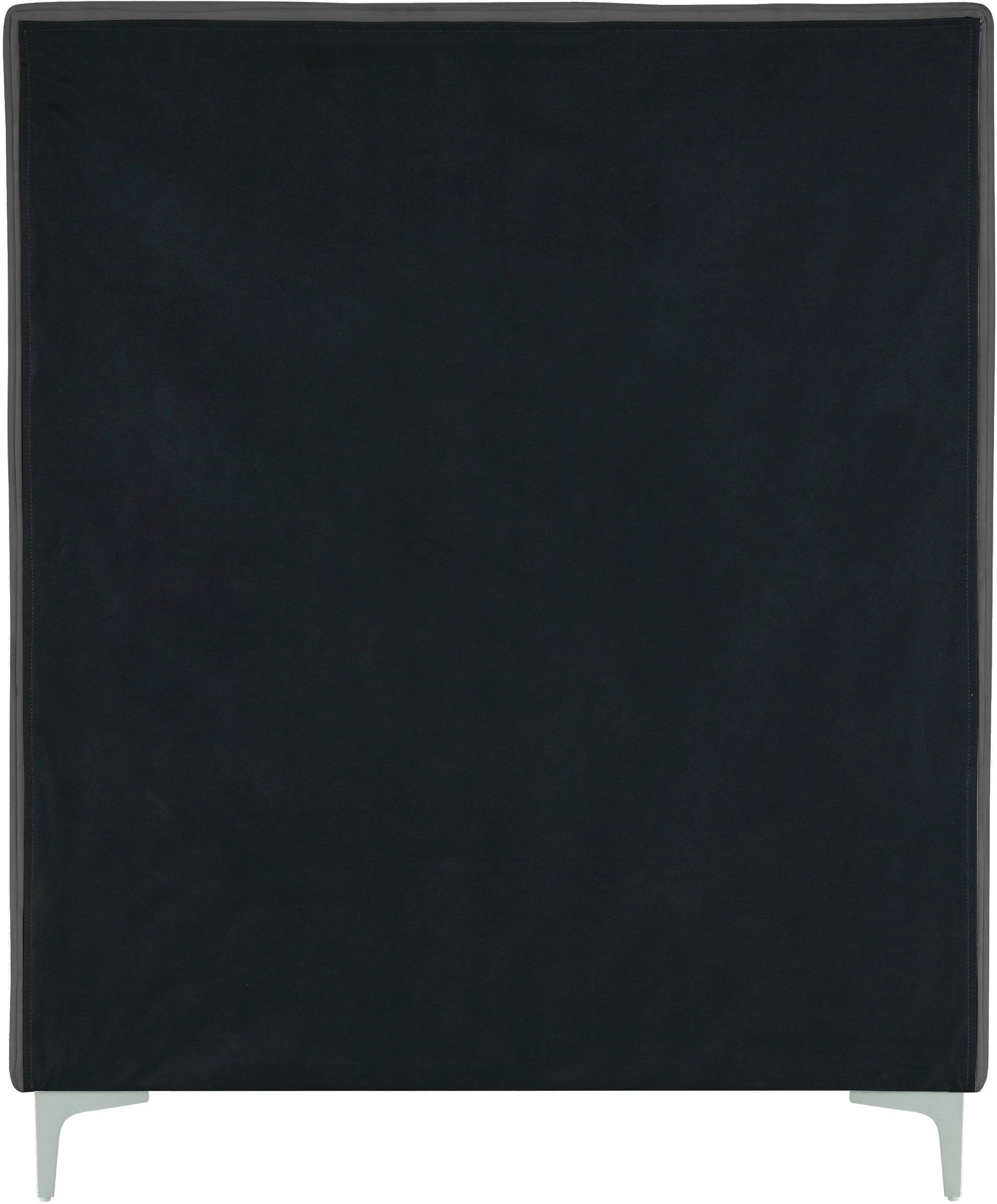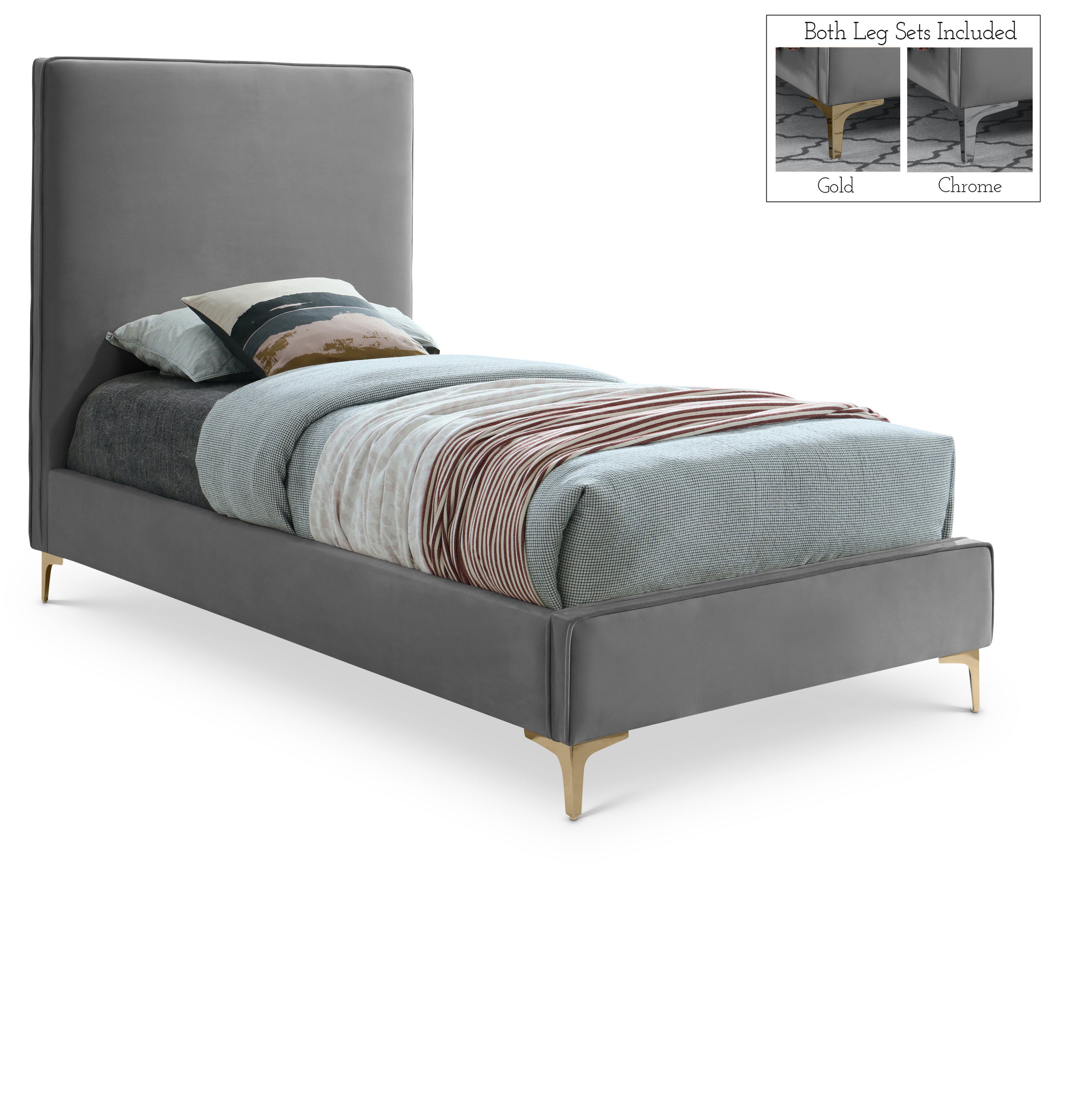 Provide yourself with a few options when you choose the sleek Geri grey velvet twin size bed. The headboard, side rails and footboard are all cushioned and upholstered, with snazzy decorative piping on the headboard and footboard. This bed comes with two different sets of legs so you can match your other decor. Use the gold ones, the chrome ones, or two of each color for a truly contemporary approach.