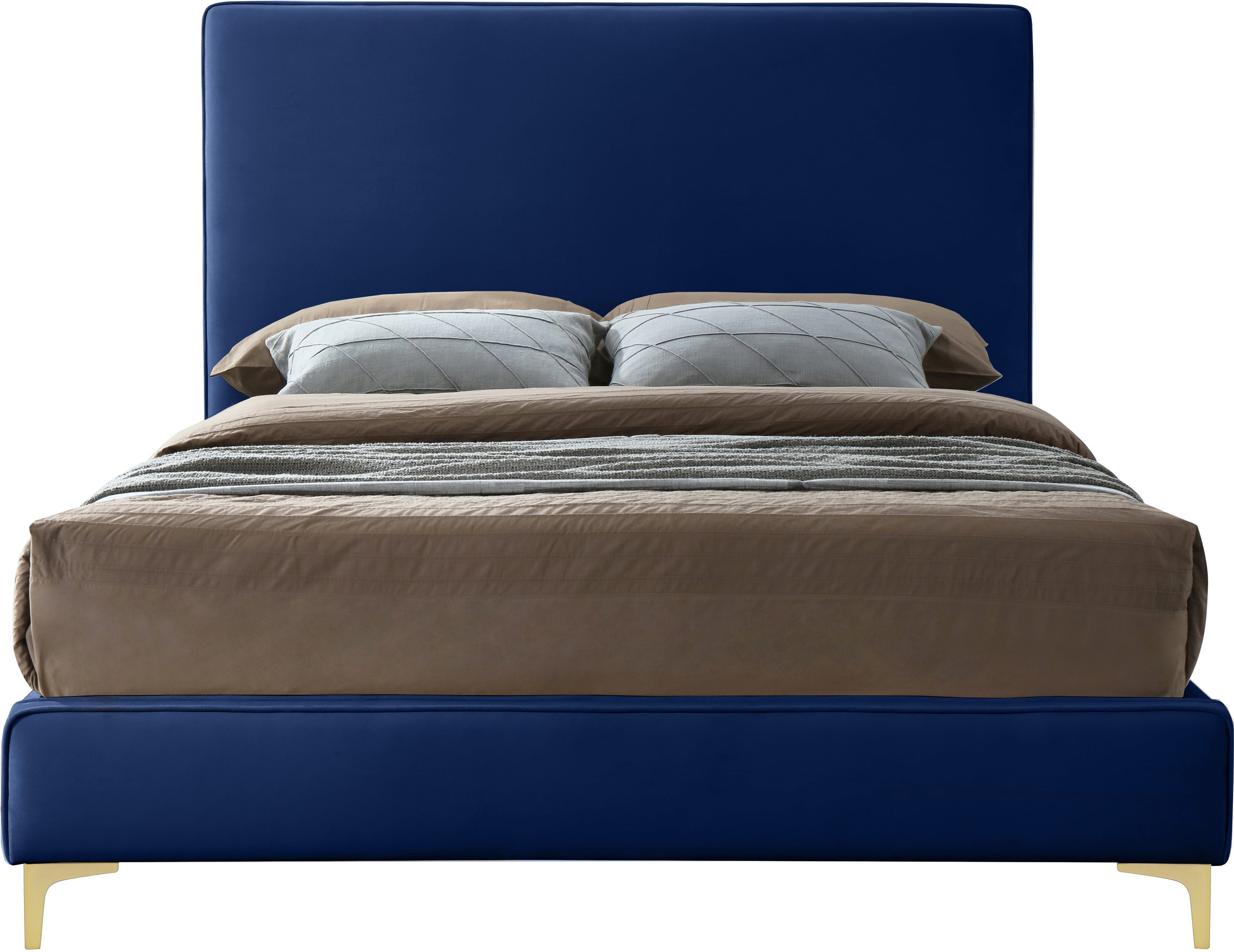 Provide yourself with a few options when you choose the sleek Geri navy velvet queen size bed. The headboard, side rails and footboard are all cushioned and upholstered, with snazzy decorative piping on the headboard and footboard. This bed comes with two different sets of legs so you can match your other decor. Use the gold ones, the chrome ones, or two of each color for a truly contemporary approach.