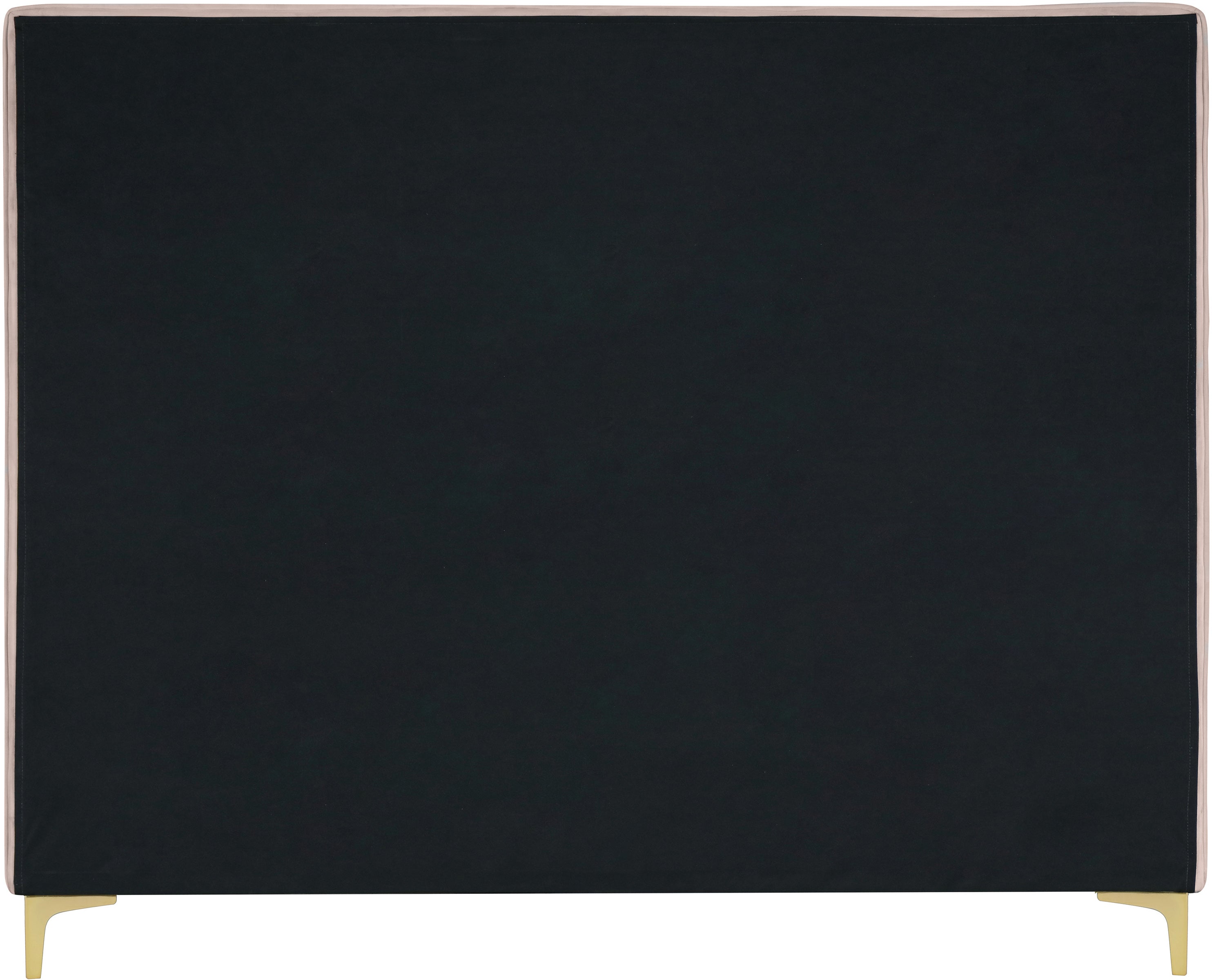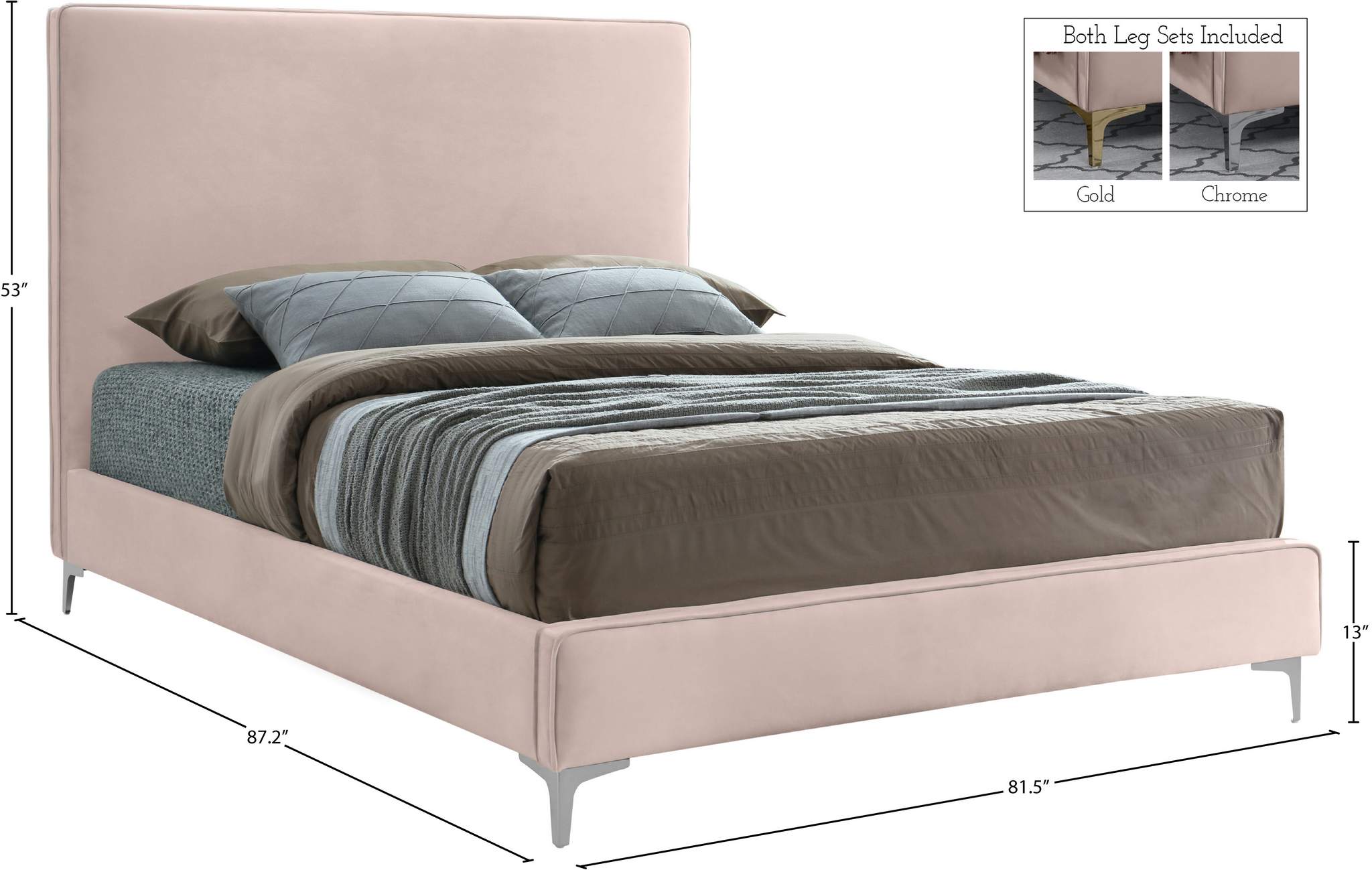Provide yourself with a few options when you choose the sleek Geri pink velvet king size bed. The headboard, side rails and footboard are all cushioned and upholstered, with snazzy decorative piping on the headboard and footboard. This bed comes with two different sets of legs so you can match your other decor. Use the gold ones, the chrome ones, or two of each color for a truly contemporary approach.