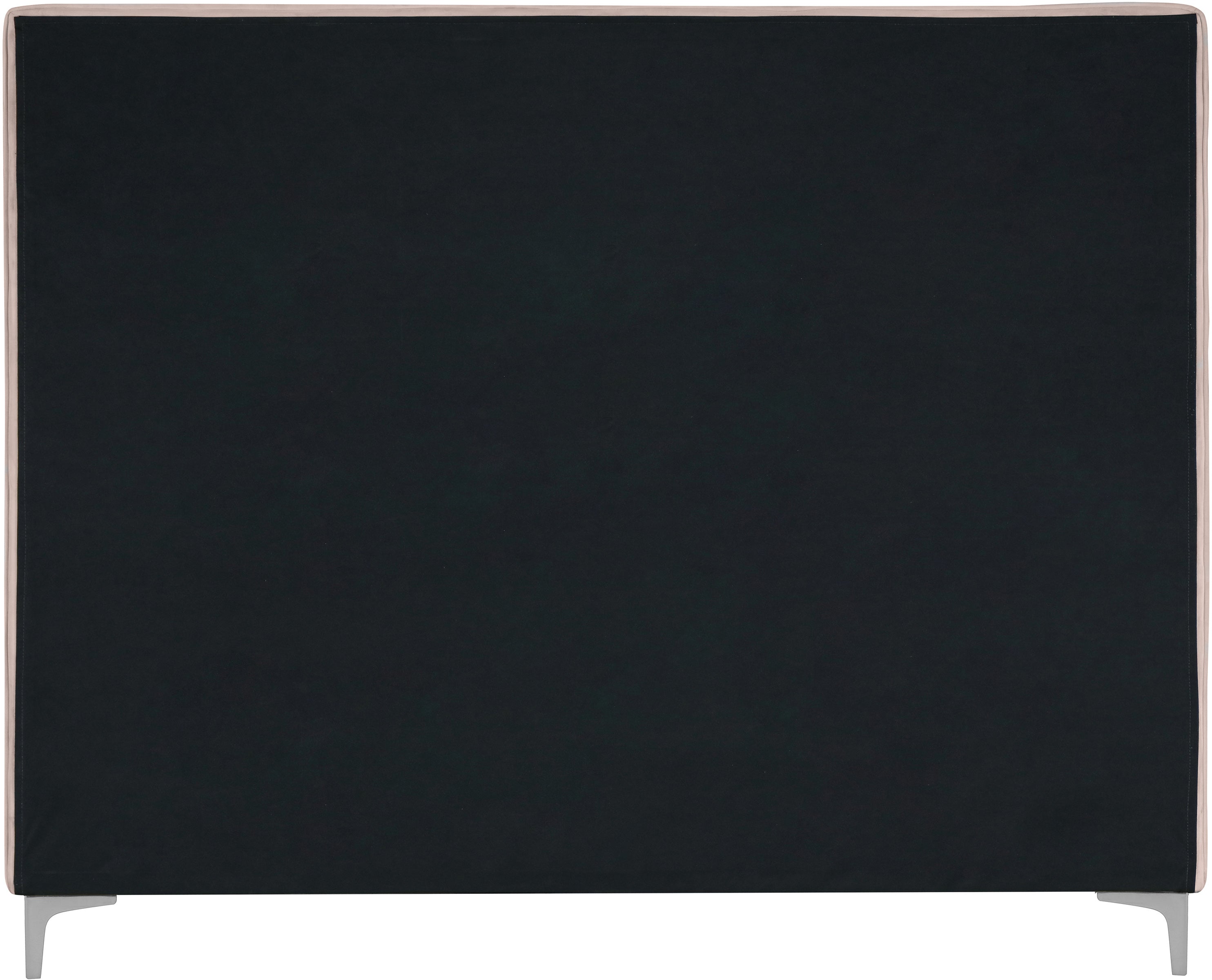 Provide yourself with a few options when you choose the sleek Geri pink velvet queen size bed. The headboard, side rails and footboard are all cushioned and upholstered, with snazzy decorative piping on the headboard and footboard. This bed comes with two different sets of legs so you can match your other decor. Use the gold ones, the chrome ones, or two of each color for a truly contemporary approach.