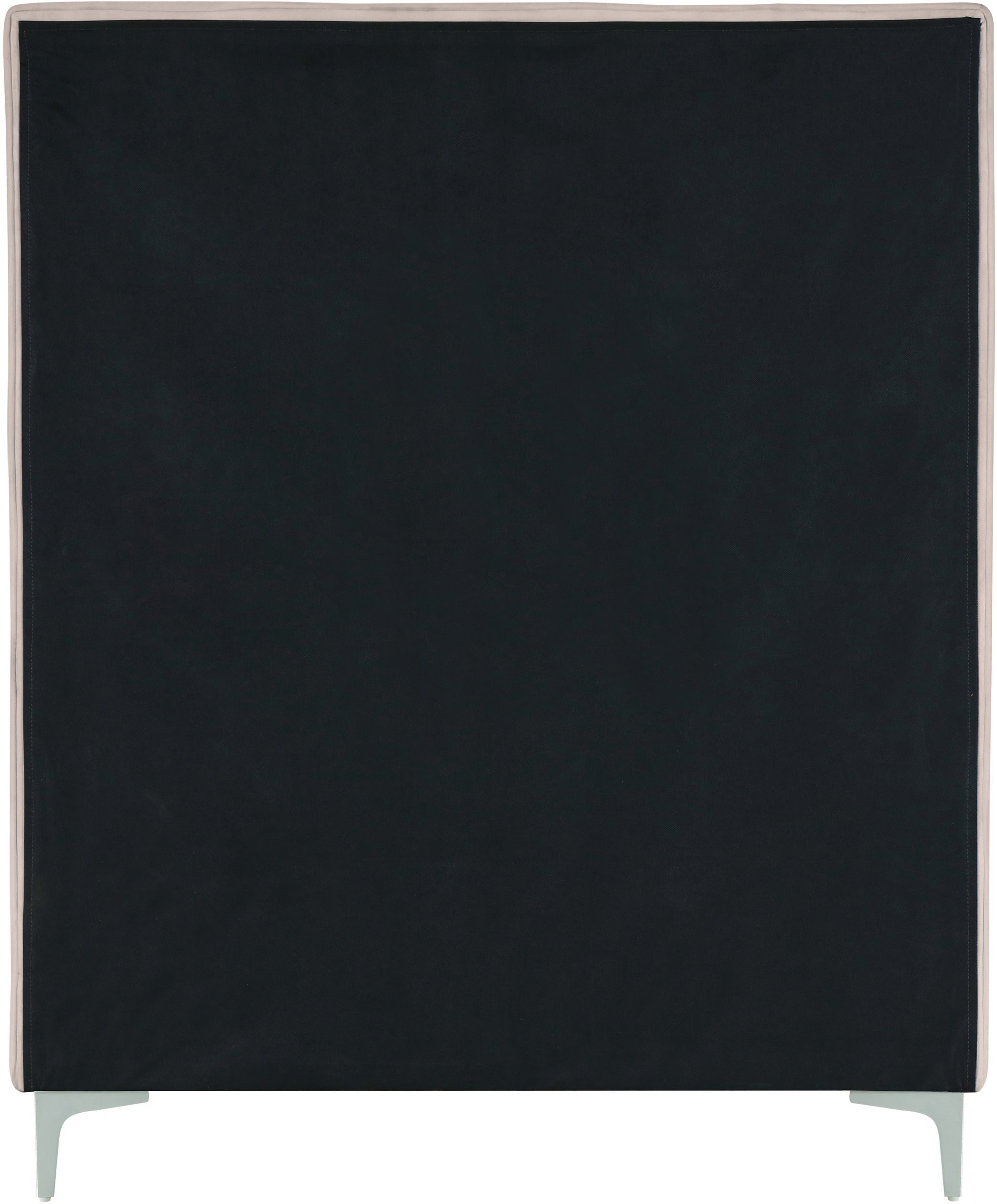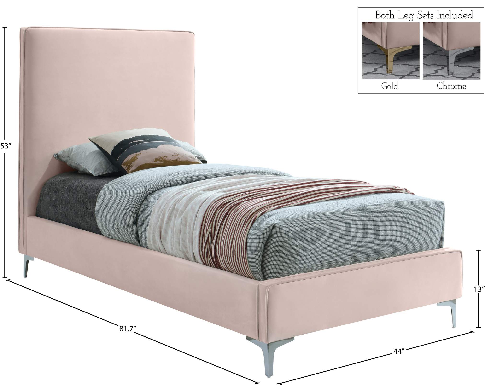 Provide yourself with a few options when you choose the sleek Geri pink velvet twin size bed. The headboard, side rails and footboard are all cushioned and upholstered, with snazzy decorative piping on the headboard and footboard. This bed comes with two different sets of legs so you can match your other decor. Use the gold ones, the chrome ones, or two of each color for a truly contemporary approach.