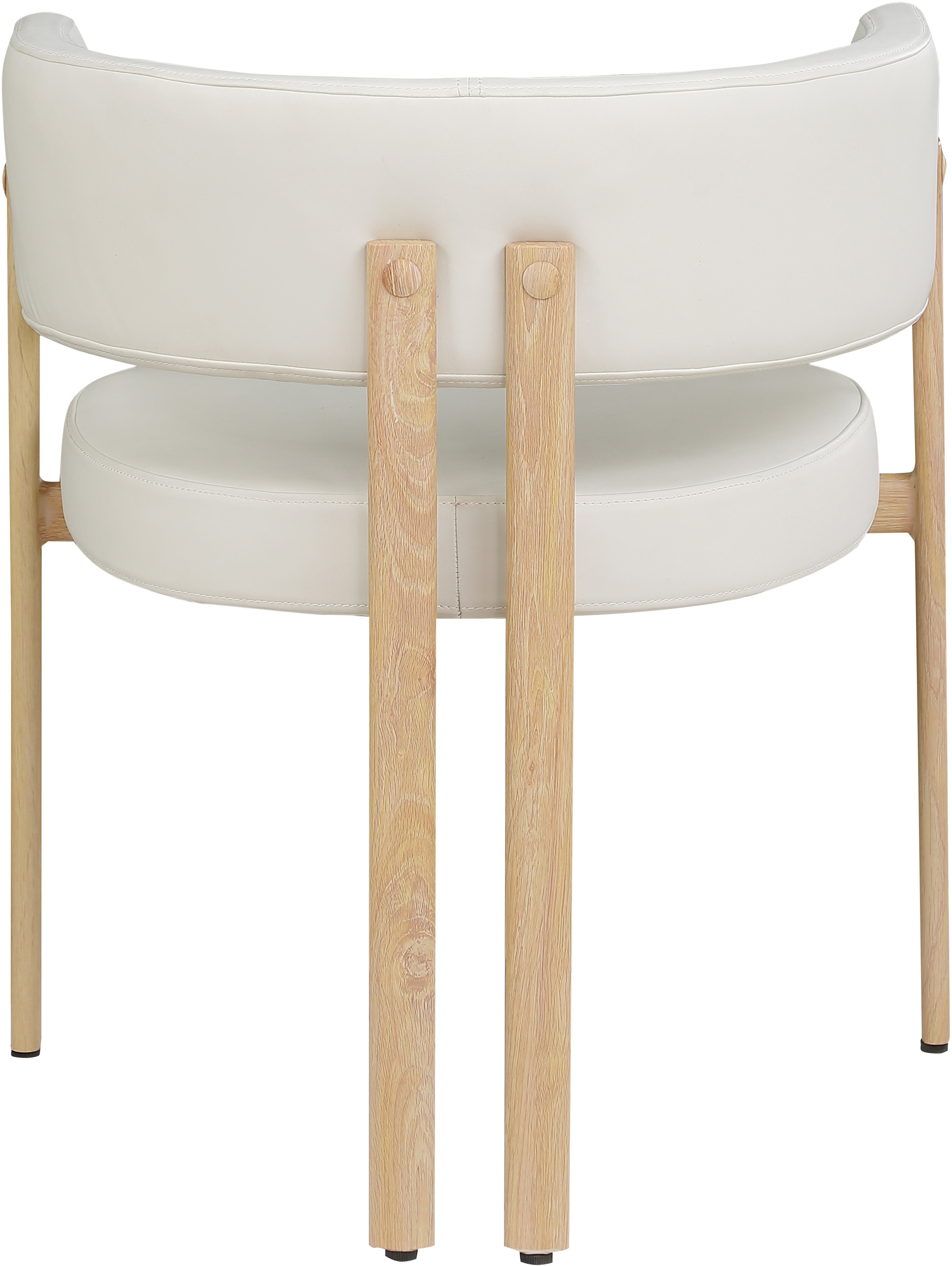 Refresh your dining space with the cream Gideon vegan vegan leather dining chairs. This set of two casual dining chairs have cream vegan leather upholstered seats and backs for a comfortable feel against your body while you enjoy meals big and small. Rounded backs offer a stylish slant while supporting your back at mealtime. The chairs' frames are made from metal but have a natural wood look for added aesthetic appeal and remarkable sturdiness.