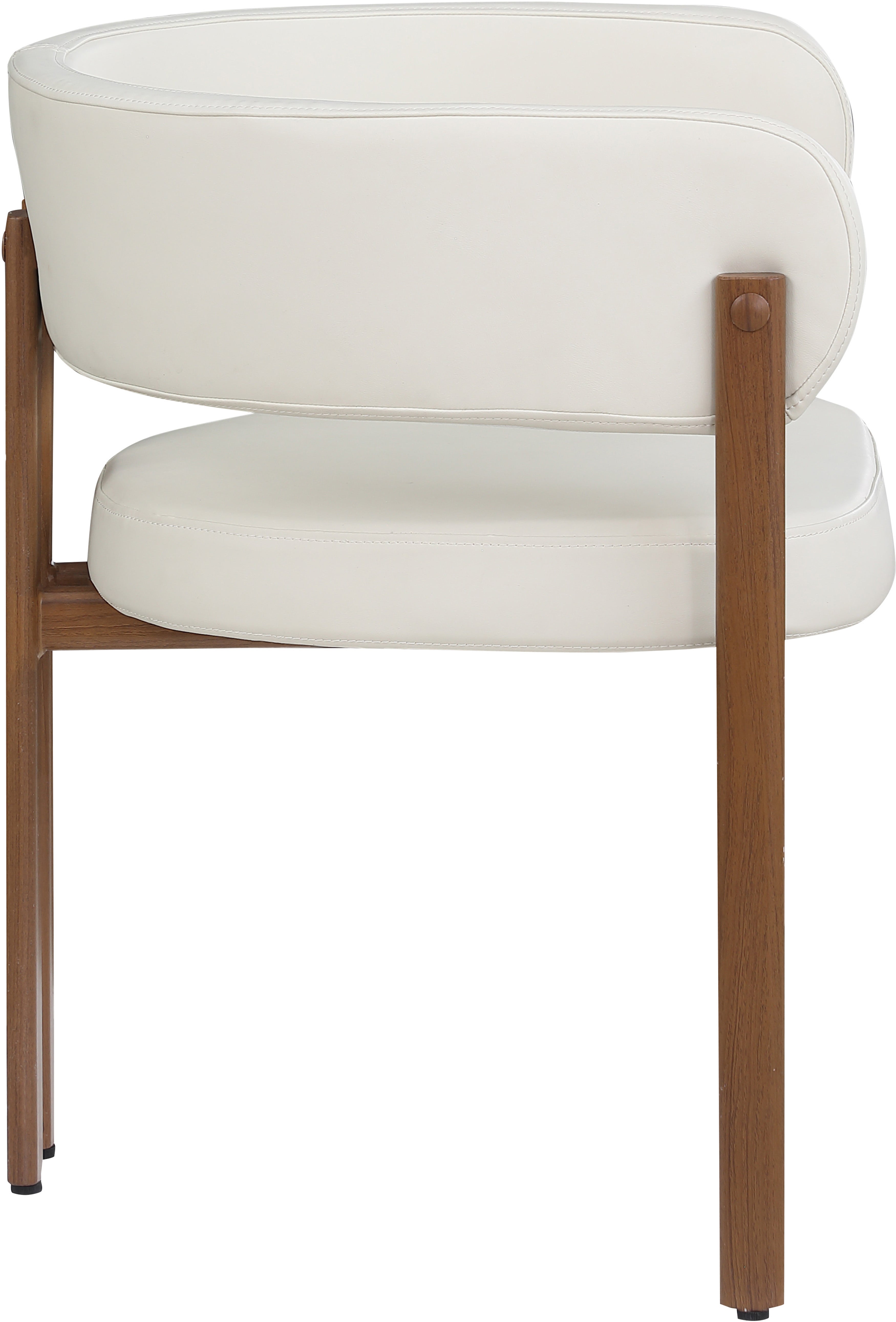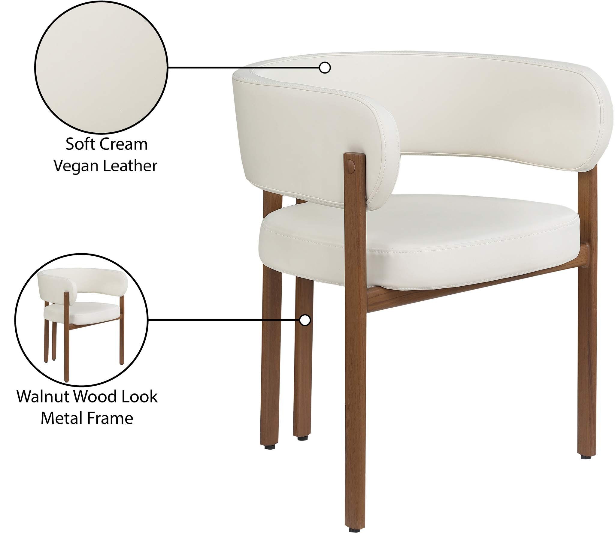 Refresh your dining space with the cream Gideon vegan vegan leather dining chairs. This set of two casual dining chairs have cream vegan leather upholstered seats and backs for a comfortable feel against your body while you enjoy meals big and small. Rounded backs offer a stylish slant while supporting your back at mealtime. The chairs' frames are made from metal but have a natural walnut wood look for added aesthetic appeal and remarkable sturdiness.