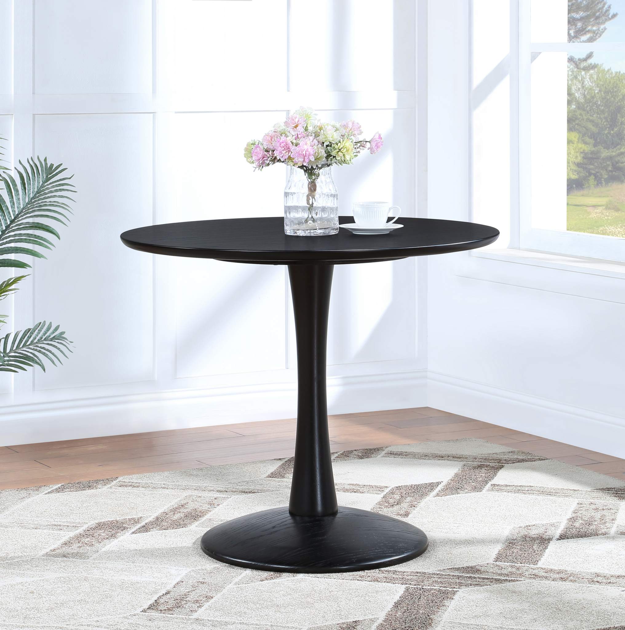 Set the stage for small, intimate dinners for just the two of you with this Holly Black Dining Table. Its cozy yet chic design is ideal for small spaces, featuring a timeless pedestal style that offers ample legroom for comfortable dining. This elegant and sleek table comes in a rich black finish, making it a great addition to modern dining spaces and eat-in kitchens. Constructed with solid wood, oak veneer, and natural wood grain variation, it has a substantial feel, while its midcentury modern design elements ensure it stands out.