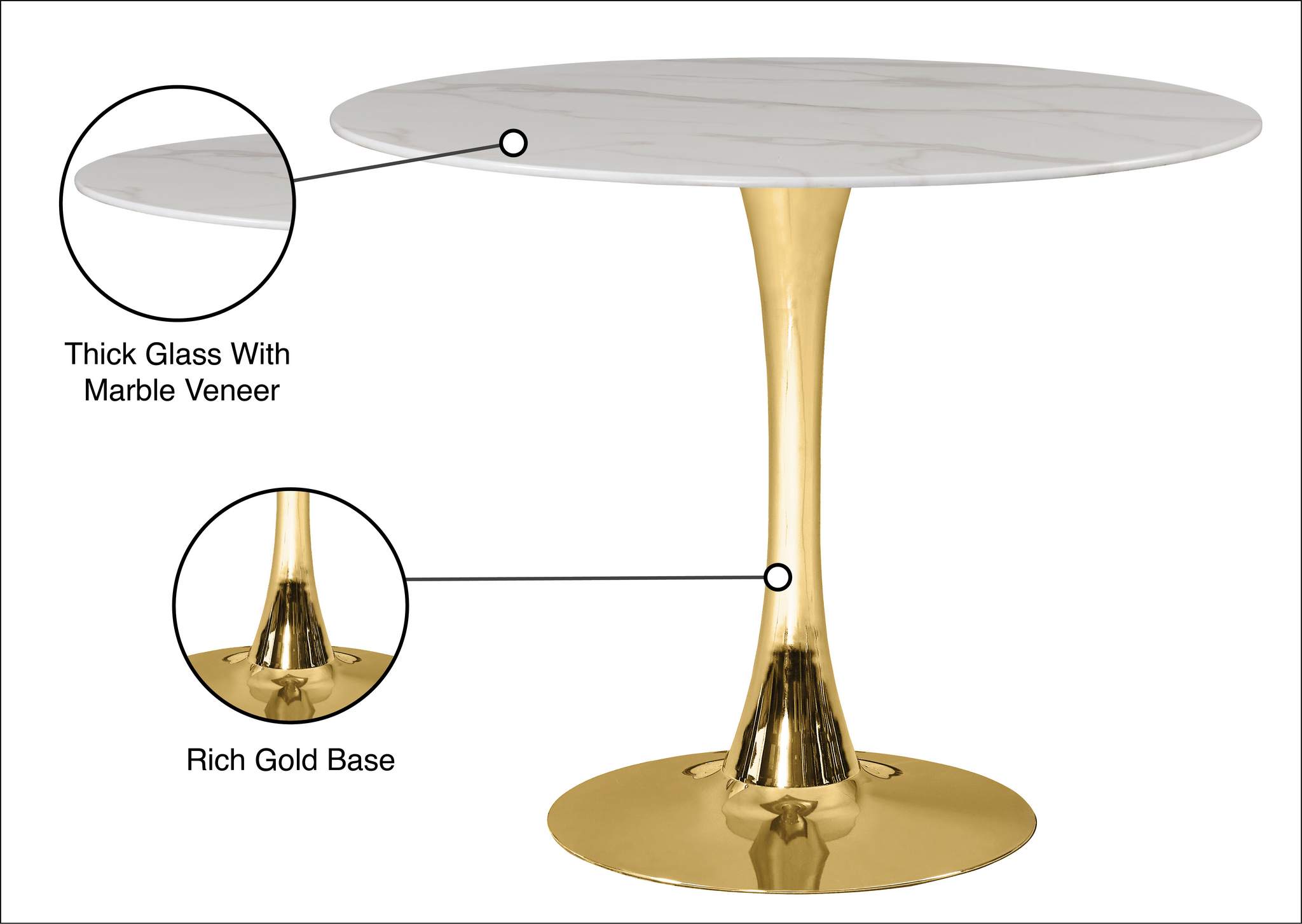 Add the Holly 36" dining table to your kitchen, den or office to enjoy its petite size and elegant lines. The tabletop is made of 10MM thick glass with a glamorous marble veneer. A shiny gold pedestal base adds to the appeal of this gorgeous piece, and lets it fit into smaller spaces comfortably. Choose from a wide array of available matching chair styles to complete your contemporary style decor.