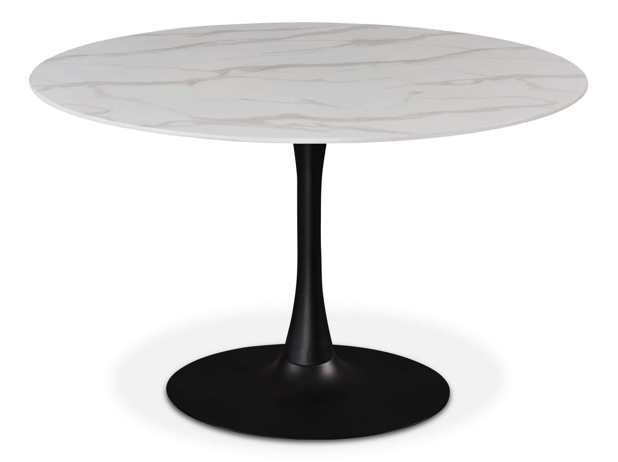 Add the Holly 48" dining table to your kitchen, den or office to enjoy its petite size and elegant lines. The tabletop is made of 10MM thick glass with a glamorous marble veneer. A rich matte black pedestal base adds to the appeal of this gorgeous piece, and lets it fit into smaller spaces comfortably. Choose from a wide array of available matching chair styles to complete your contemporary style decor.