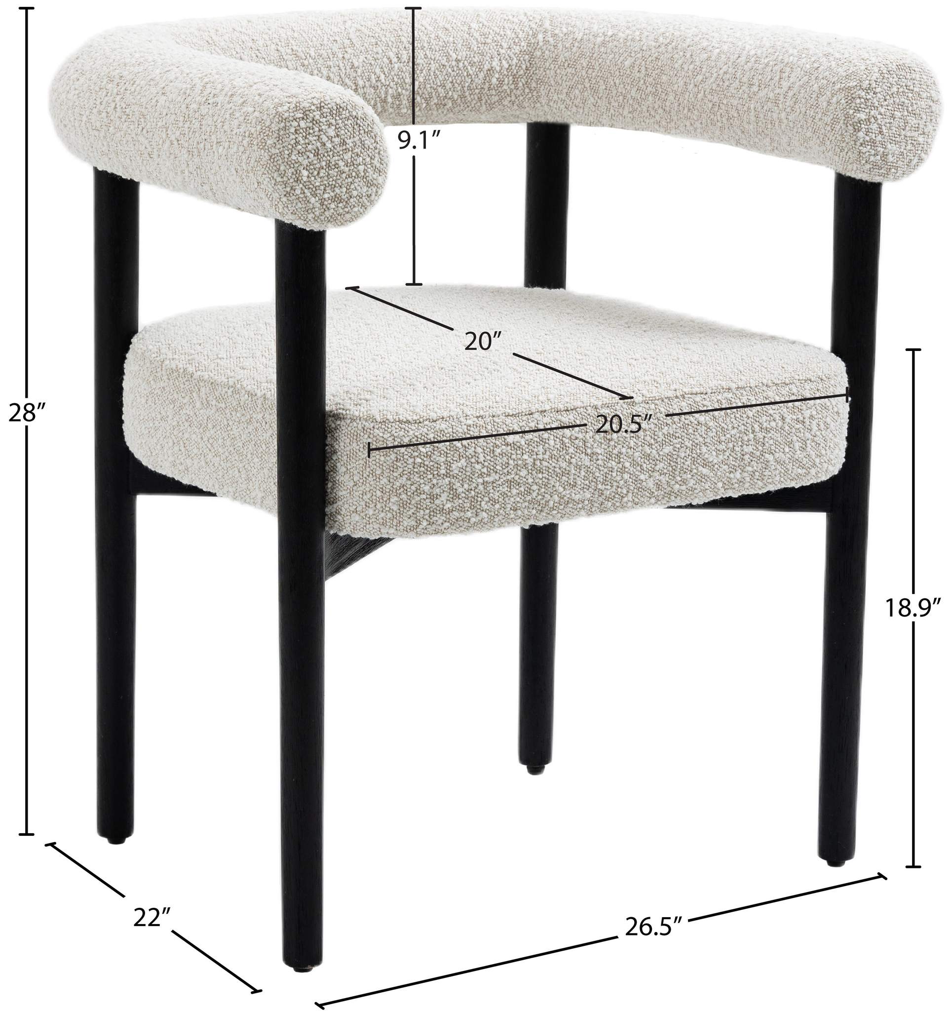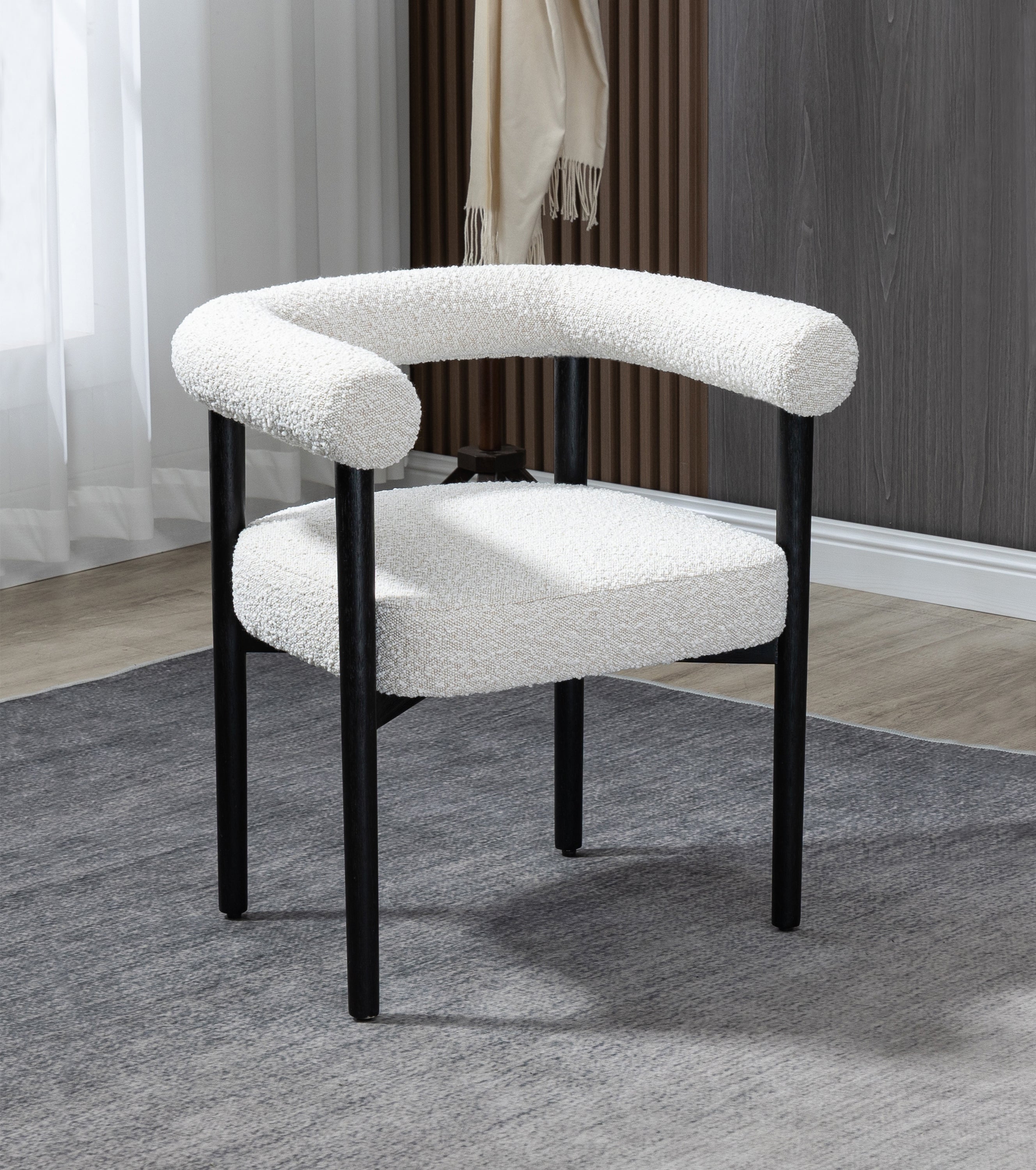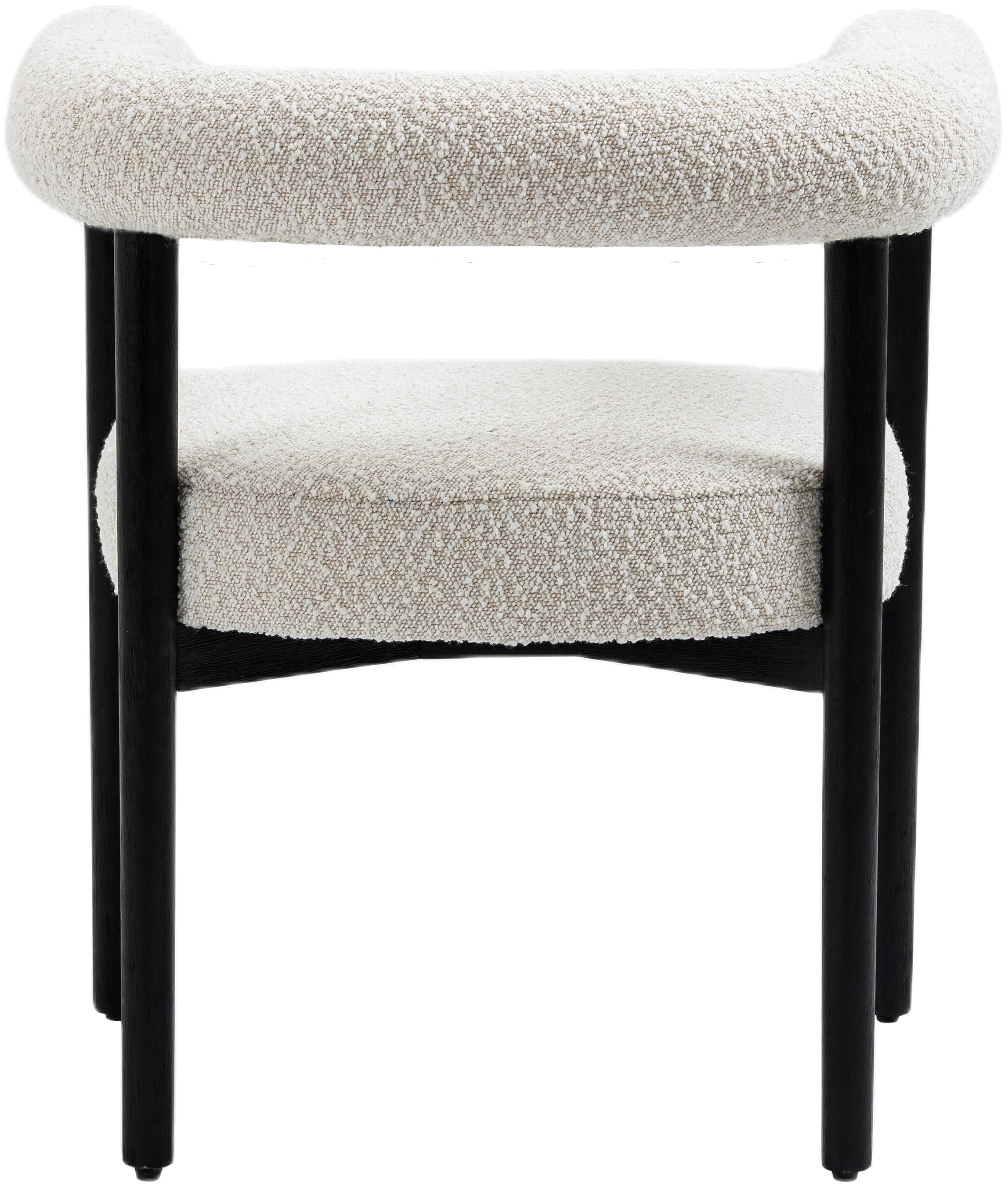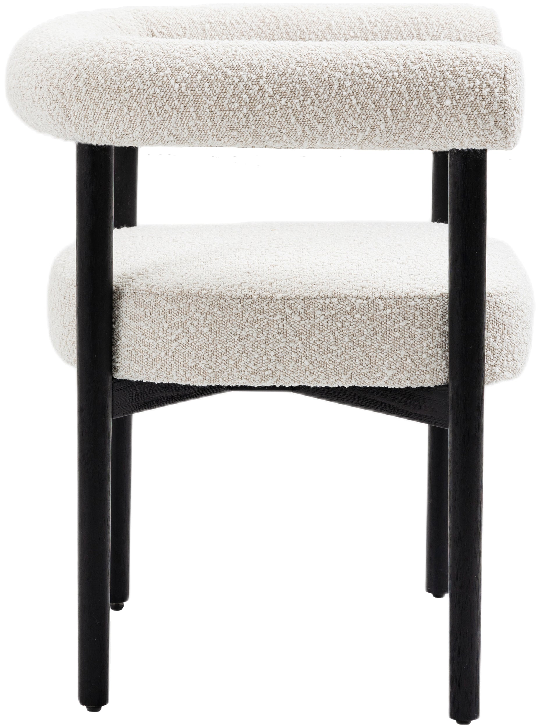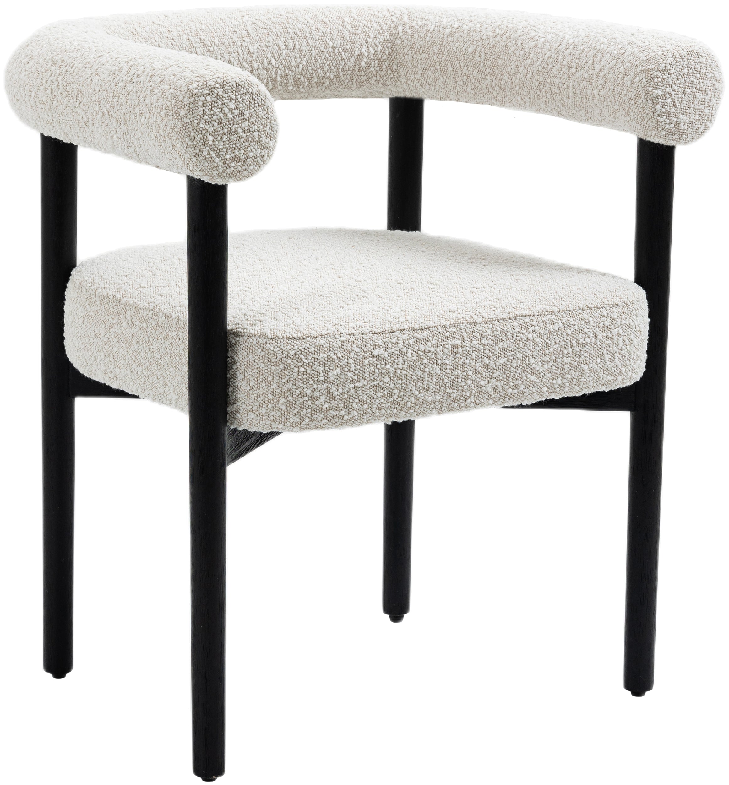Perfect the look of your dining room with this Hyatt boucle fabric dining chair. Add two, four, or more of these sumptuously appointed dining chairs to the mix to add an elegant vibe for meals large and small. The solid wood chair frame is finished in black to coordinate with the sophisticated feel of the rich cream boucle fabric upholstery. A curvy back drives home the modern feel of this lovely chair.