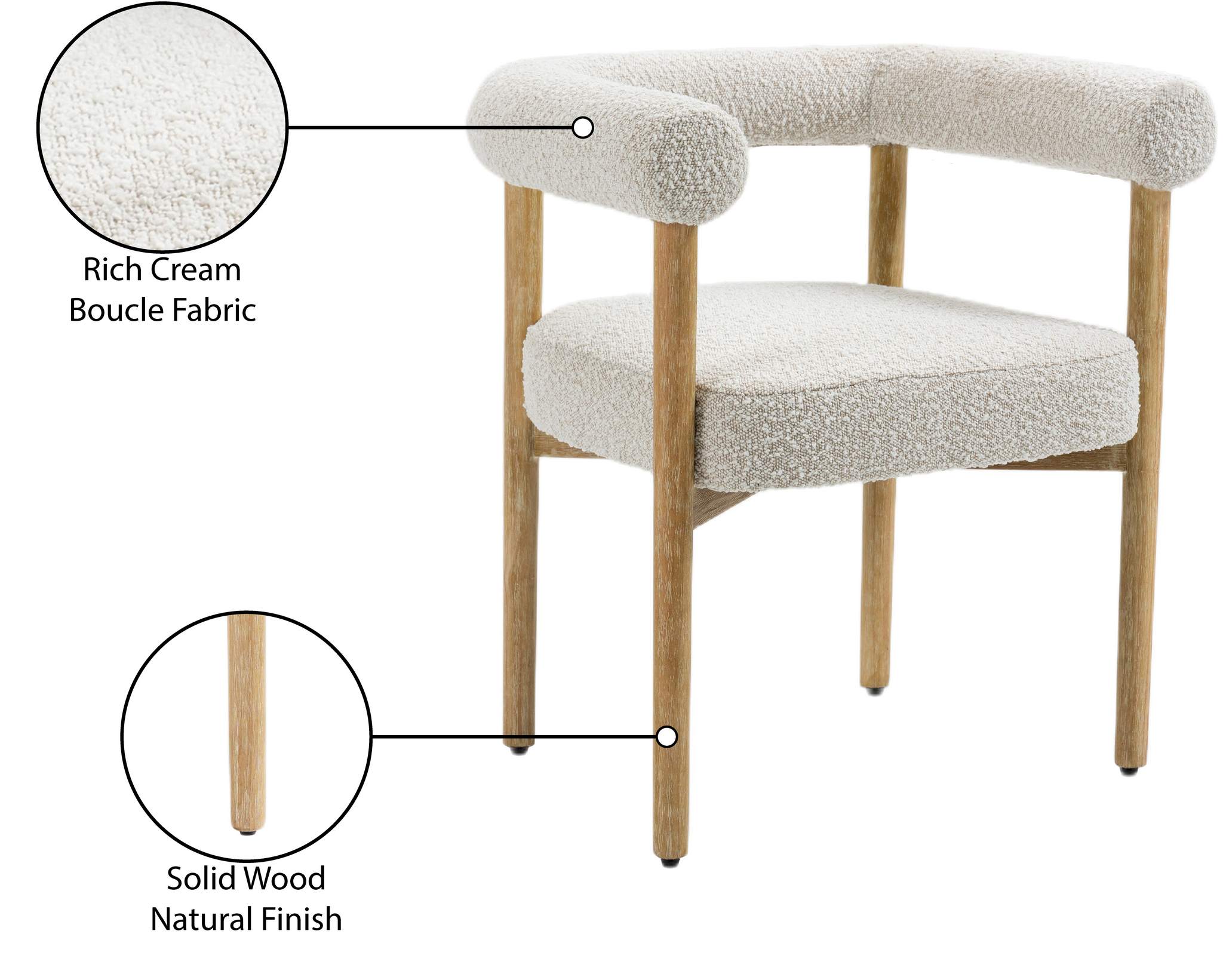 Perfect the look of your dining room with this Hyatt boucle fabric dining chair. Add two, four, or more of these sumptuously appointed dining chairs to the mix to add an elegant vibe for meals large and small. The solid wood chair frame with a natural finish coordinates with the sophisticated feel of the rich cream boucle fabric upholstery. A curvy back drives home the modern feel of this lovely chair.