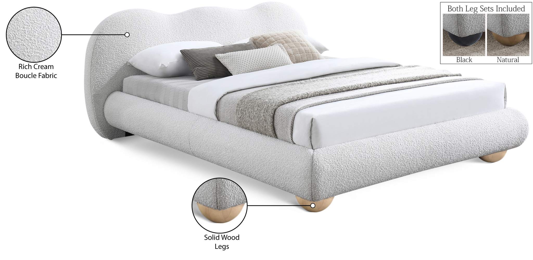 Escape to a haven of restful nights and luxurious mornings with the Hyde Boucle Fabric Bed, a versatile centerpiece that caters to your unique style and comfort preferences. The bed is enveloped in rich cream boucle fabric, its sumptuous texture adding depth and dimension to your bedroom. This captivating material creates a striking contrast against lighter bedding and decor, ensuring your bed remains a stylish focal point regardless of your chosen aesthetic. The appeal doesn't stop at beauty. It offers the unique option of both natural finish and black finish solid wood legs, included with each bed. This allows you to effortlessly adapt the bed to your existing decor or even transform its entire look with a simple switch. Unwind, relax, and experience the true meaning of blissful sleep with the Hyde Boucle Full-sized Fabric Bed.
