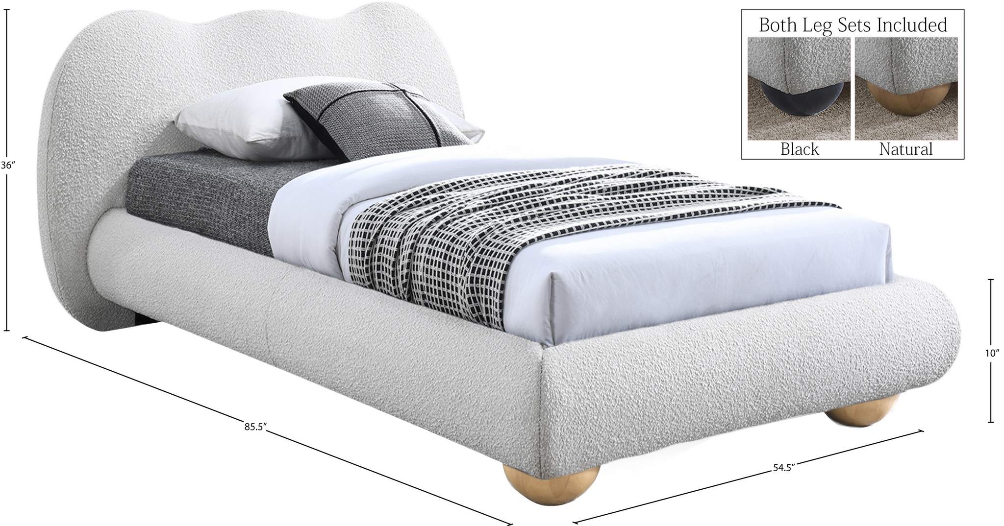 Escape to a haven of restful nights and luxurious mornings with the Hyde Boucle Fabric Bed, a versatile centerpiece that caters to your unique style and comfort preferences. The bed is enveloped in rich cream boucle fabric, its sumptuous texture adding depth and dimension to your bedroom. This captivating material creates a striking contrast against lighter bedding and decor, ensuring your bed remains a stylish focal point regardless of your chosen aesthetic. The appeal doesn't stop at beauty. It offers the unique option of both natural finish and black finish solid wood legs, included with each bed. This allows you to effortlessly adapt the bed to your existing decor or even transform its entire look with a simple switch. Unwind, relax, and experience the true meaning of blissful sleep with the Hyde Boucle Twin-sized Fabric Bed.