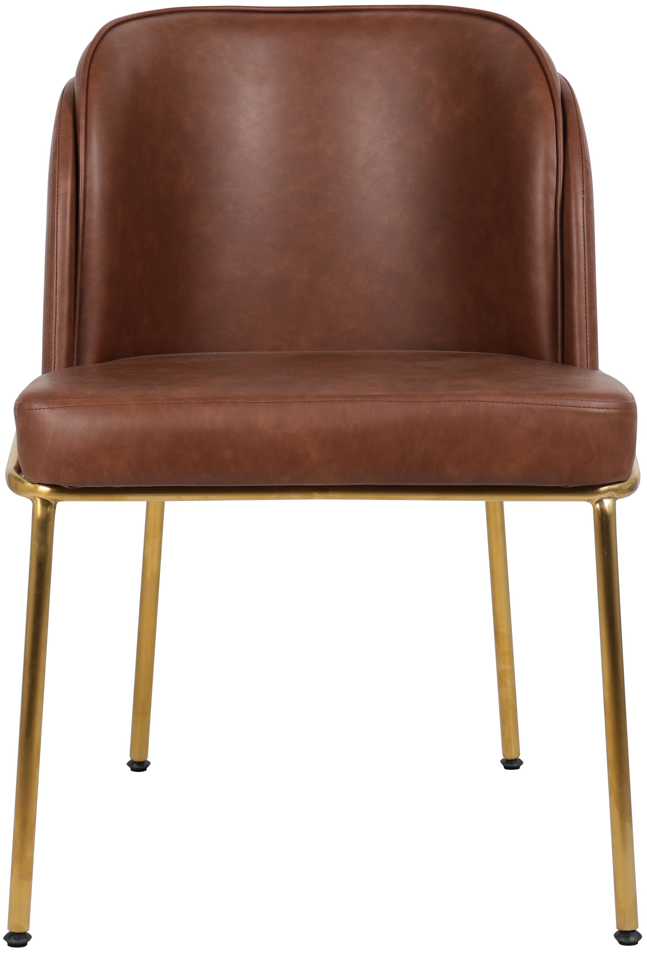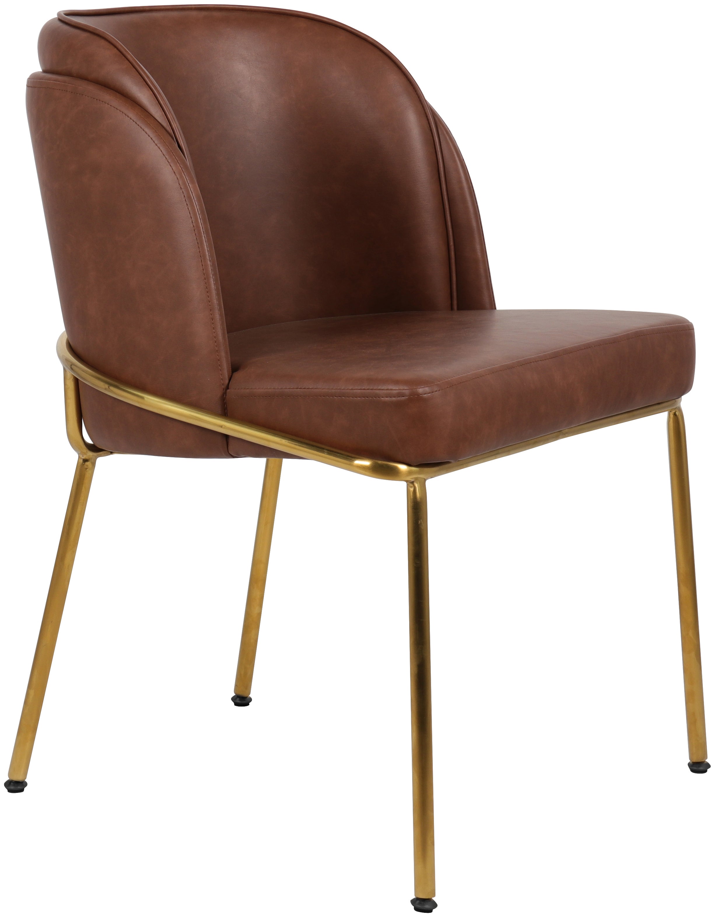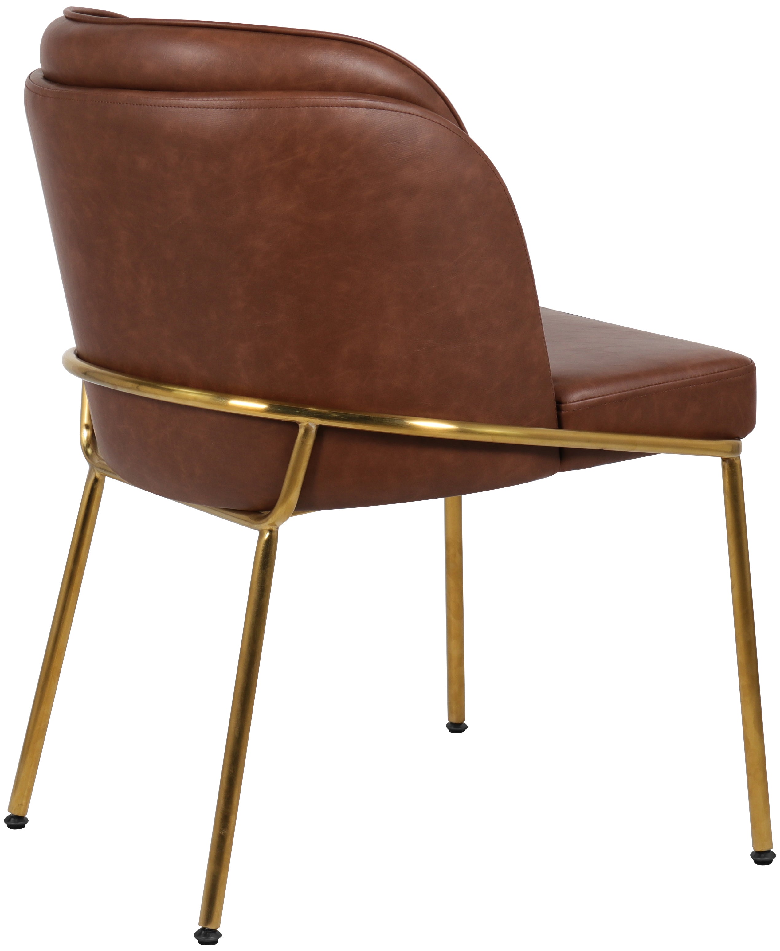 Give your dining room an upscale look with this Jagger vegan leather dining chair. The seat and back of this lovely chair comes upholstered in brown vegan leather material that looks so genuine, only you will know it's not the real thing. Brushed gold iron legs on this chair lend it an upscale look and adds to its overall contemporary panache.